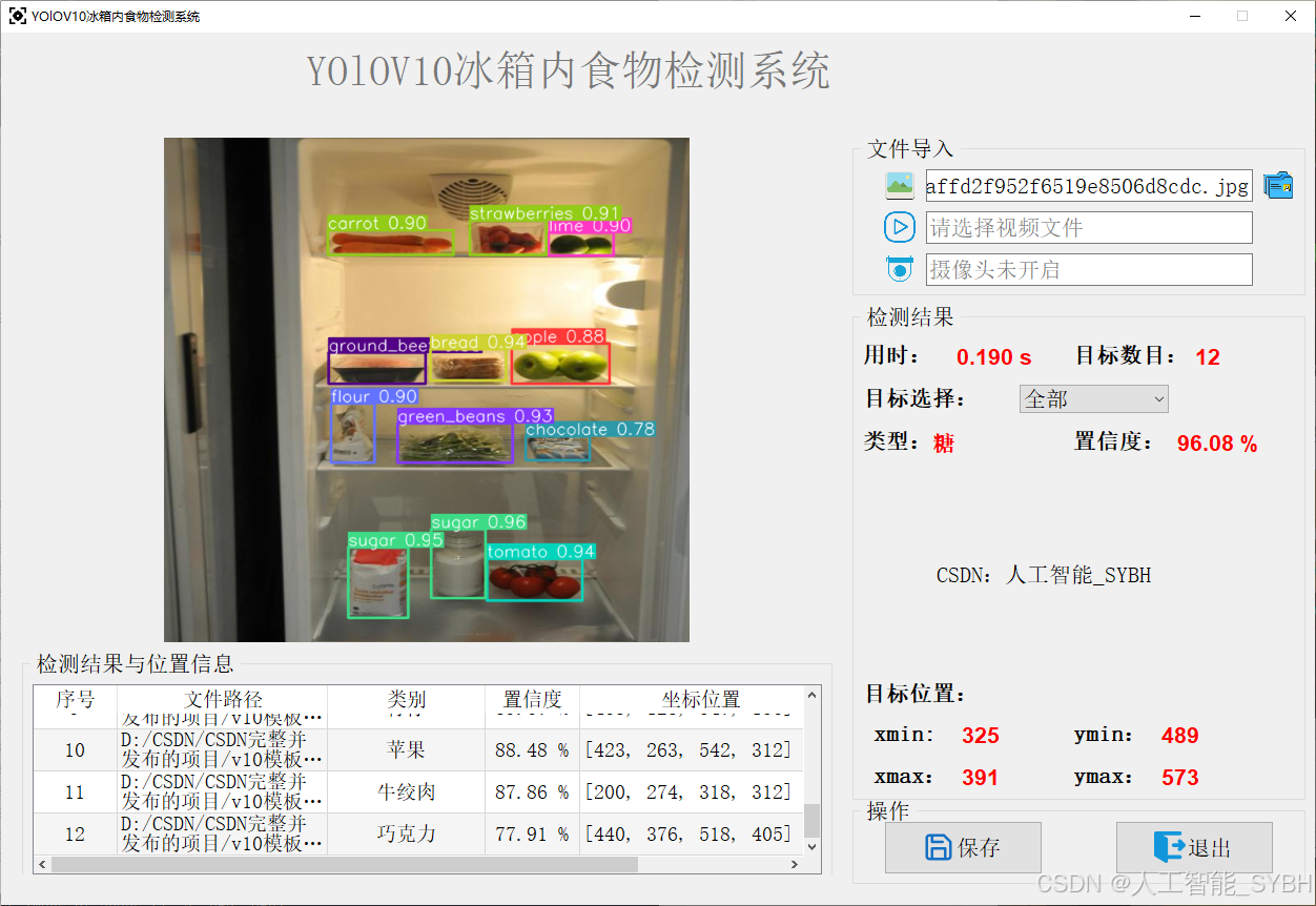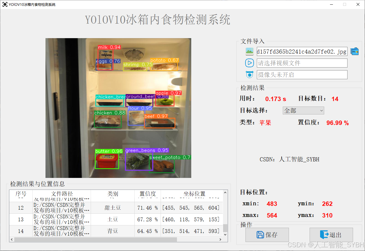 本文基于YOLOv10深度学习框架,通过3050张图片,训练了一个食物检测标检测模型,准确率高达97%。并基于此模型开发了一款带UI界面的食物检测系统,可用于实时检测场景中的食物,更方便进行功能的展示。该系统是基于python与PyQT5开发的,支持图片、视频以及摄像头进行实时目标检测,并保存检测结果。