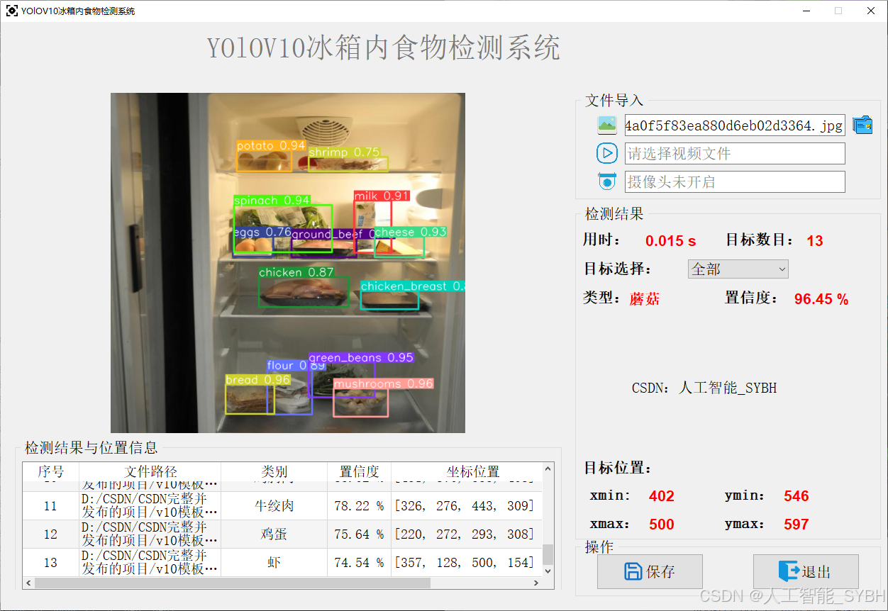 本项目基于YOLOv10深度学习算法,开发了一种冰箱内食物检测系统。该系统能够实时识别和定位冰箱内的30种常见食物,提供了高效的食物管理和监控方案。通过利用YOLOv10的强大性能,该系统不仅可以快速准确地检测冰箱内的食物种类,还能在不同环境下稳定运行,满足智能家居环境中对实时性和精度的高要求。该系统还配备了用户友好的UI界面,用户可以方便地通过图像或视频进行食物检测,查看识别结果。