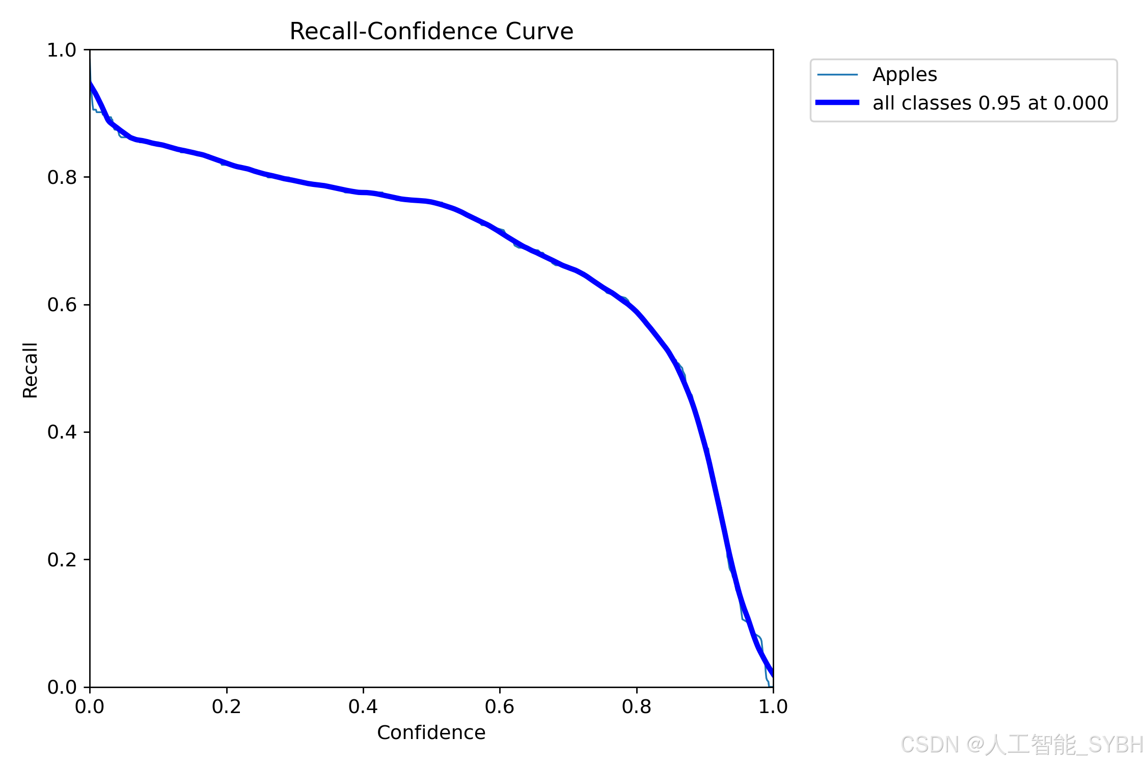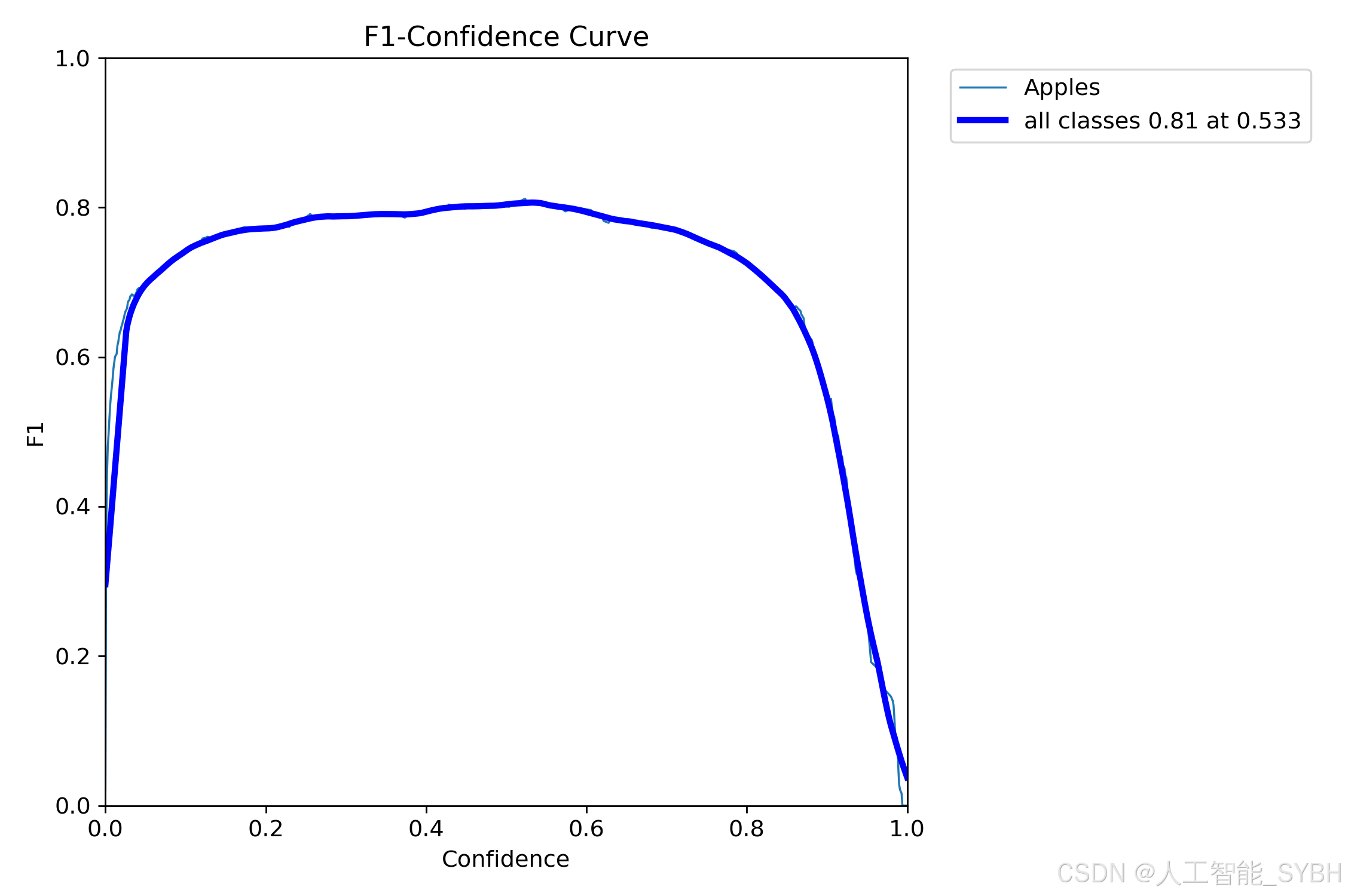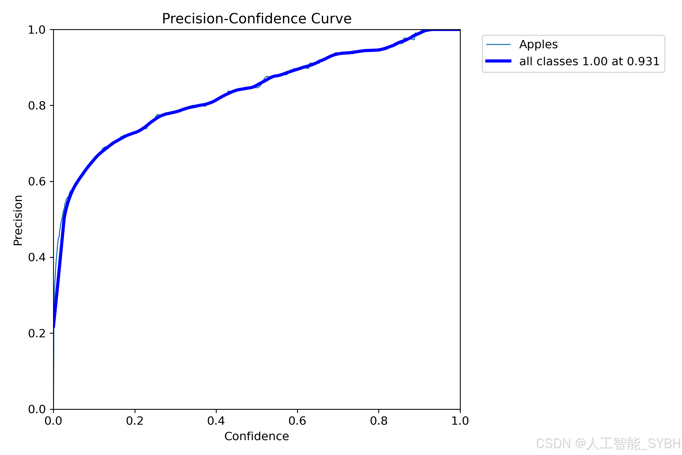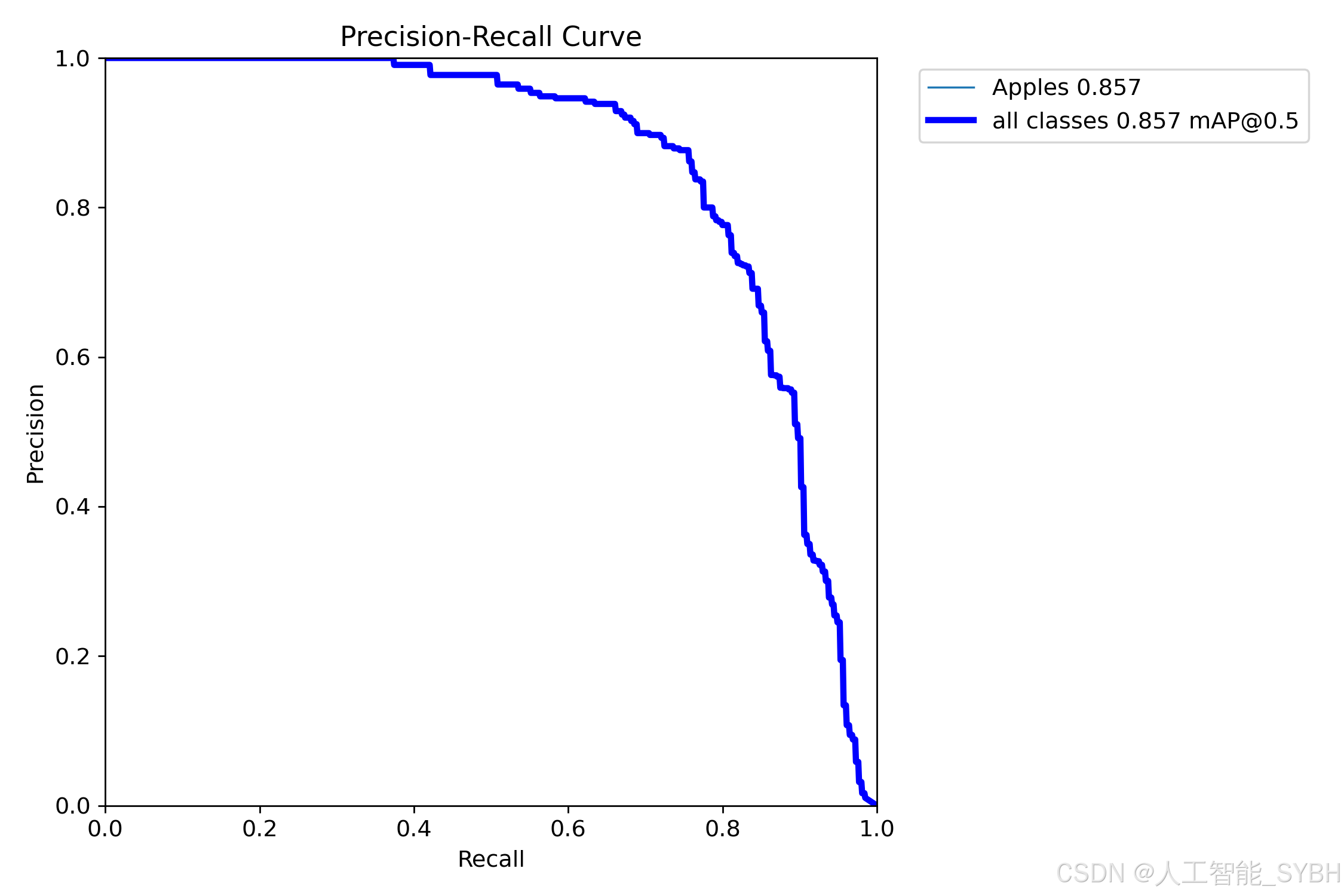 PR曲线体现精确率和召回率的关系,本文训练结果的PR曲线如下。mAP表示Precision和Recall作为两轴作图后围成的面积,m表示平均,@后面的数表示判定iou为正负样本的阈值。mAP@.5:表示阈值大于0.5的平均mAP,苹果的mAP@0.5已经达到0.857。