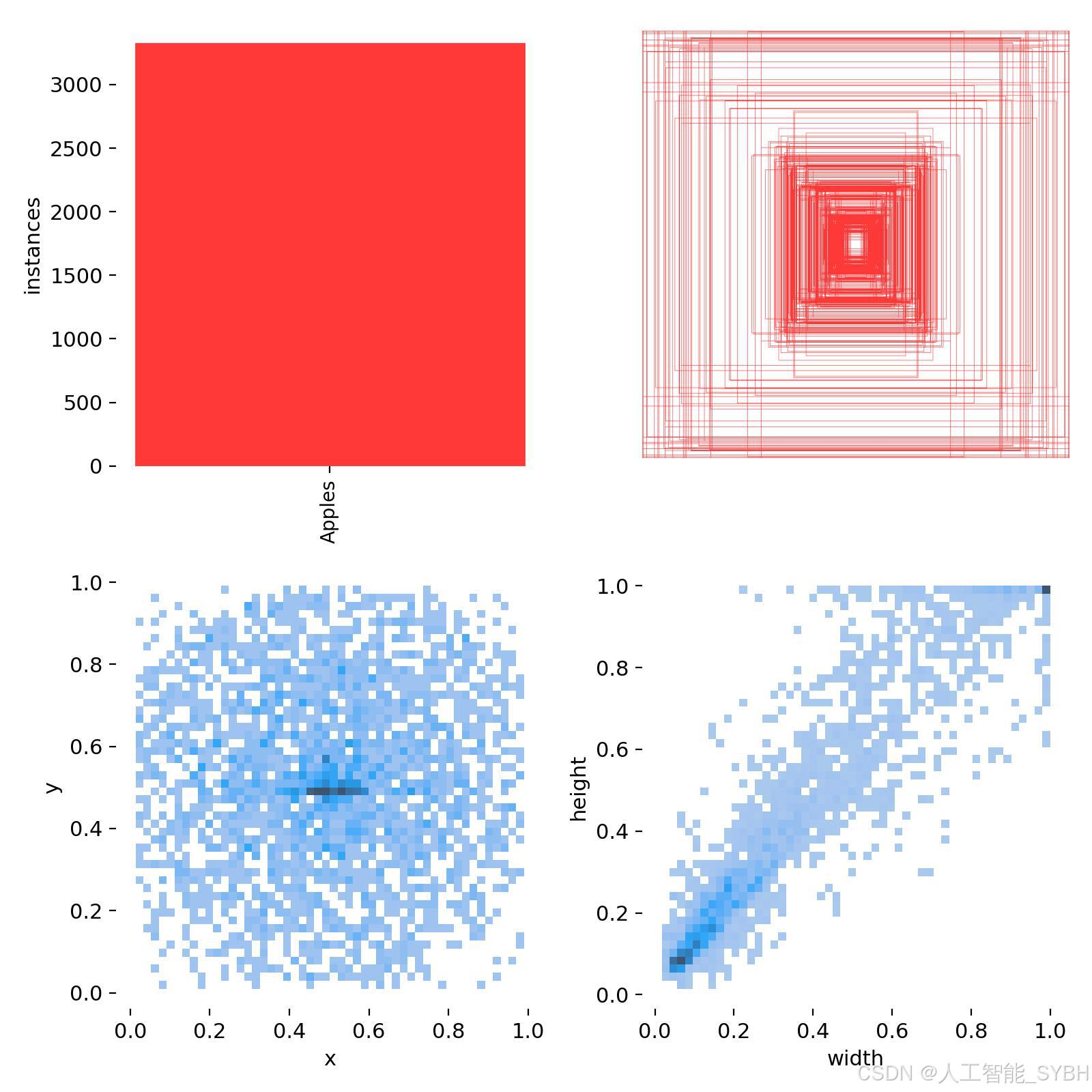 此外,标注框的大小分布表明苹果在图像中的尺寸具有较大差异。为了使模型能够识别各种大小的苹果,我们在数据集的宽度和高度分布中充分考虑了这一点。