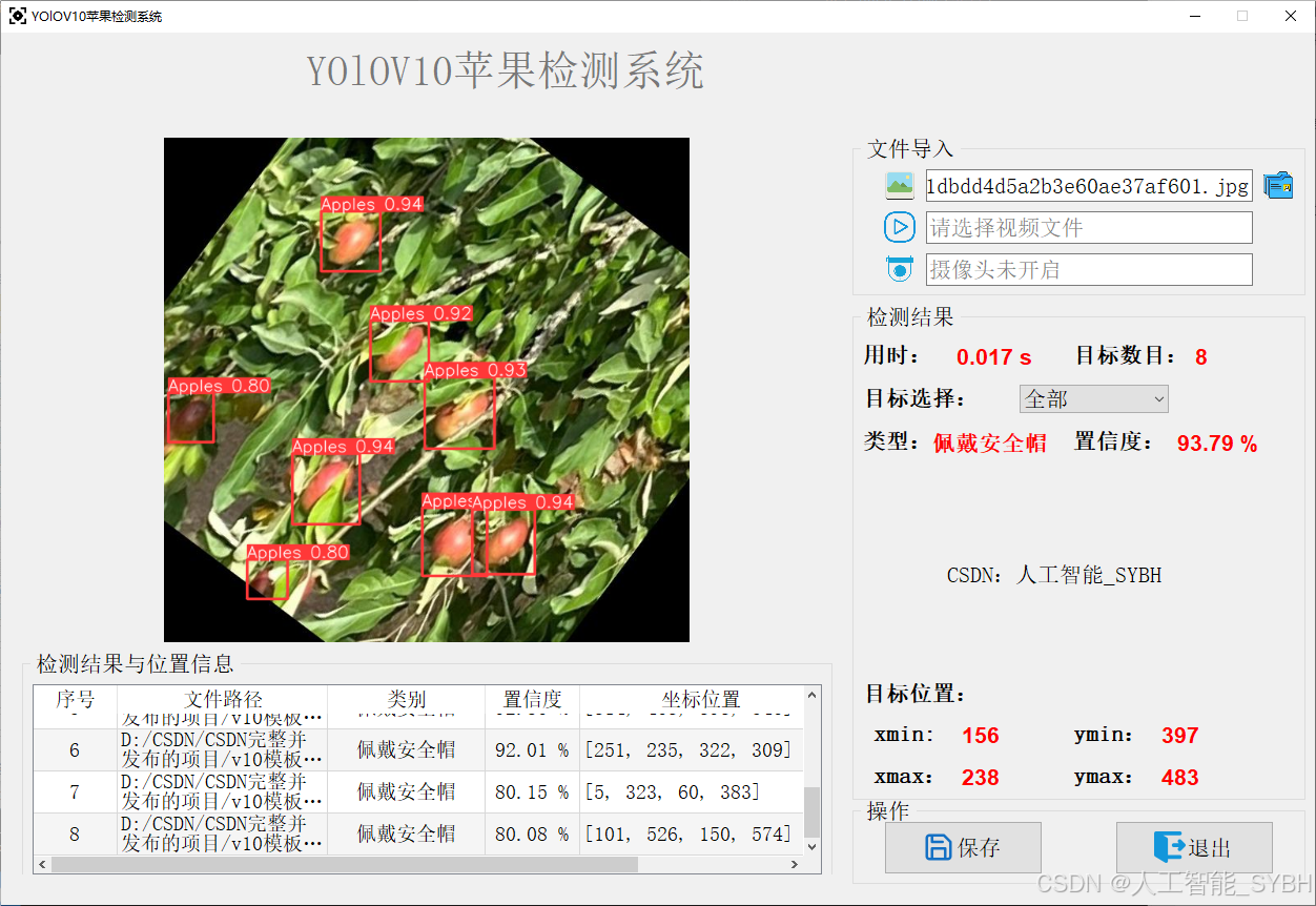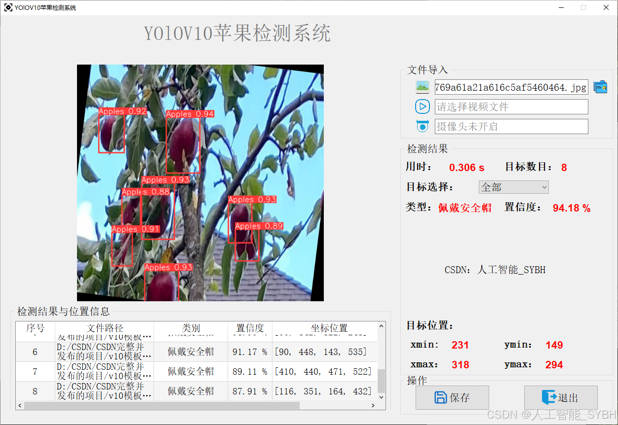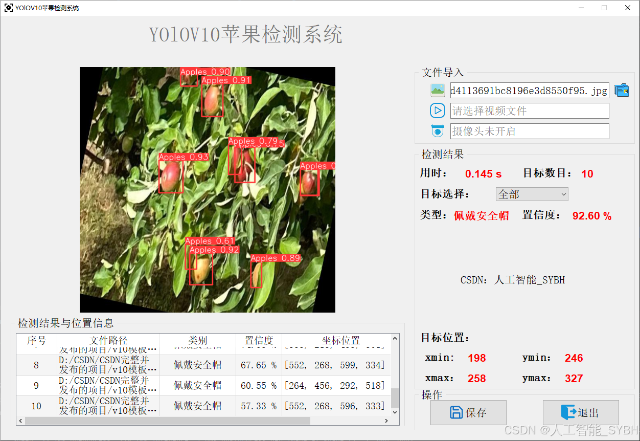 本文基于YOLOv10深度学习框架,通过6744张图片,训练了一个进行苹果的目标检测模型,准确率高达85.7%。并基于此模型开发了一款带UI界面的苹果检测系统,可用于实时检测场景中的苹果,更方便进行功能的展示。该系统是基于python与PyQT5开发的,支持图片、视频以及摄像头进行实时目标检测,并保存检测结果。