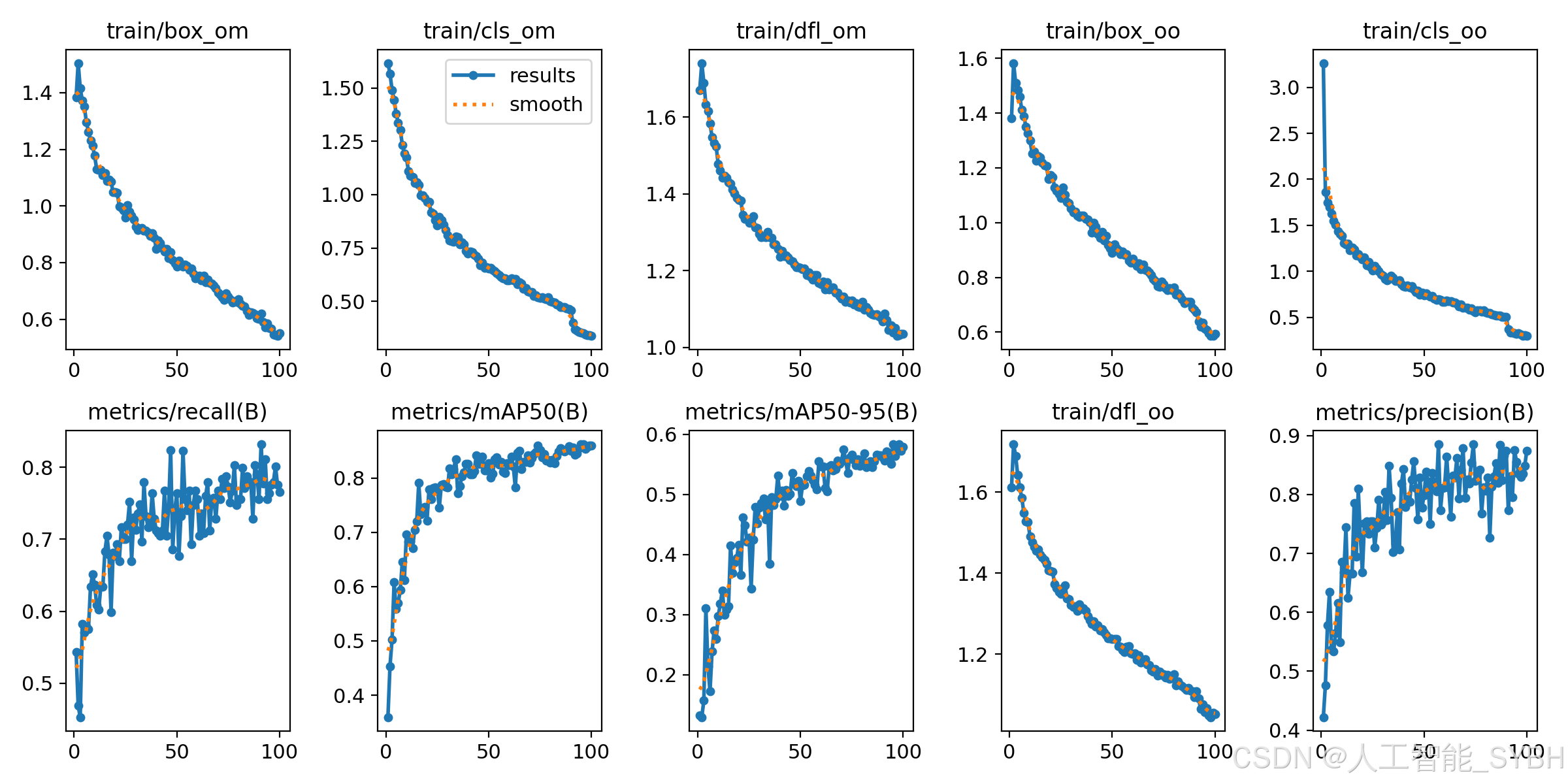 在性能指标方面,图表中的metrics/precision、metrics/recall、metrics/mAP50和metrics/mAP50-95展示了模型性能的逐步提升。随着训练迭代的增加,准确率(Precision)和召回率(Recall)不断提高,这表明模型在识别正样本时变得更加精确,且能捕捉到更多的正样本。mAP(mean Average Precision)是目标检测领域中重要的评估指标之一,其中metrics/mAP50和metrics/mAP50-95的提升说明模型在不同IoU阈值下的检测性能均在提高。具体而言,mAP50表示IoU为0.5时的平均精度,而mAP50-95则涵盖了IoU从0.5到0.95不同阈值下的平均精度,这更加全面地反映了模型在各种重叠程度下的表现。这些指标的稳步上升表明模型在整个训练过程中不断优化,性能逐渐增强。
