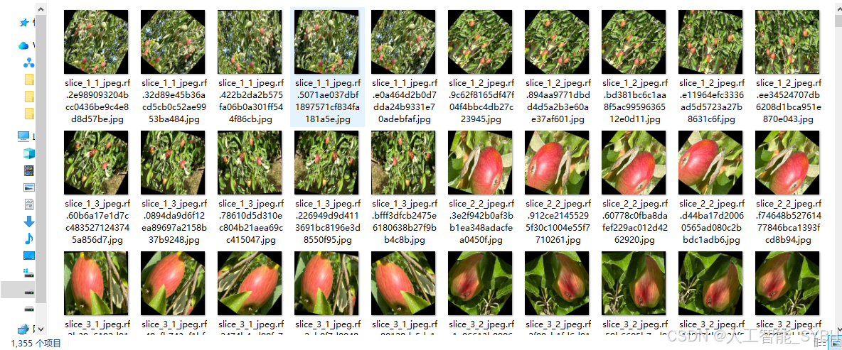 在构建用于苹果检测的深度学习模型时,一个全面和精确标注的数据集是至关重要的。我们的数据集共包含1500张图像,其中包括1355张训练图像,77张验证图像,以及39张测试图像。这样的划分旨在确保模型能在充足的数据上进行训练,同时留出足够的样本来验证和测试模型的性能。