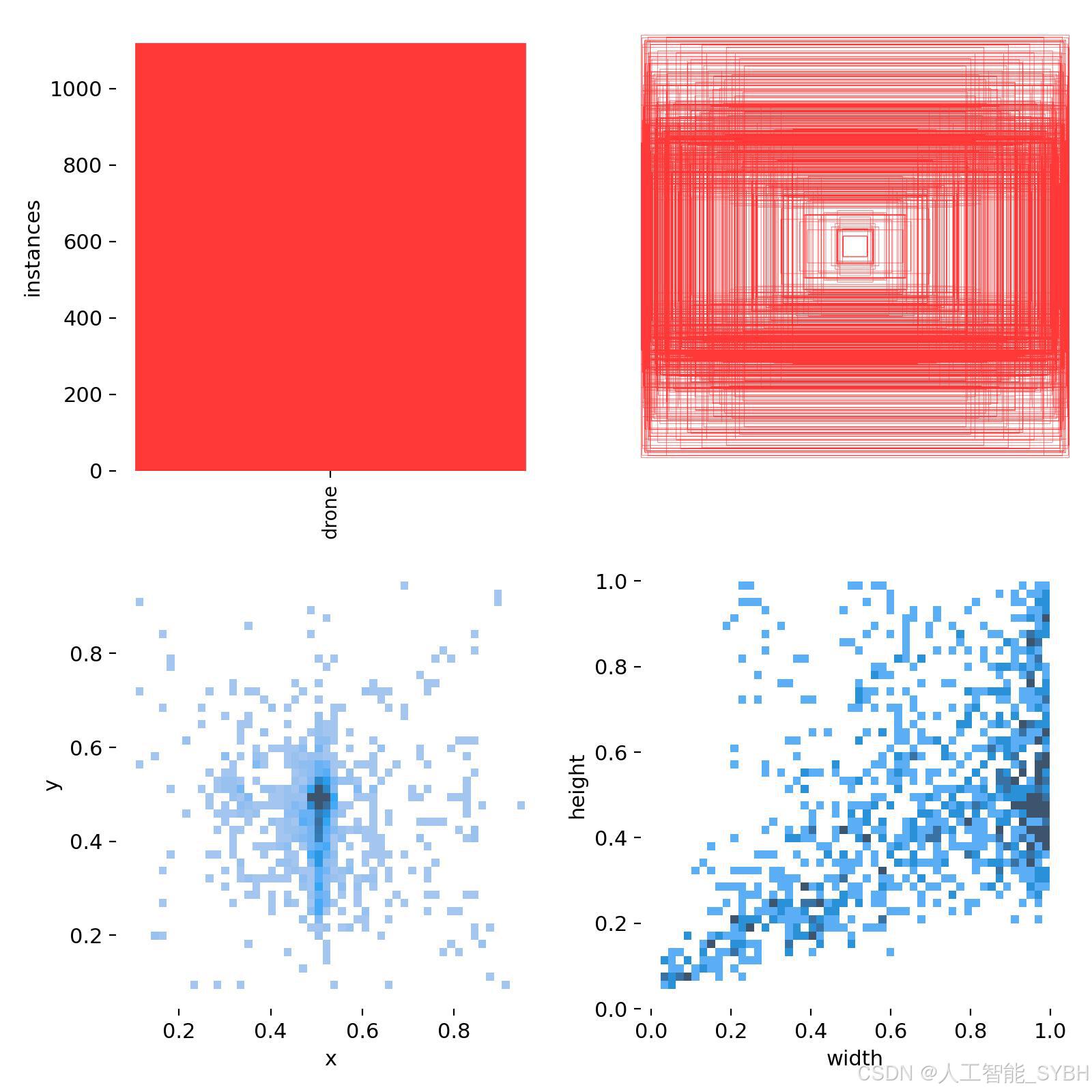 通过分析数据集的标注分布图,我们发现大部分标注框集中在图像的中心区域。这表明数据采集过程中存在一个偏向性:无人机大多出现在画面中央。虽然这种分布有助于模型更好地学习识别中心区域的目标,但也可能导致模型在检测图像边缘的无人机时表现欠佳。为此,我们采用了多种数据增强方法,包括随机旋转、缩放、裁剪以及颜色变化等,以模拟不同的视角和环境条件,从而提升模型在各种情况下对无人机的检测能力。