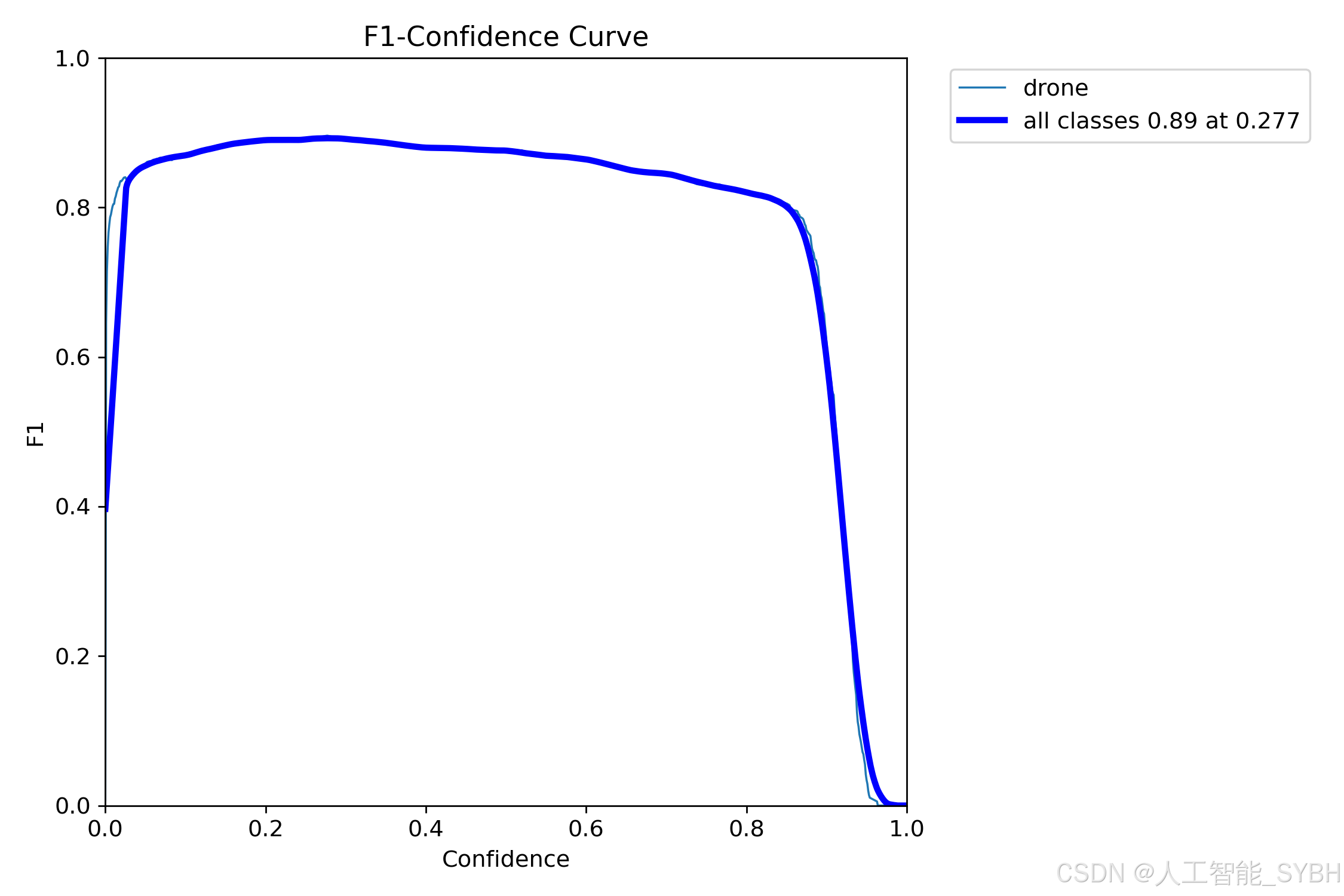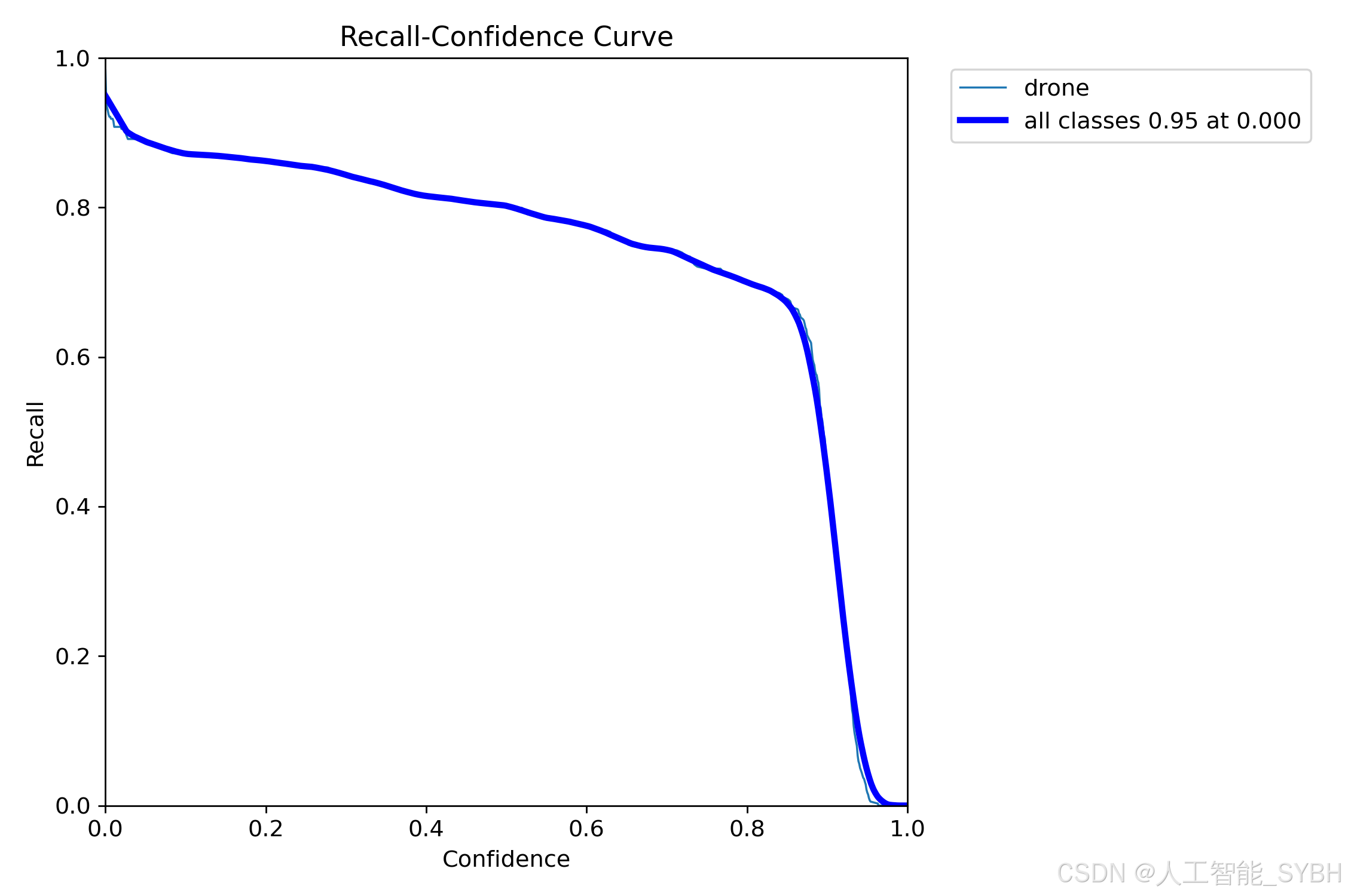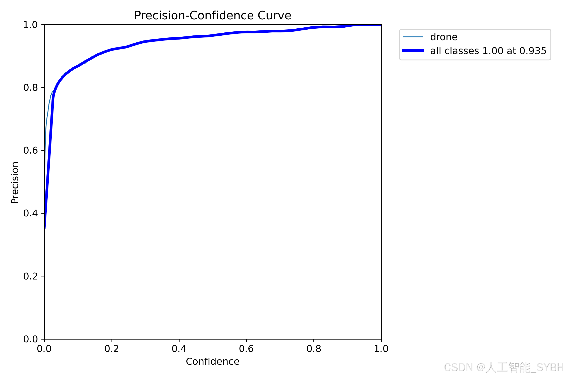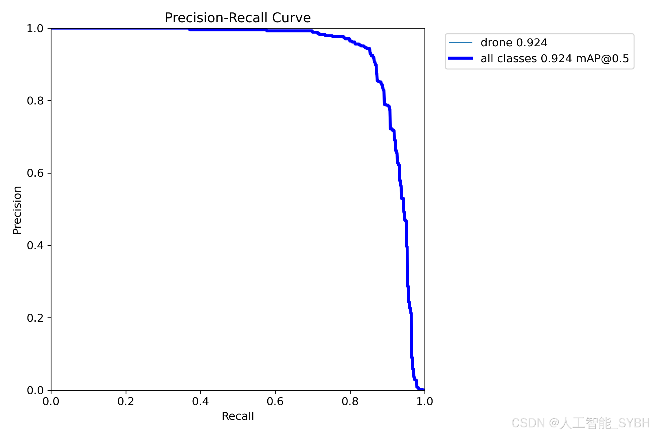 PR曲线体现精确率和召回率的关系,本文训练结果的PR曲线如下。mAP表示Precision和Recall作为两轴作图后围成的面积,m表示平均,@后面的数表示判定iou为正负样本的阈值。mAP@.5:表示阈值大于0.5的平均mAP,无人机的mAP@0.5已经达到0.924 。