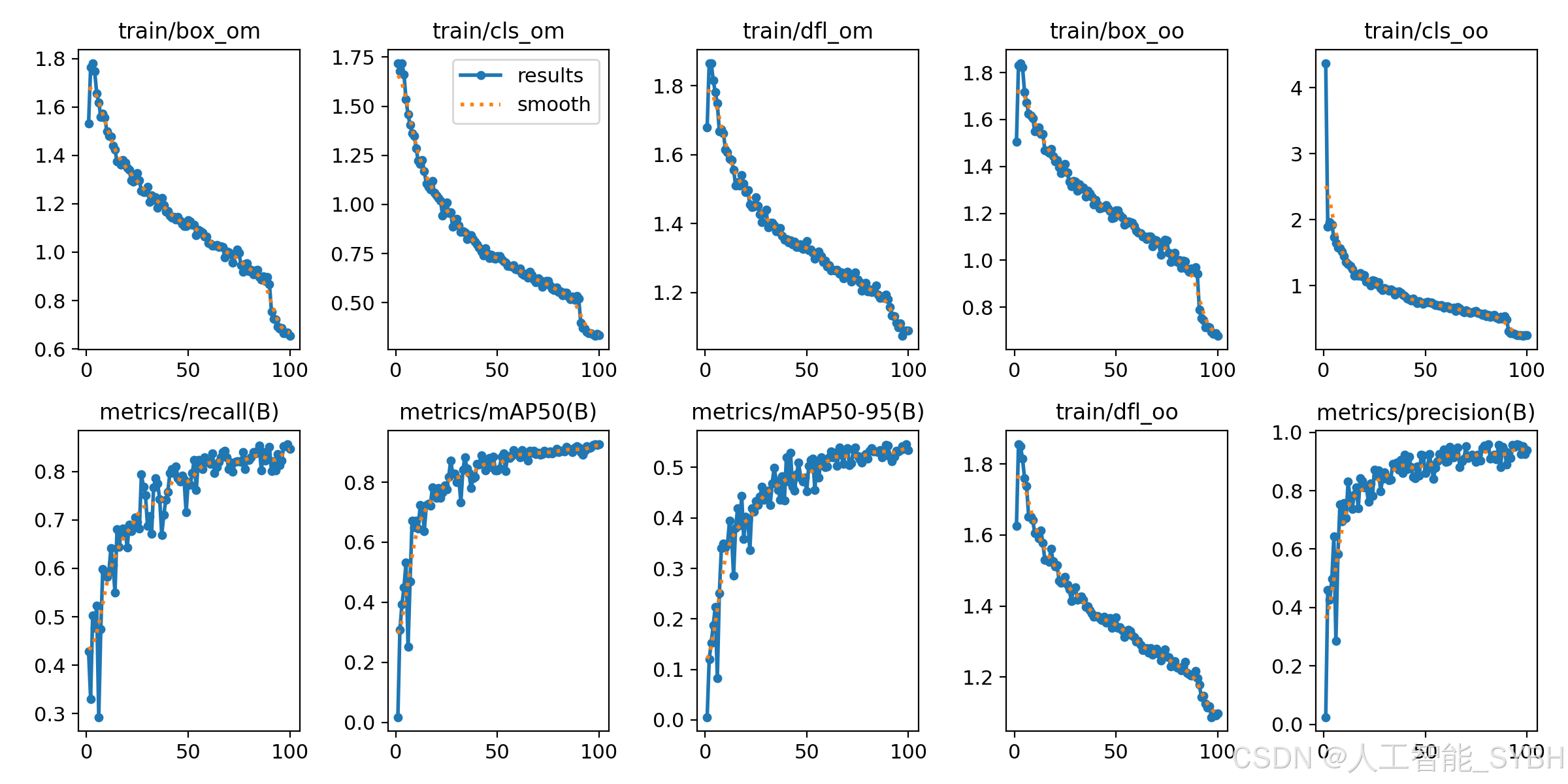 在性能指标方面,图表中的metrics/precision、metrics/recall、metrics/mAP50和metrics/mAP50-95展示了模型性能的逐步提升。随着训练迭代的增加,准确率(Precision)和召回率(Recall)不断提高,这表明模型在识别正样本时变得更加精确,且能捕捉到更多的正样本。mAP(mean Average Precision)是目标检测领域中重要的评估指标之一,其中metrics/mAP50和metrics/mAP50-95的提升说明模型在不同IoU阈值下的检测性能均在提高。具体而言,mAP50表示IoU为0.5时的平均精度,而mAP50-95则涵盖了IoU从0.5到0.95不同阈值下的平均精度,这更加全面地反映了模型在各种重叠程度下的表现。这些指标的稳步上升表明模型在整个训练过程中不断优化,性能逐渐增强。