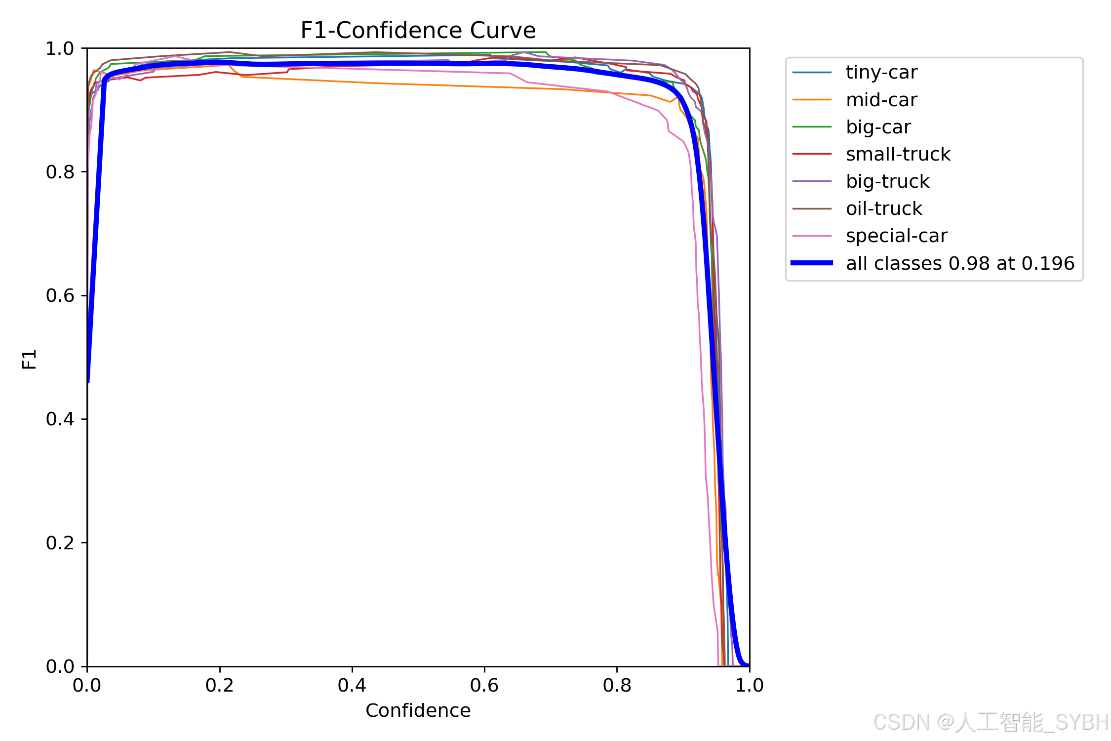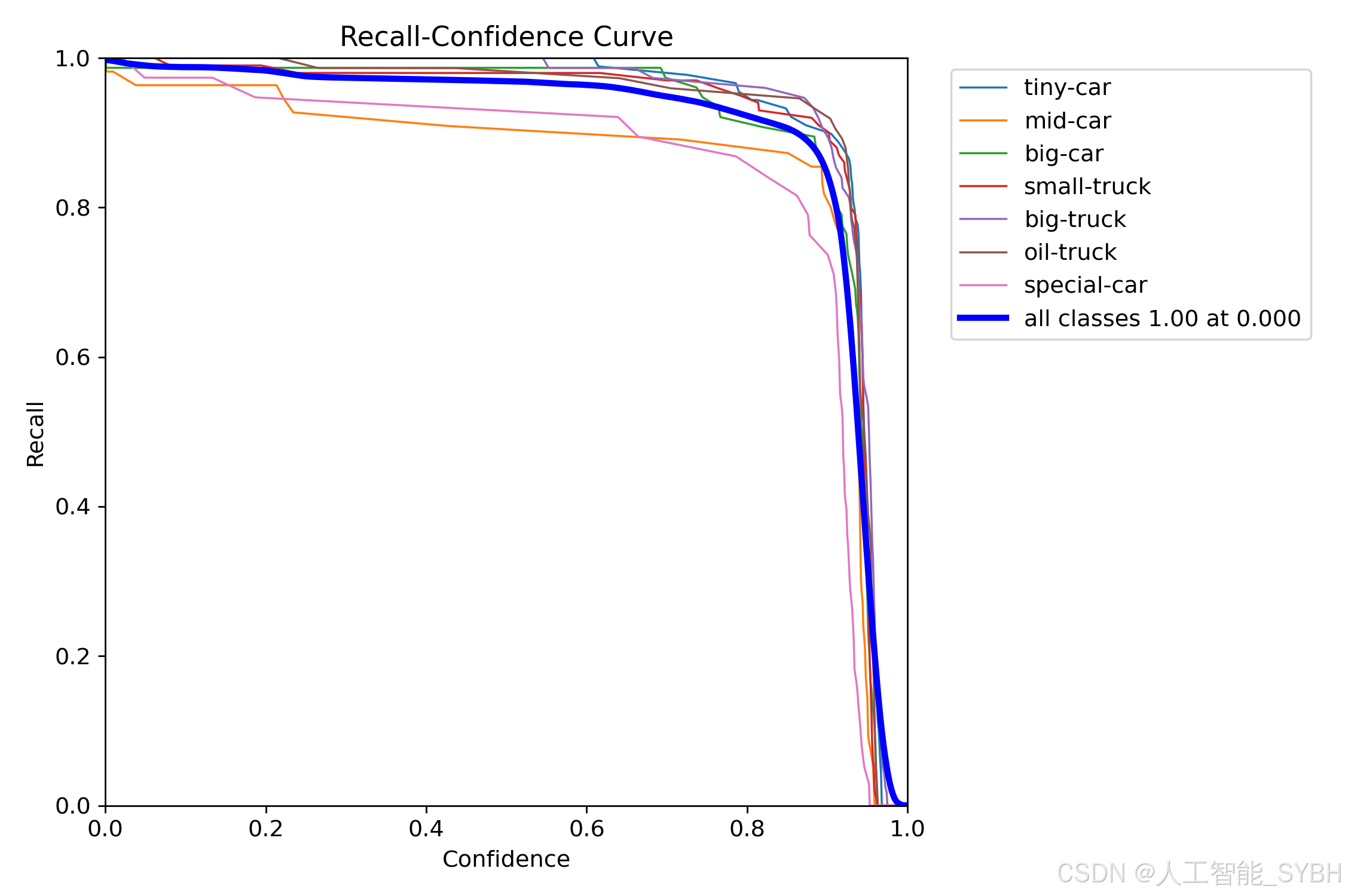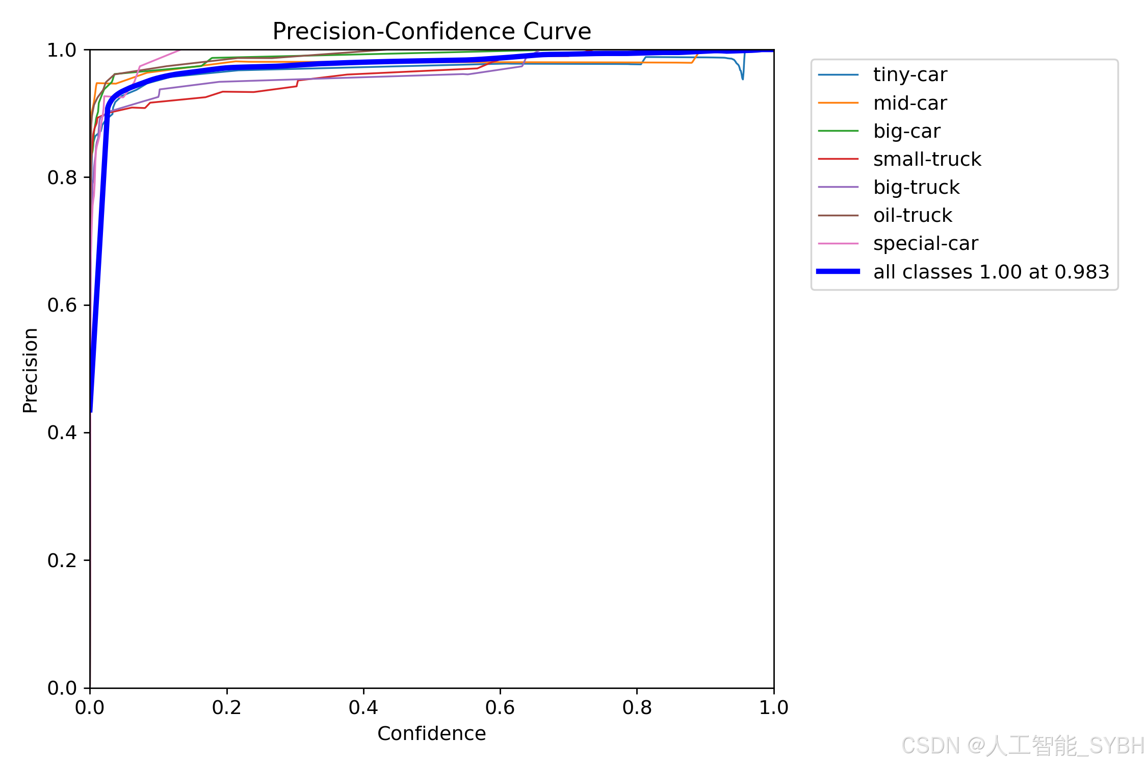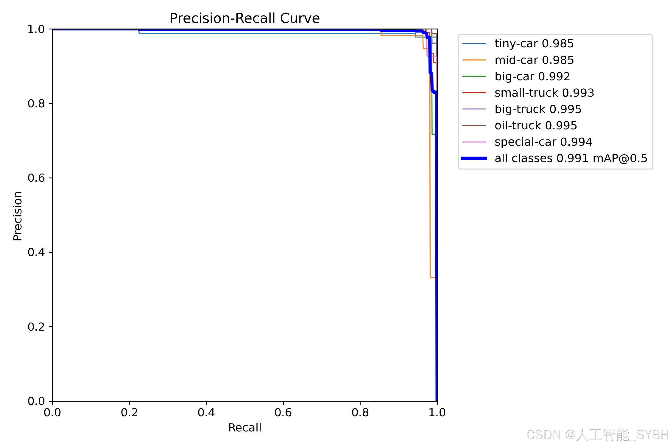 PR曲线体现精确率和召回率的关系,本文训练结果的PR曲线如下。mAP表示Precision和Recall作为两轴作图后围成的面积,m表示平均,@后面的数表示判定iou为正负样本的阈值。mAP@.5:表示阈值大于0.5的平均mAP,平均的mAP@0.5已经达到0.991 。