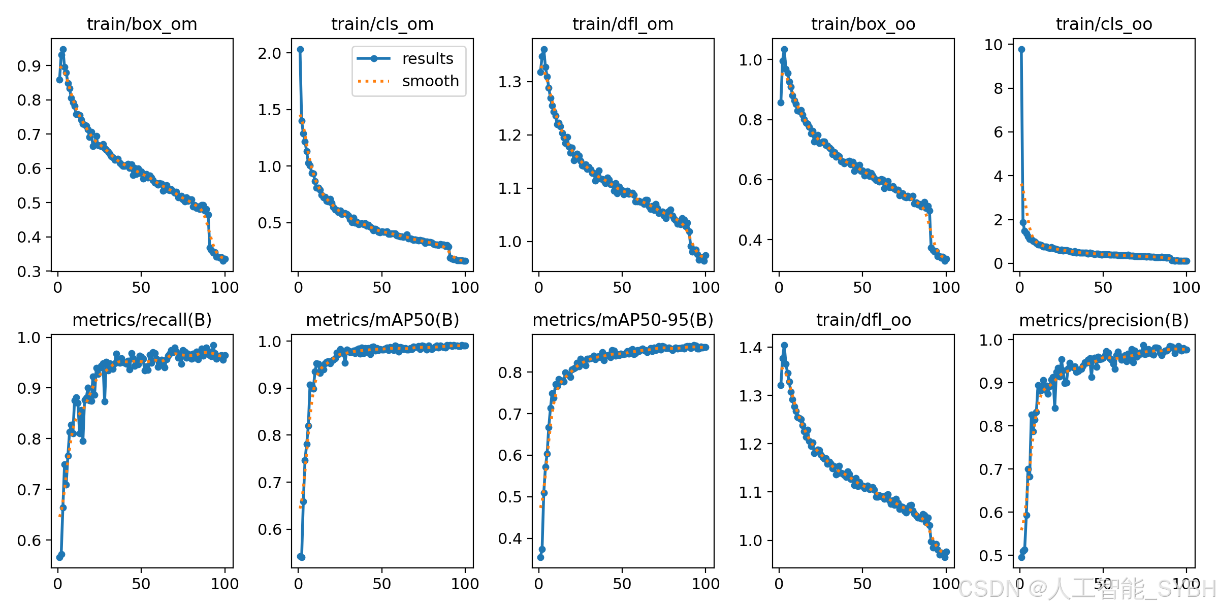 在性能指标方面,图表中的metrics/precision、metrics/recall、metrics/mAP50和metrics/mAP50-95展示了模型性能的逐步提升。随着训练迭代的增加,准确率(Precision)和召回率(Recall)不断提高,这表明模型在识别正样本时变得更加精确,且能捕捉到更多的正样本。mAP(mean Average Precision)是目标检测领域中重要的评估指标之一,其中metrics/mAP50和metrics/mAP50-95的提升说明模型在不同IoU阈值下的检测性能均在提高。具体而言,mAP50表示IoU为0.5时的平均精度,而mAP50-95则涵盖了IoU从0.5到0.95不同阈值下的平均精度,这更加全面地反映了模型在各种重叠程度下的表现。这些指标的稳步上升表明模型在整个训练过程中不断优化,性能逐渐增强。