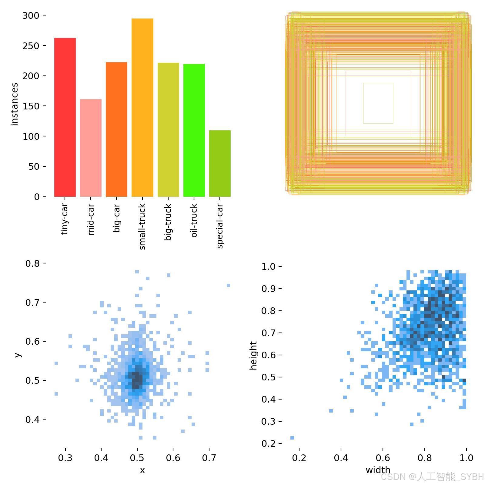 此外,标注框的大小分布表明车辆在图像中的尺寸具有较大差异。为了使模型能够识别各种大小的车辆,我们在数据集的宽度和高度分布中充分考虑了这一点。