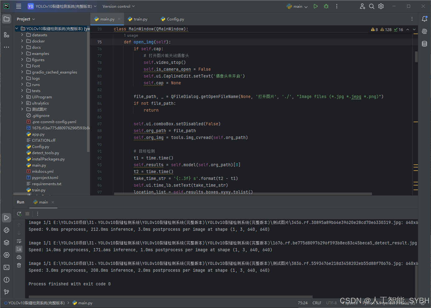 --batch 64:每批次64张图像。--epochs 500:训练500轮。--datasets/data.yaml:数据集配置文件。--weights yolov10s.pt:初始化模型权重,yolov10s.pt是预训练的轻量级YOLO模型。