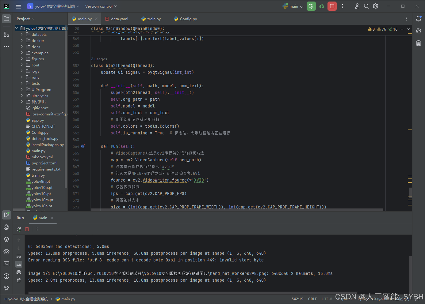 --batch 64:每批次64张图像。--epochs 500:训练500轮。--datasets/data.yaml:数据集配置文件。--weights yolov10s.pt:初始化模型权重,yolov10s.pt是预训练的轻量级YOLO模型。