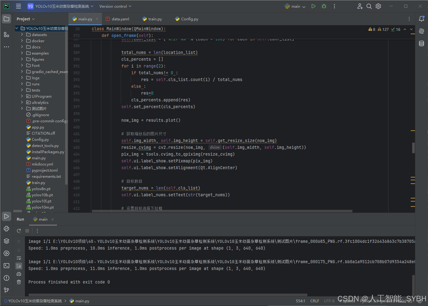 --batch 64:每批次64张图像。--epochs 500:训练500轮。--datasets/data.yaml:数据集配置文件。--weights yolov10s.pt:初始化模型权重,yolov10s.pt是预训练的轻量级YOLO模型。