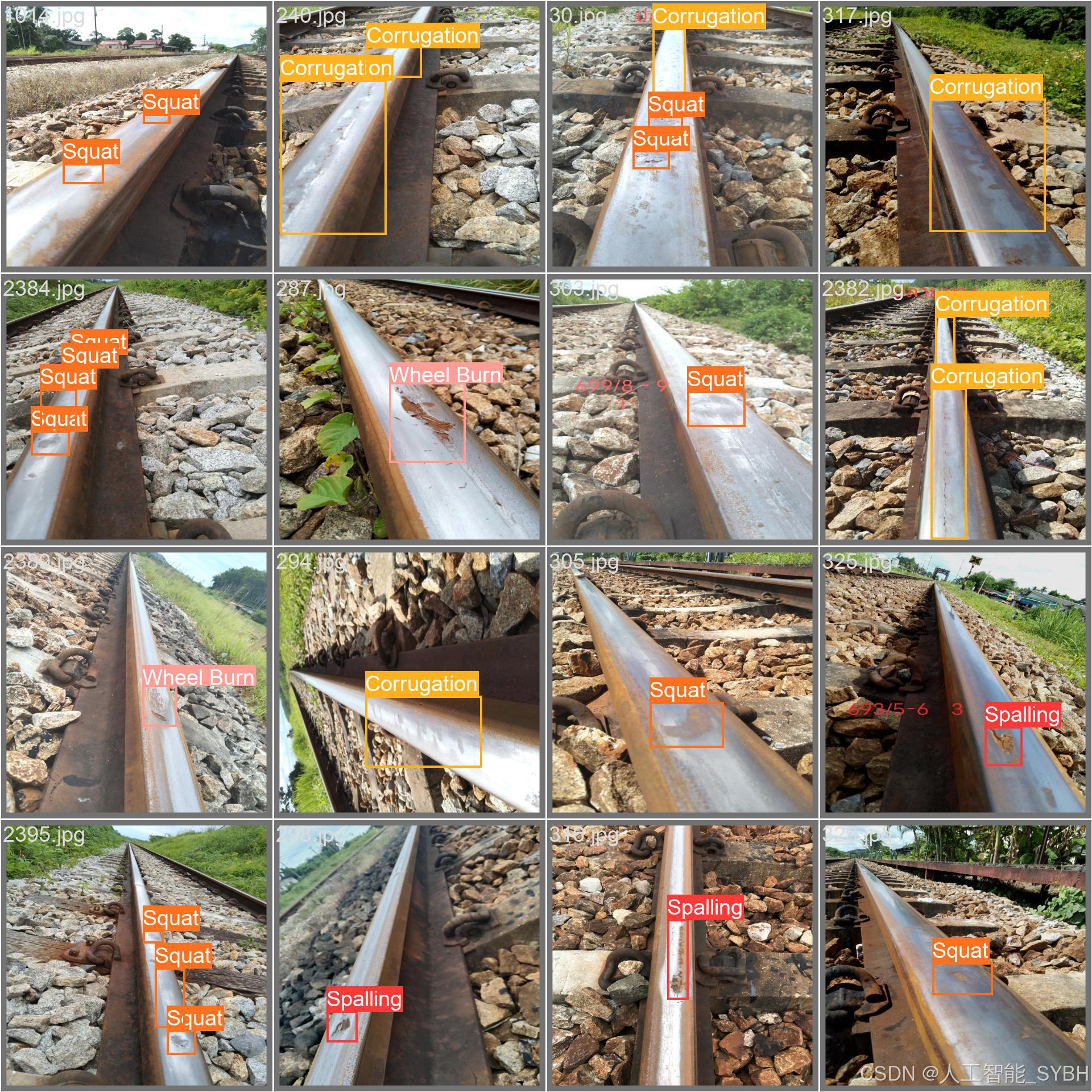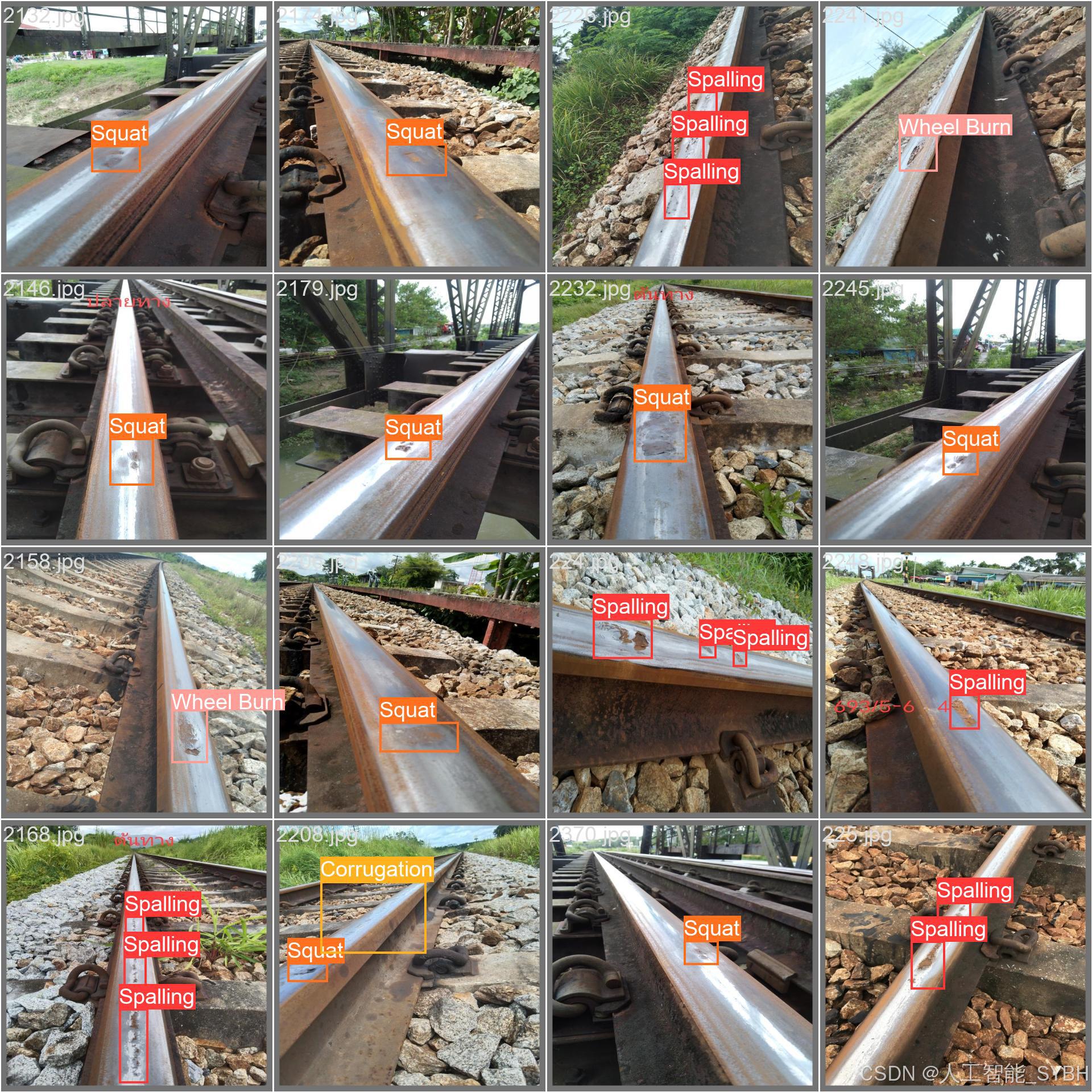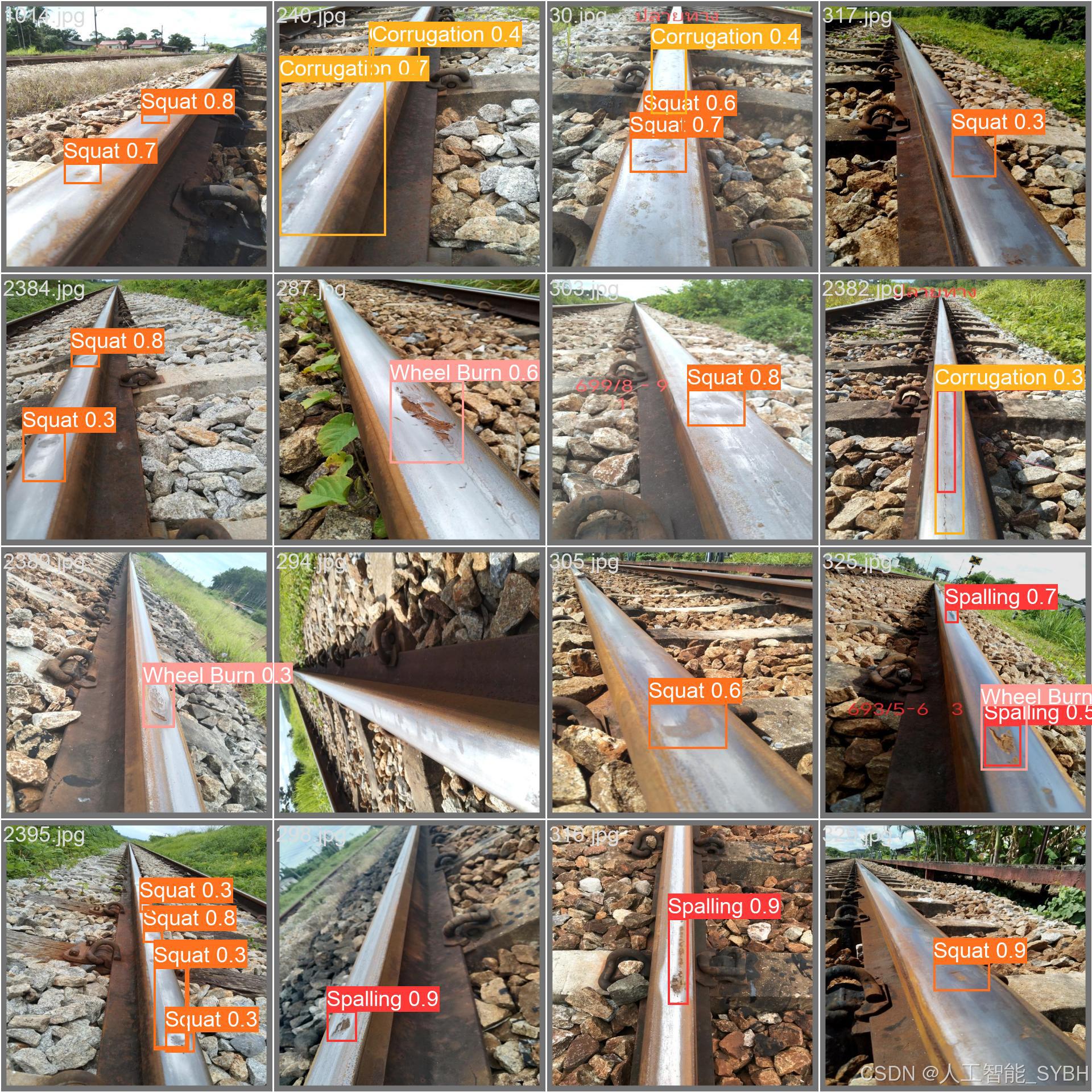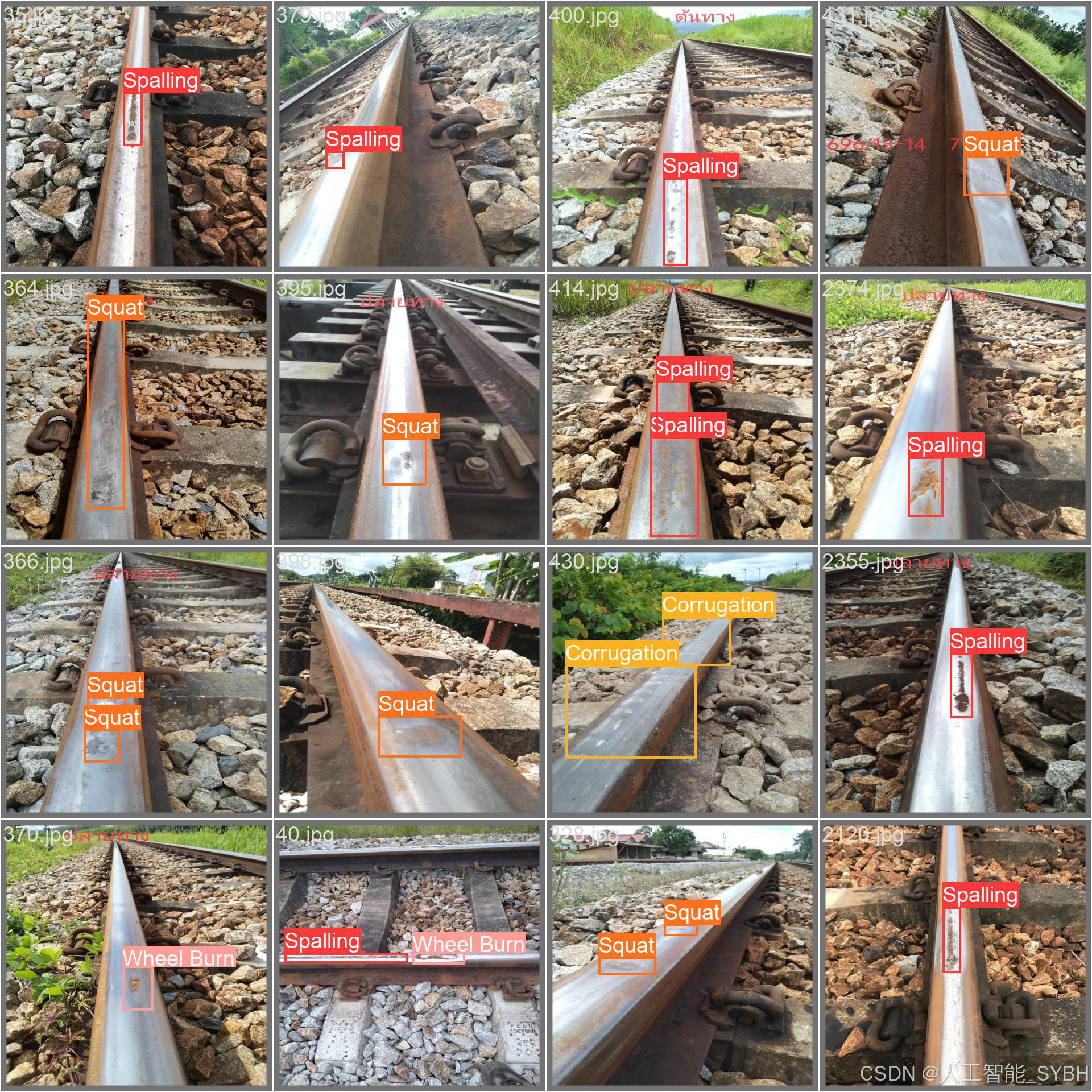 利用YOLOv10模型对铁轨轨道的四种常见缺陷进行自动检测,包括剥落(Spalling)、轮轨烧伤(Wheel Burn)、压痕(Squat)和波浪磨耗(Corrugation)。