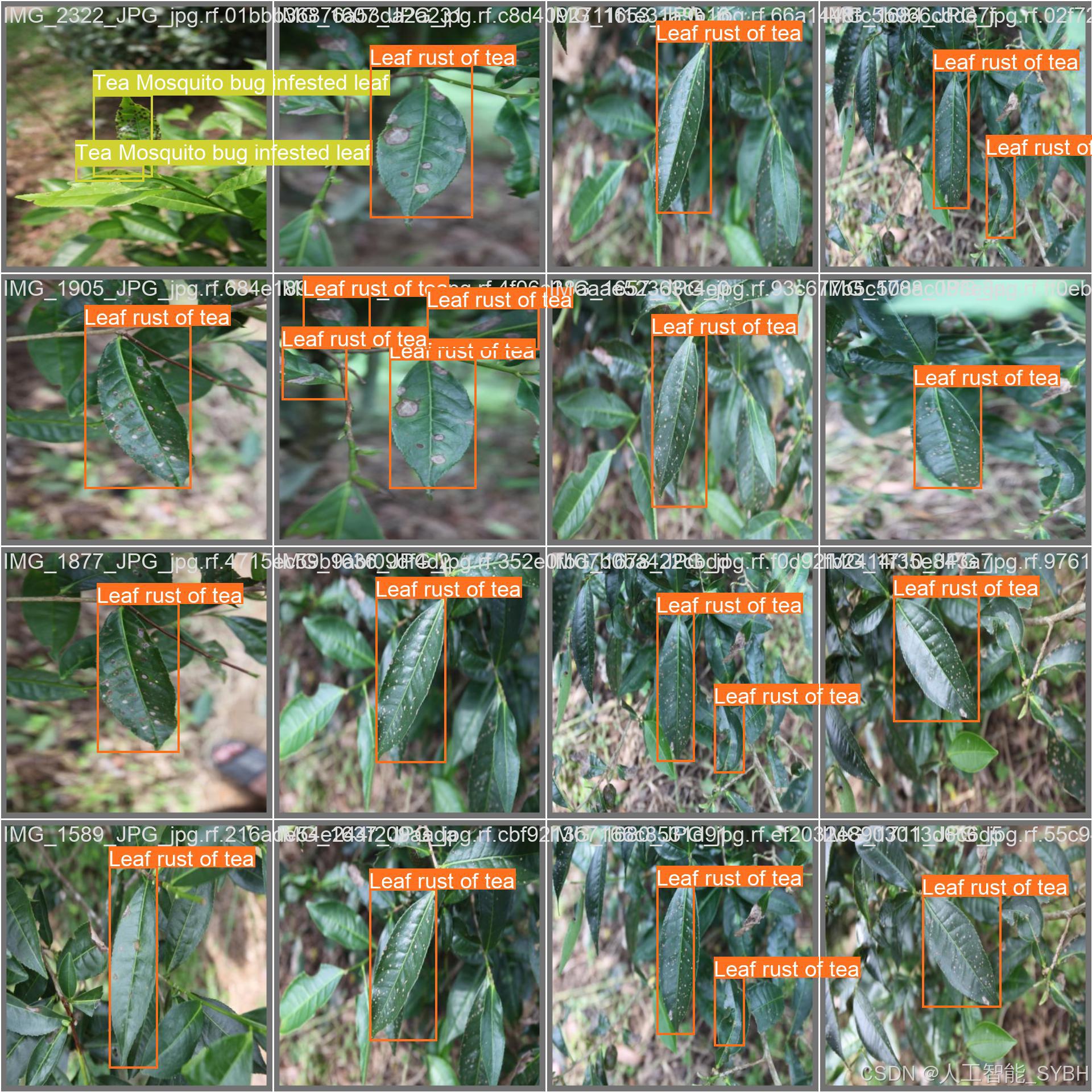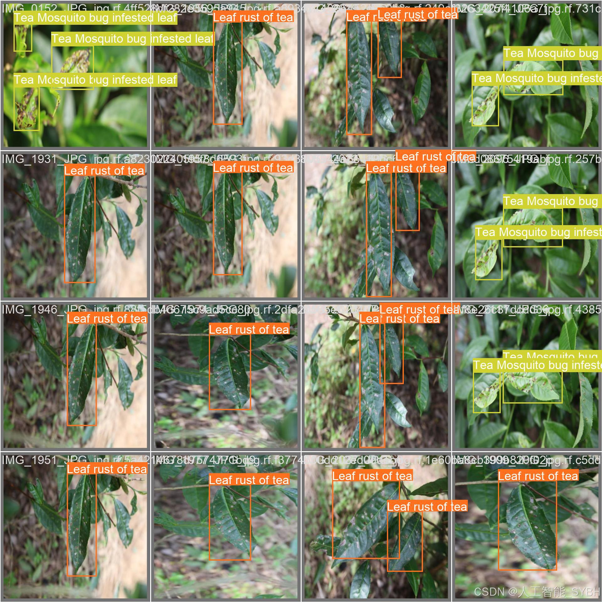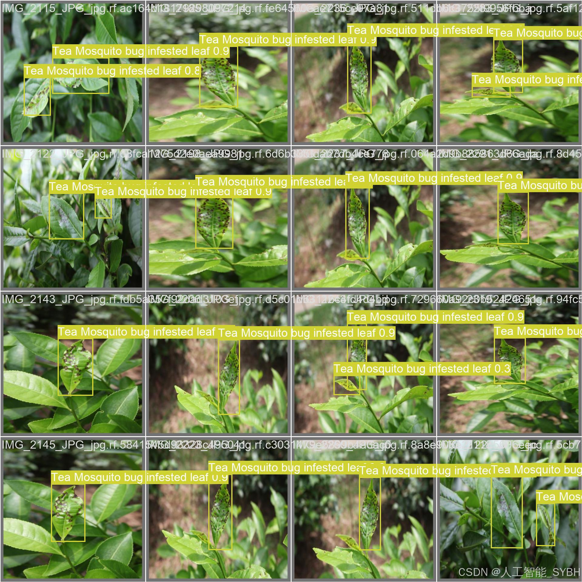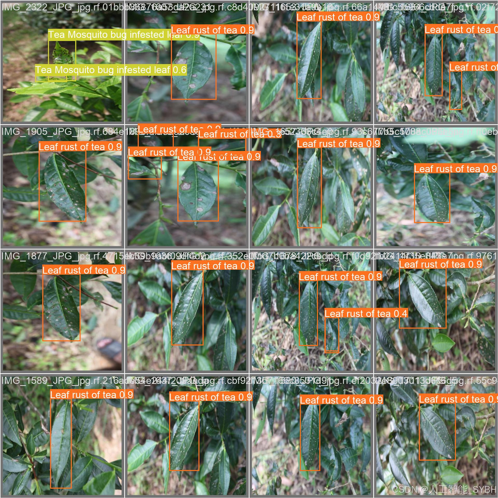 利用YOLOv10模型对茶叶的八种常见病害进行自动检测,包括茶黑腐病(Black rot of tea)、茶褐斑病(Brown blight of tea)、茶锈病(Leaf rust of tea)、红蜘蛛侵害茶叶(Red Spider infested tea leaf)、茶蚊虫侵害茶叶(Tea Mosquito bug infested leaf)、健康茶叶(Tea leaf)、茶白斑病(White spot of tea)以及其他病害(disease)。