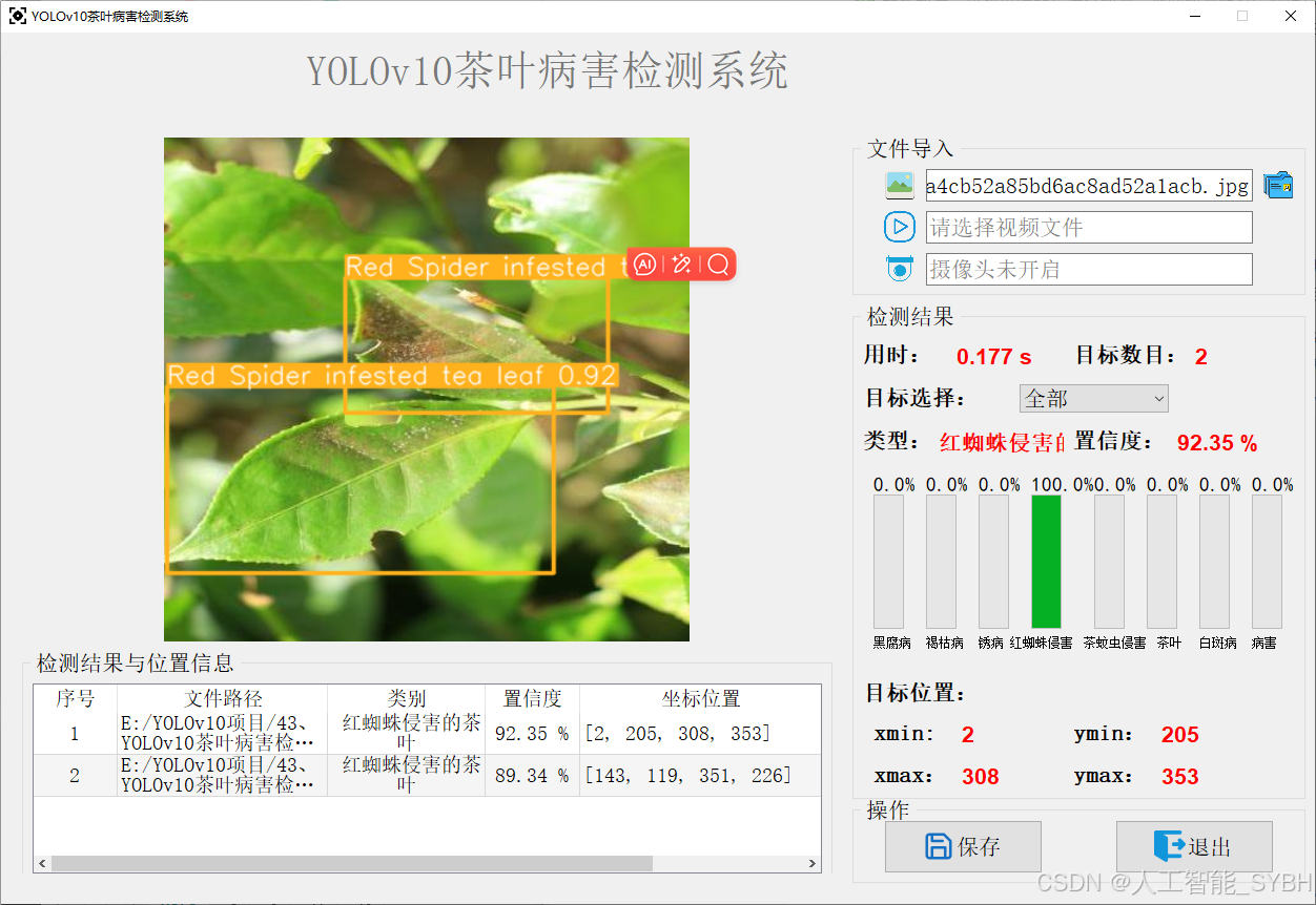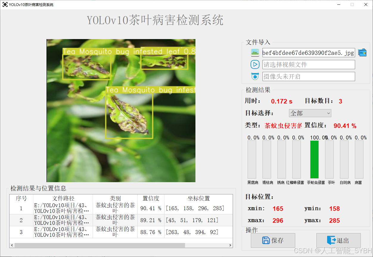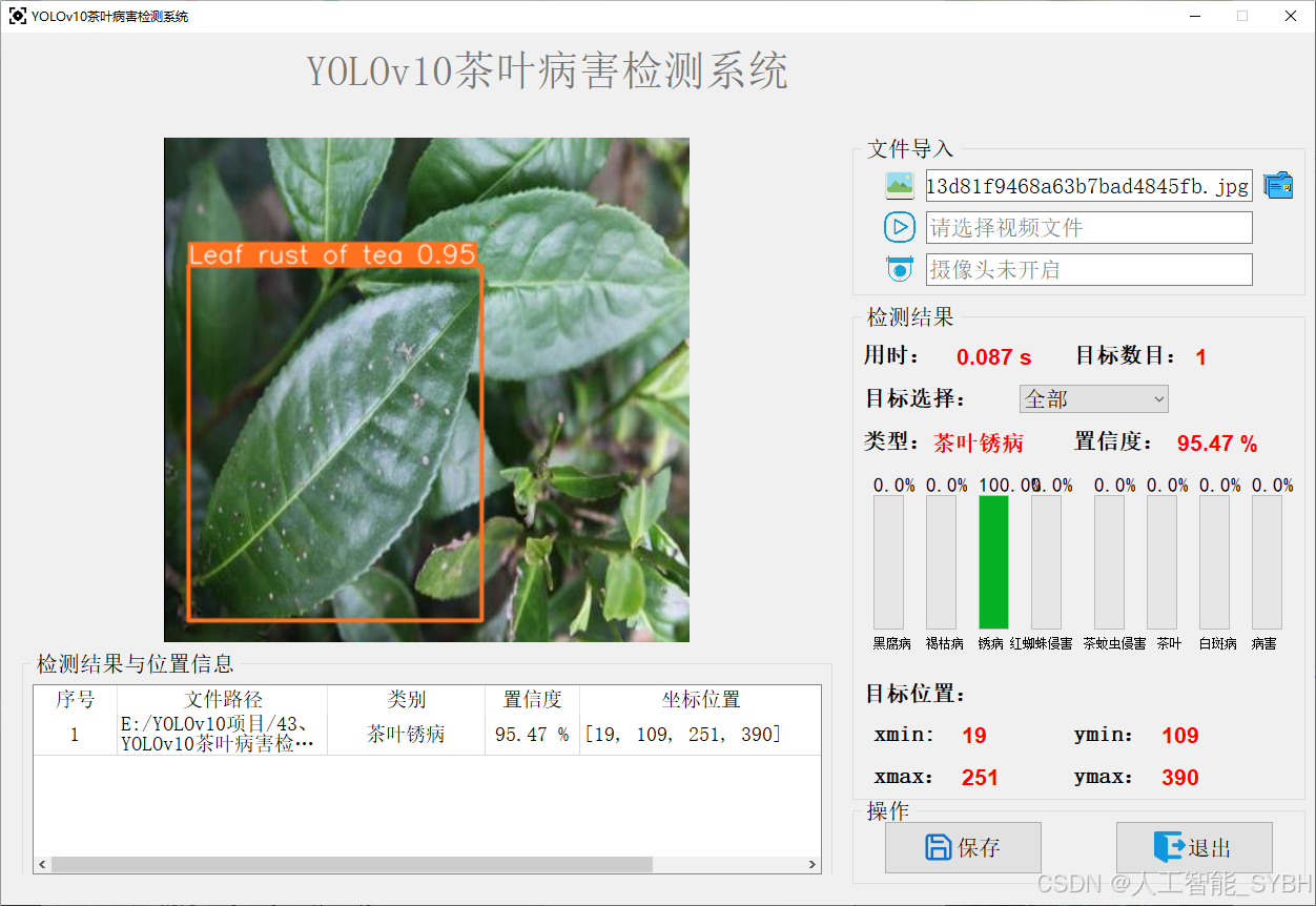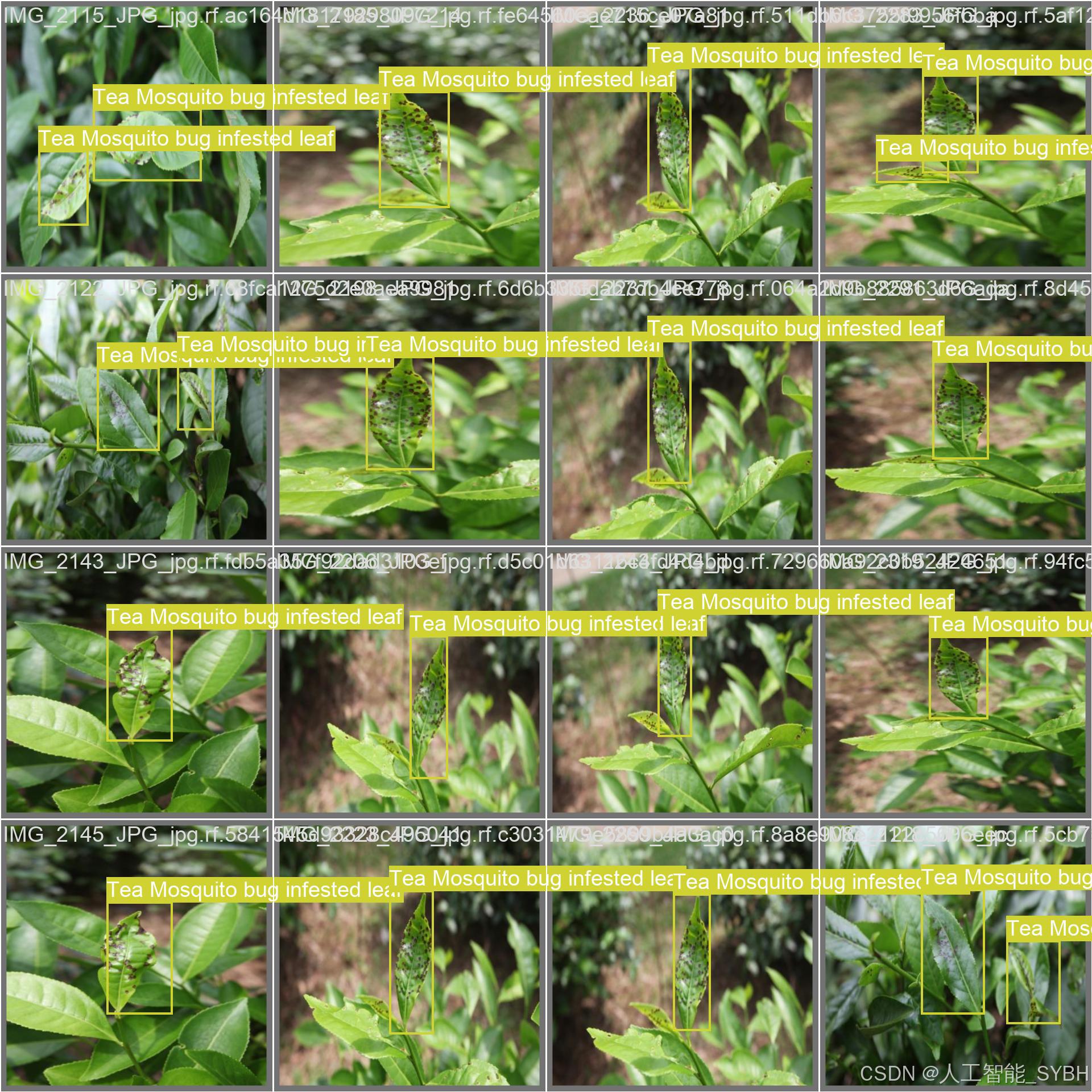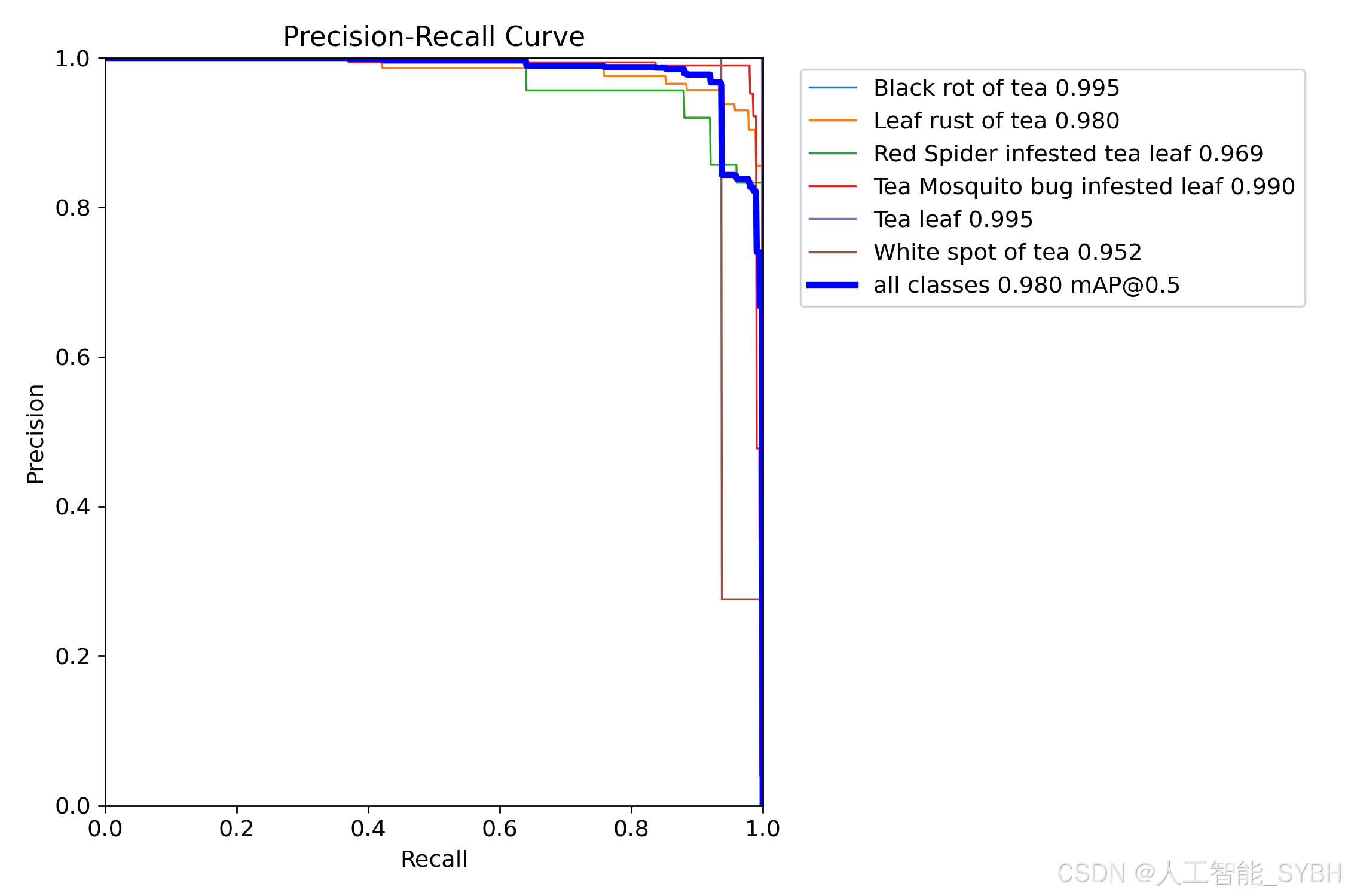 利用YOLOv10模型对茶叶的八种常见病害进行自动检测,包括茶黑腐病(Black rot of tea)、茶褐斑病(Brown blight of tea)、茶锈病(Leaf rust of tea)、红蜘蛛侵害茶叶(Red Spider infested tea leaf)、茶蚊虫侵害茶叶(Tea Mosquito bug infested leaf)、健康茶叶(Tea leaf)、茶白斑病(White spot of tea)以及其他病害(disease)。