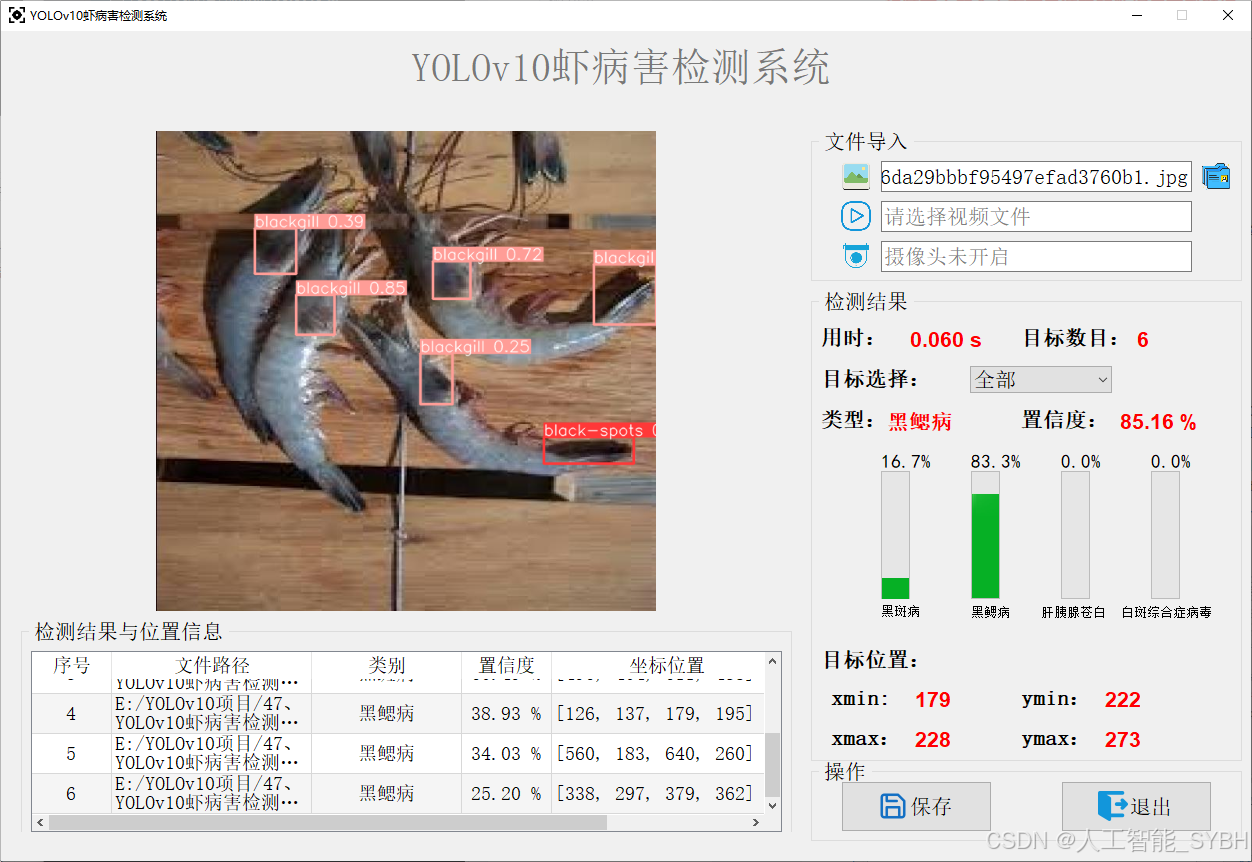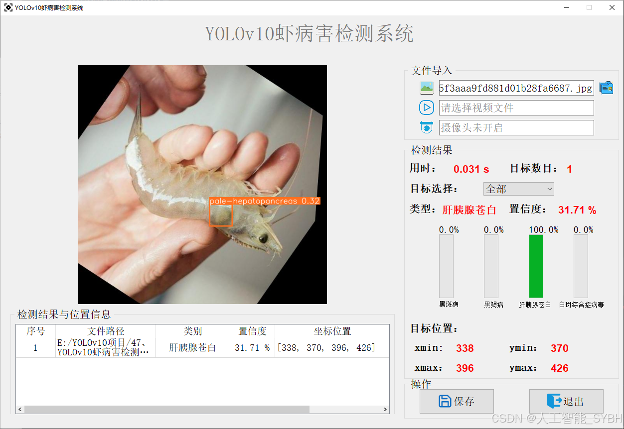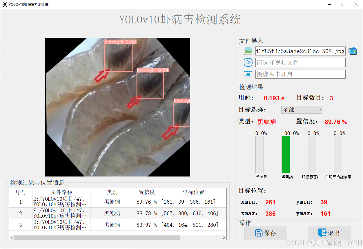 本项目利用YOLOv10(You Only Look Once version 10)目标检测算法,开发一个高效的虾病害检测系统。该系统能够自动从虾类图像中检测出病害区域,并区分病害类型(如黑斑病、黑鳃病、肝胰腺苍白病、白斑综合症病毒),为养殖户提供病害预警和防治建议。