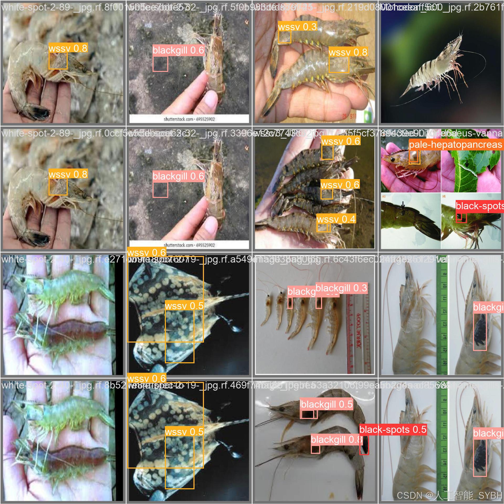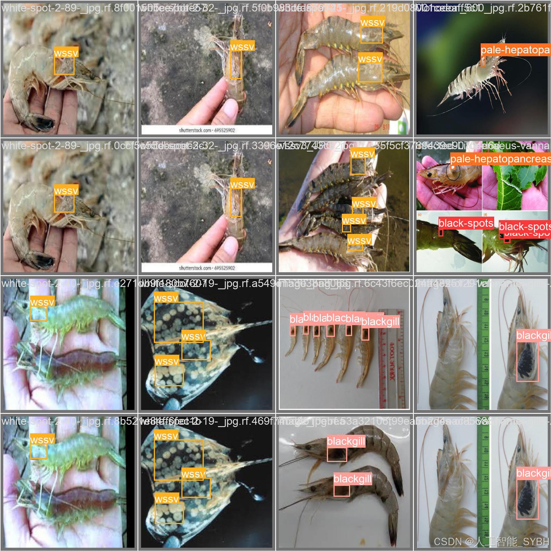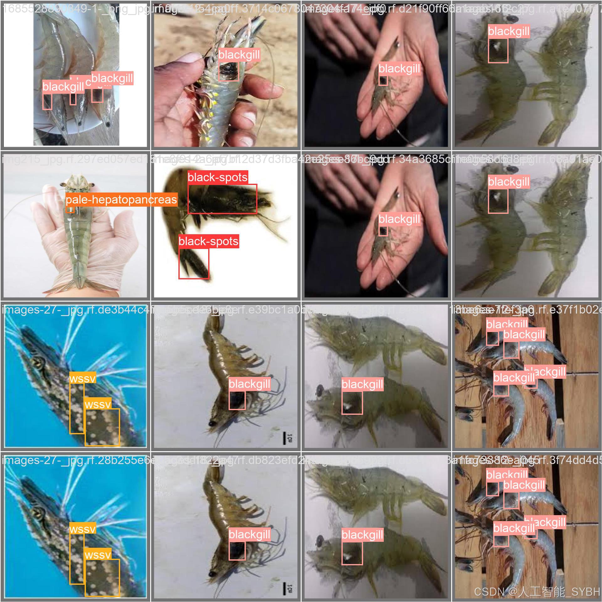 虾类养殖是全球水产养殖业的重要组成部分,但虾类病害(如黑斑病、黑鳃病、肝胰腺苍白病、白斑综合症病毒等)严重影响了虾类的健康生长和养殖效益。传统的病害检测方法依赖于人工观察和经验判断,效率低且容易出错。基于深度学习的目标检测技术可以自动识别虾类病害,帮助养殖户及时采取防治措施,减少经济损失。