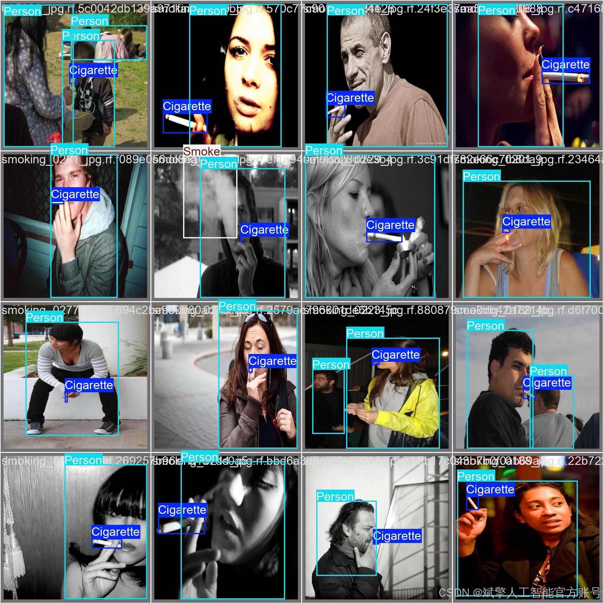 数据集的标注包含以下五个互相关联的类别,这种多类别设计使模型能够理解吸烟场景的上下文信息,而不仅仅是孤立地检测物体。