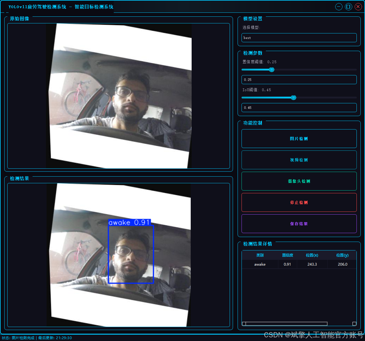 本项目基于YOLOv11目标检测算法,开发了一套用于实时监测驾驶员疲劳状态的智能系统。该系统能够通过车载摄像头实时捕捉驾驶员面部图像,并精准识别其处于“清醒”或“疲劳”状态。经过在自定义数据集上的充分训练与验证,模型表现出优异的性能,能够有效检测出闭眼、点头、瞌睡等关键疲劳特征。本系统的最终目标是作为高级驾驶辅助系统(ADAS)的核心模块,及时发出预警,从而显著降低因疲劳驾驶引发的交通事故风险,提升道路安全。