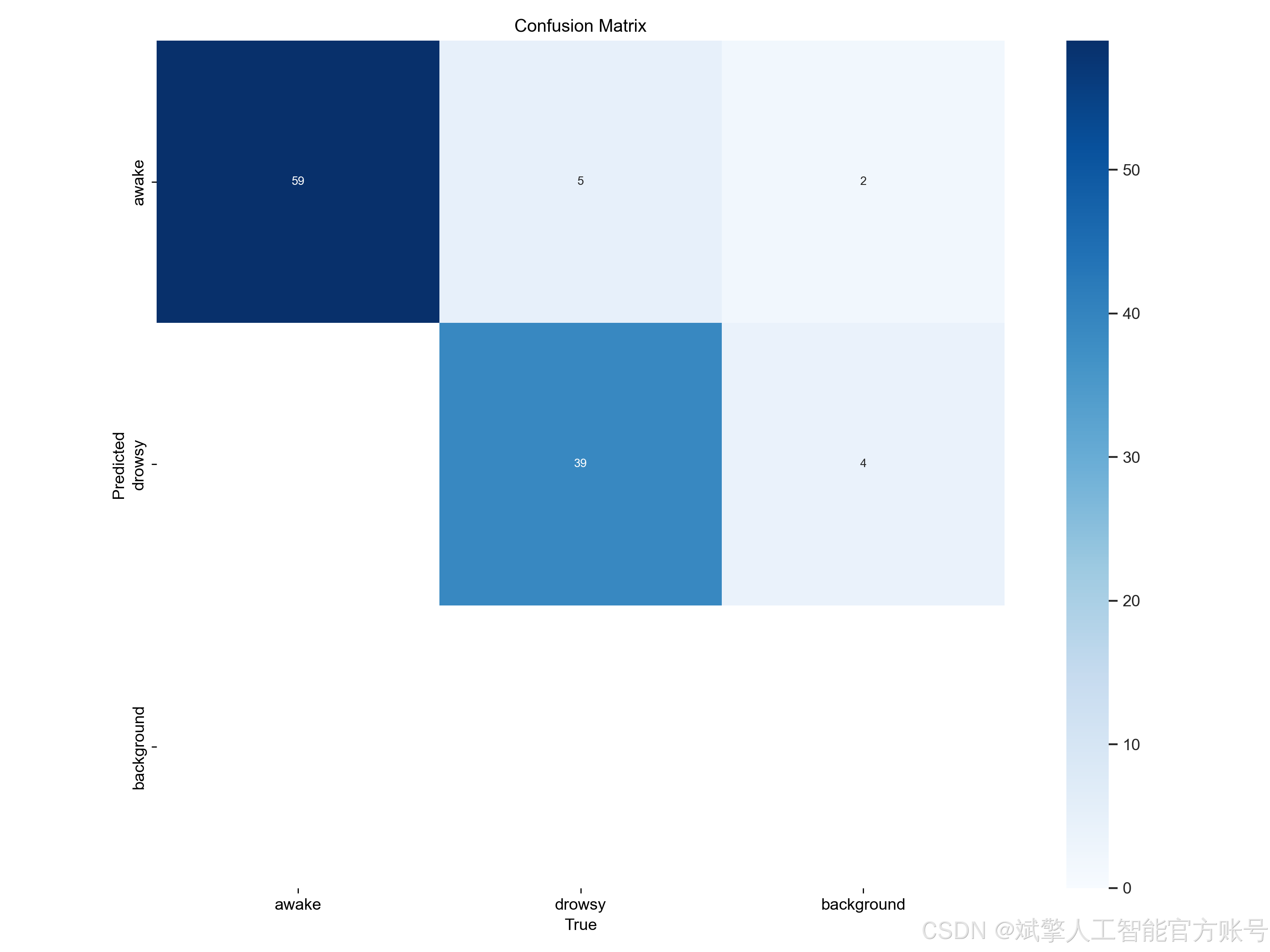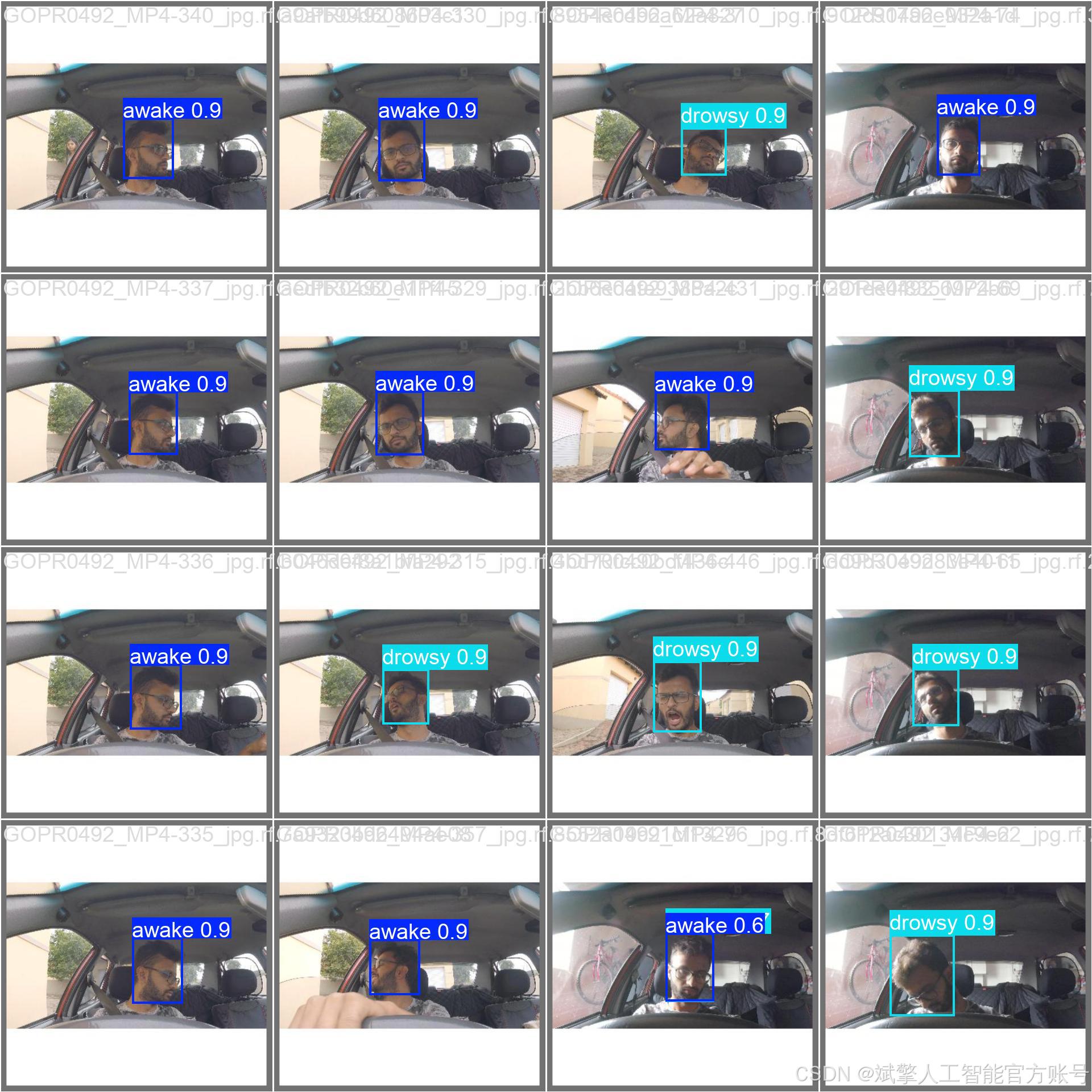 drowsy: 驾驶员处于疲劳状态,特征包括但不限于眼睛微闭、完全闭合、频繁眨眼、打哈欠、头部前倾或后仰等。