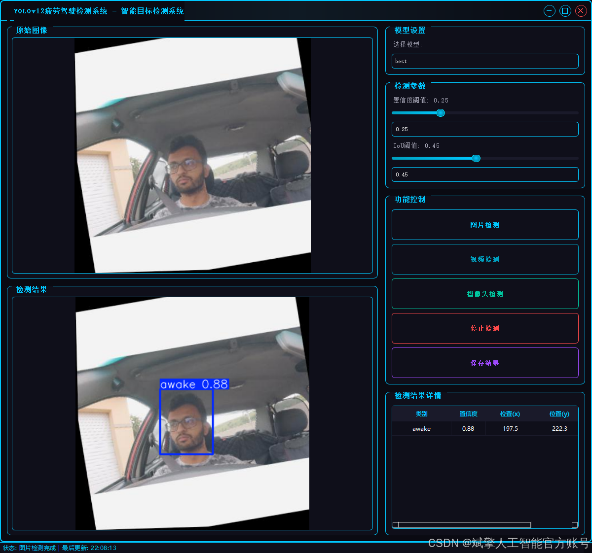 本文介绍了一个基于YOLOv12目标检测算法的疲劳驾驶监测系统。该系统旨在通过实时分析驾驶员面部图像,自动识别其疲劳状态,分为“清醒”和“疲劳”两类,从而为驾驶安全提供有效的技术保障。YOLOv12作为最新的高性能检测模型,兼具速度快、精度高的优点,非常适合部署在车载设备或边缘计算终端上进行实时预警。实验结果表明,本系统在自建数据集上取得了良好的性能,能够有效区分驾驶员的疲劳状态,为预防因疲劳驾驶引发的交通事故提供了可靠的解决方案。