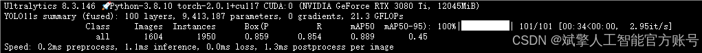 --batch 8:每批次8张图像。--epochs 100:训练100轮。--datasets/data.yaml:数据集配置文件。--weights yolov11s.pt:初始化模型权重,yolov11s.pt是预训练的轻量级YOLO模型。