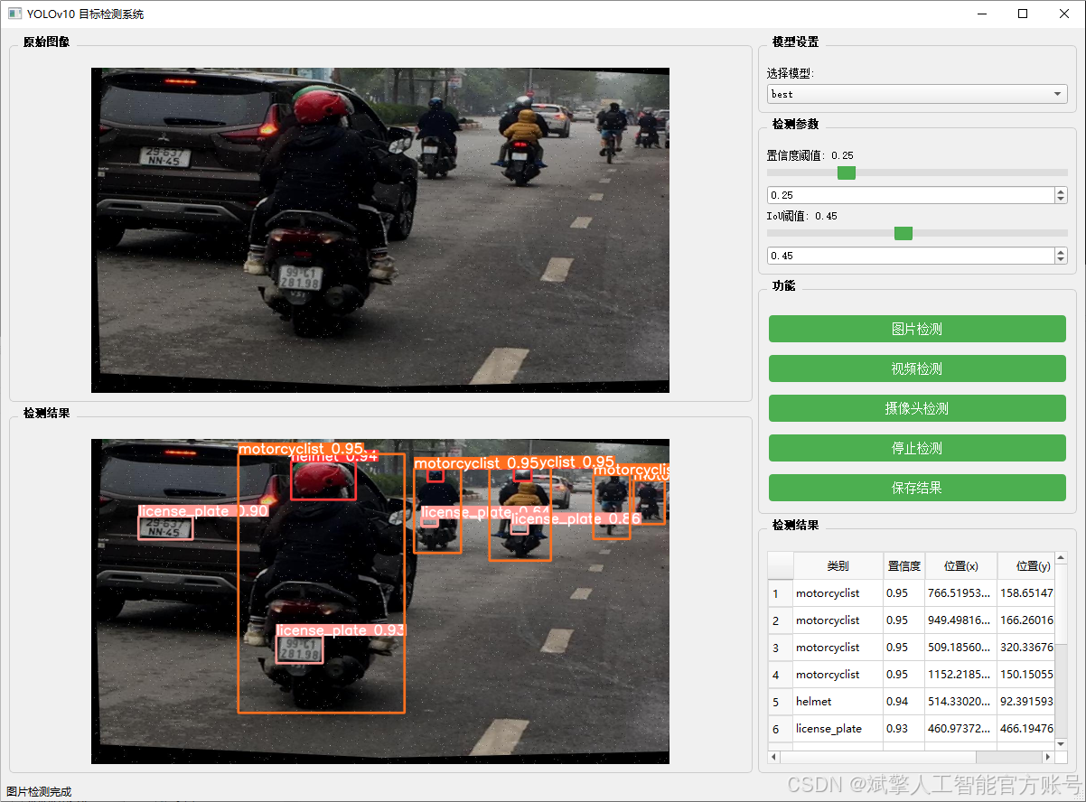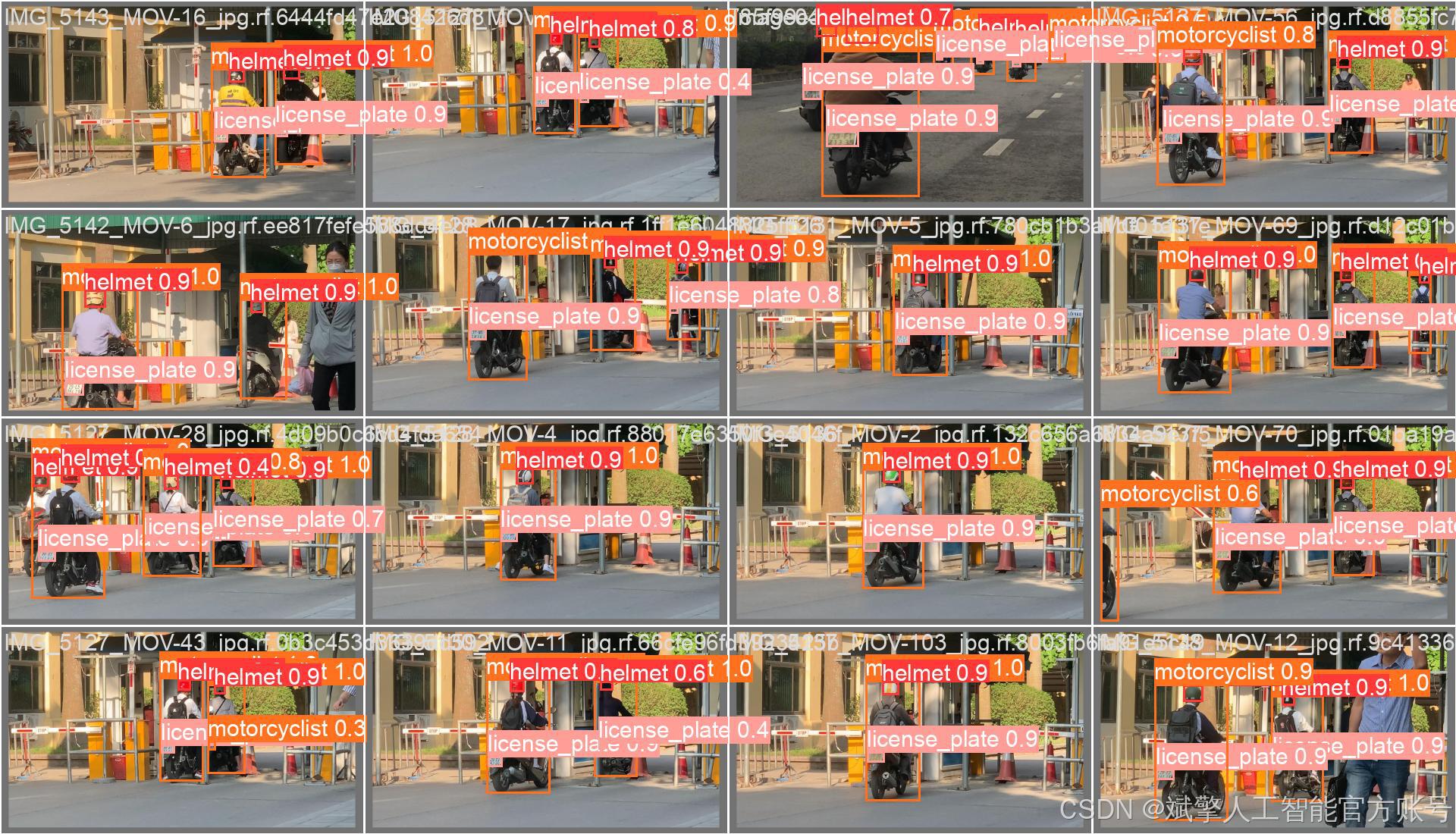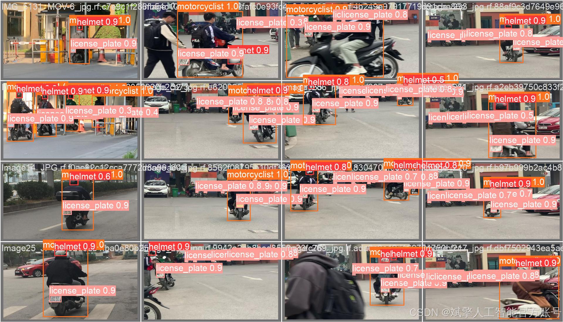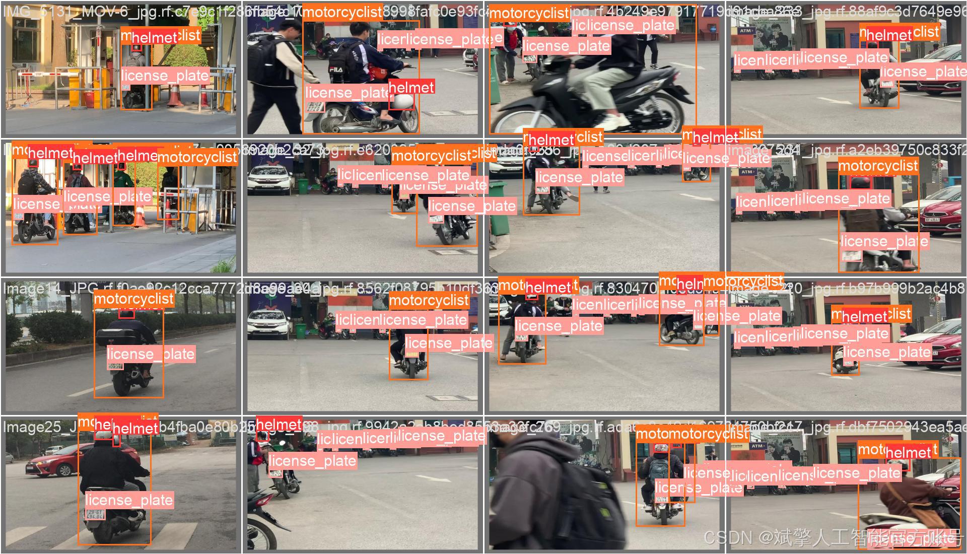 本项目基于YOLOv10目标检测算法,开发了一套专注于交通场景下骑手安全装备合规性检测的系统。模型共检测三类目标:佩戴的头盔(helmet)、摩托车车牌(license_plate)以及摩托车骑手(motorcyclist),类别数nc=3。该系统可同时对骑手、头盔及车牌进行实时定位,核心应用价值在于自动监控骑手是否按规定佩戴头盔,为智慧交通管理、违章自动执法及骑手安全督导提供有效的技术解决方案。项目采用最新的YOLOv10模型,在保持高推理速度的同时,显著提升了小目标的检测精度。