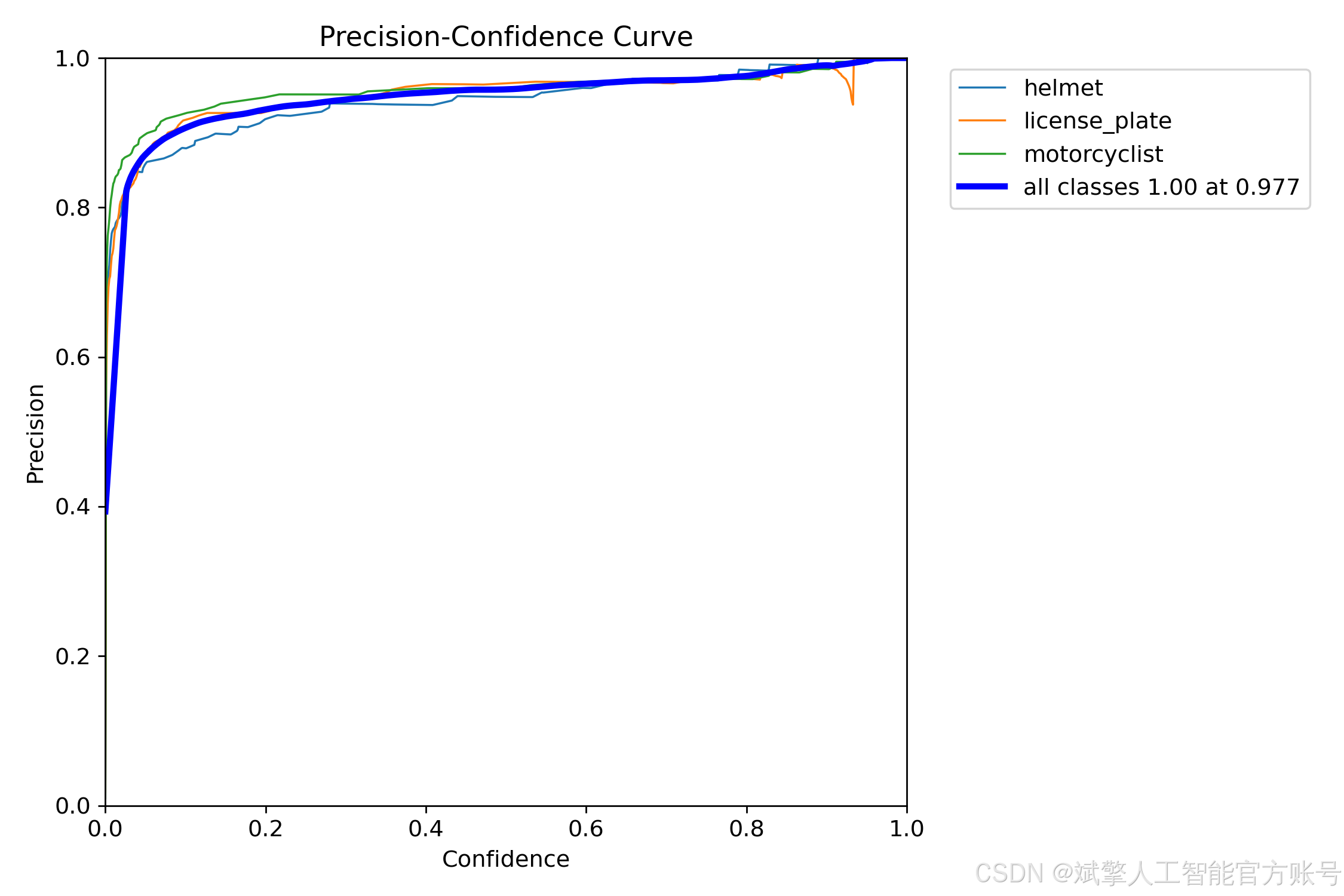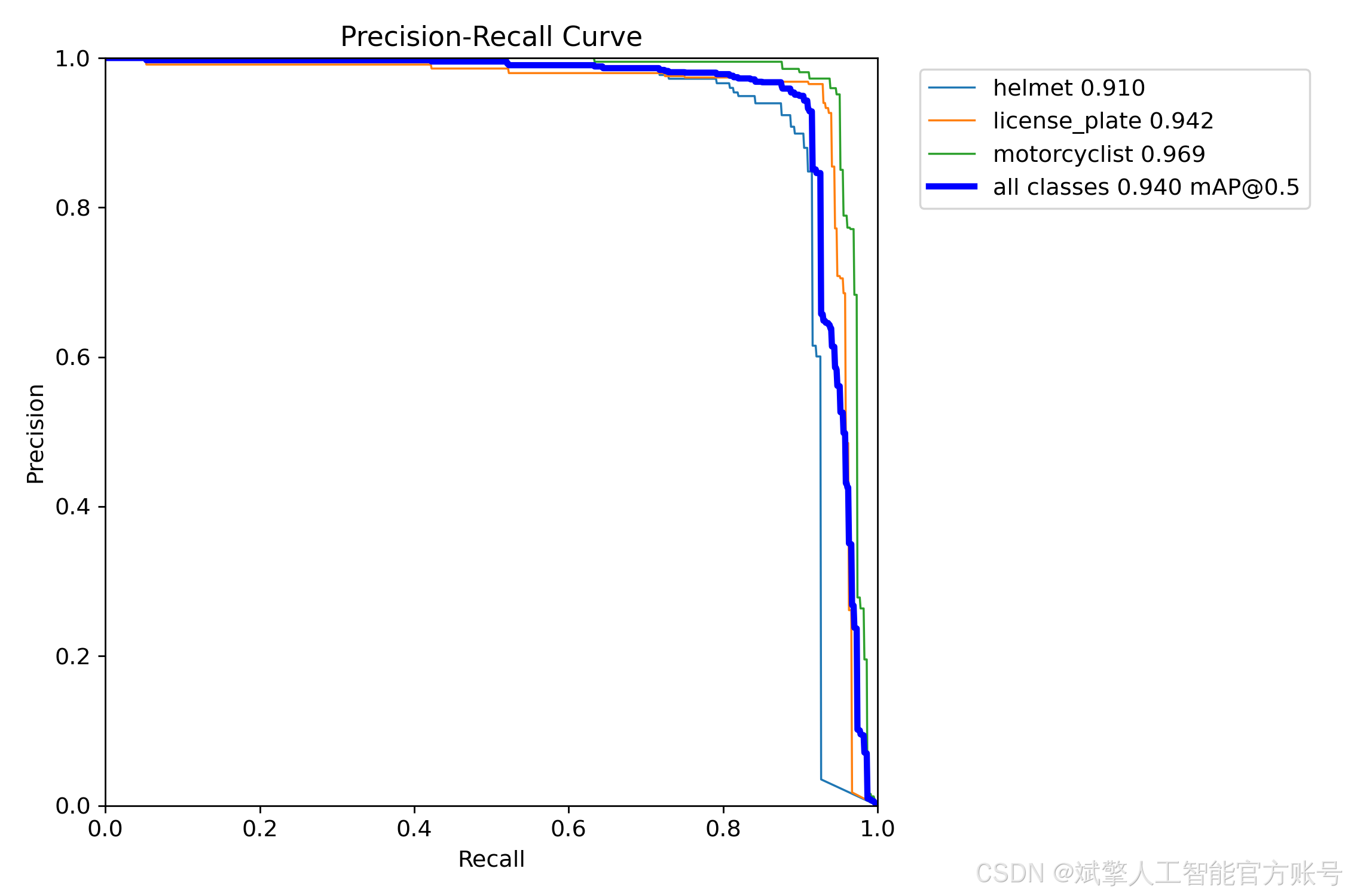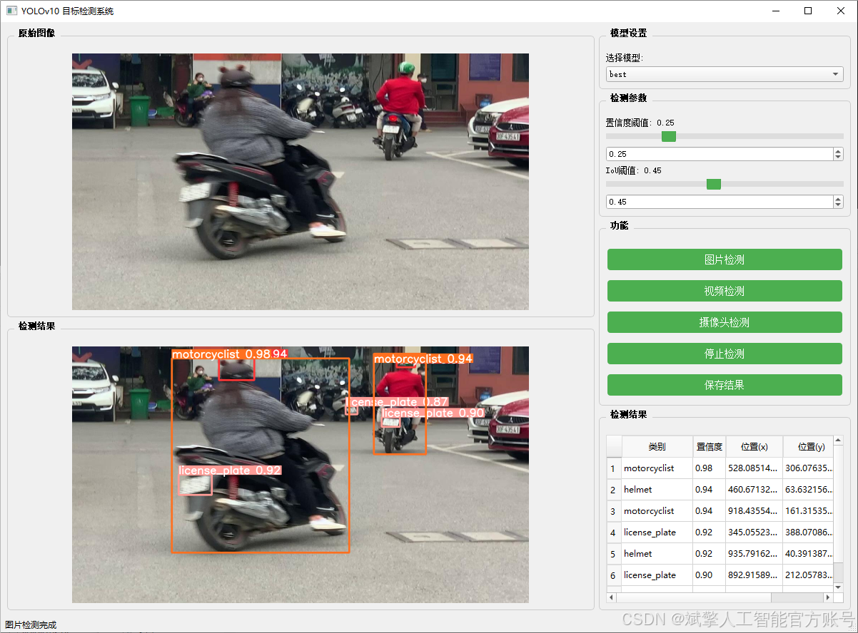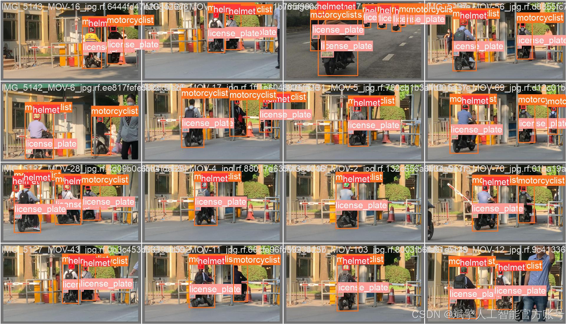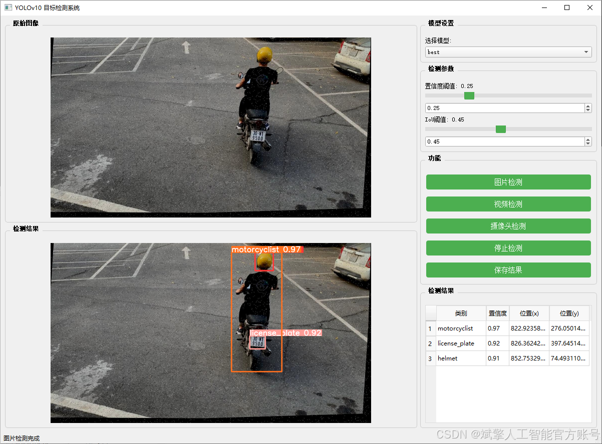 本项目基于YOLOv10目标检测算法,开发了一套专注于交通场景下骑手安全装备合规性检测的系统。模型共检测三类目标:佩戴的头盔(helmet)、摩托车车牌(license_plate)以及摩托车骑手(motorcyclist),类别数nc=3。该系统可同时对骑手、头盔及车牌进行实时定位,核心应用价值在于自动监控骑手是否按规定佩戴头盔,为智慧交通管理、违章自动执法及骑手安全督导提供有效的技术解决方案。项目采用最新的YOLOv10模型,在保持高推理速度的同时,显著提升了小目标的检测精度。