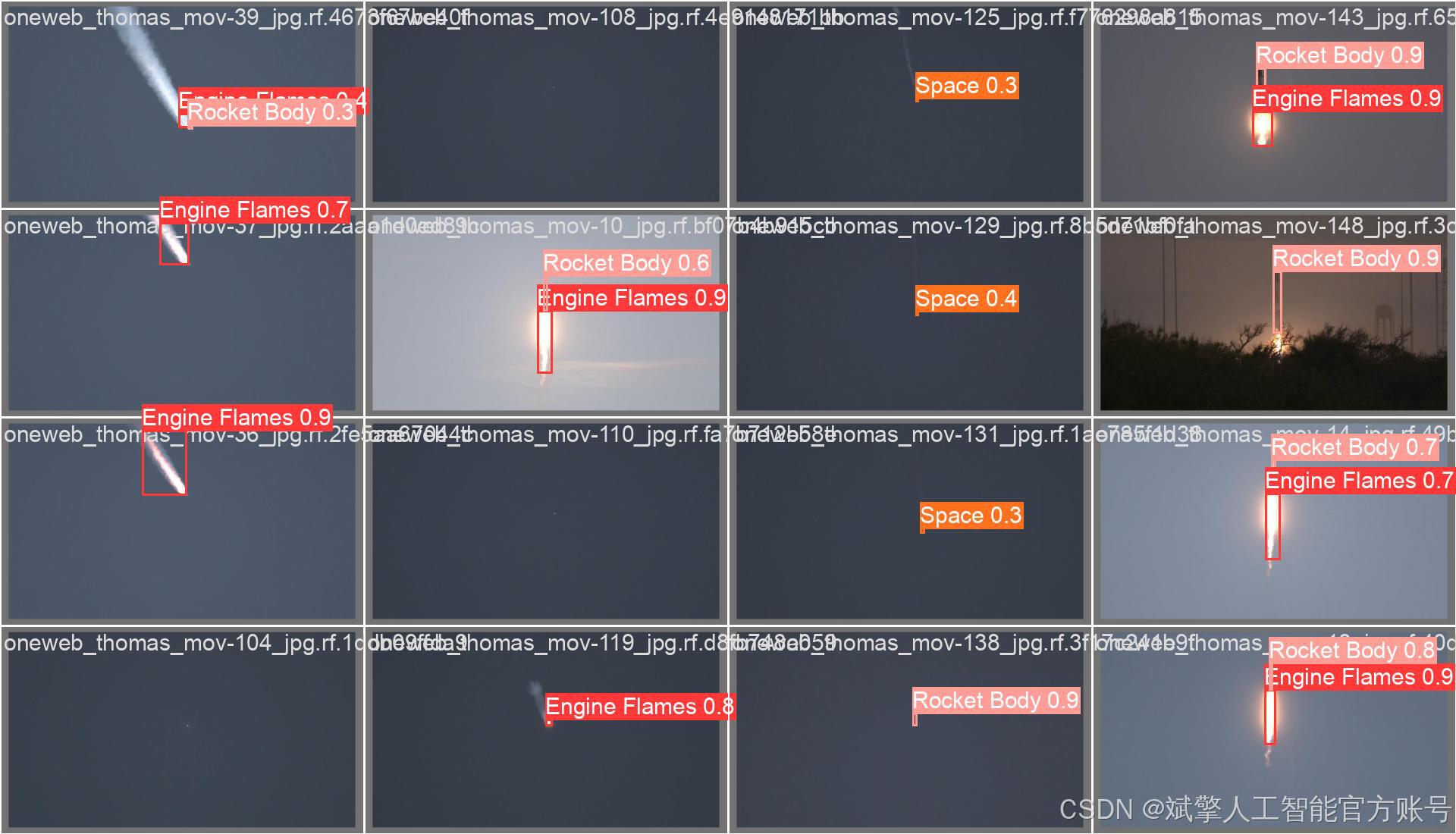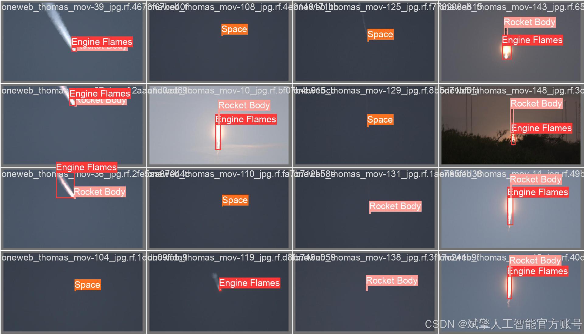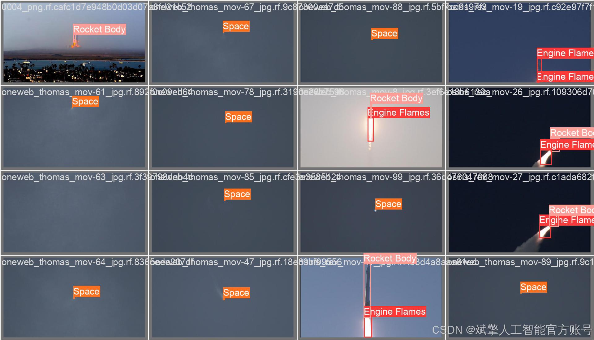 本项目采用了大规模高质量标注数据集,总计包含28,149张图像,其中训练集24,435张、验证集2,428张、测试集1,286张。数据集经过专业标注,涵盖多样化的火箭发射场景、不同光照条件和拍摄角度,确保模型的泛化能力和鲁棒性。每张图像均标注了上述三个类别(Engine Flames, Rocket Body, Space)的边界框,数据平衡性经过优化,能够有效支持模型学习各类别的特征表达,为YOLOv10模型的训练和评估提供了充分的数据基础。