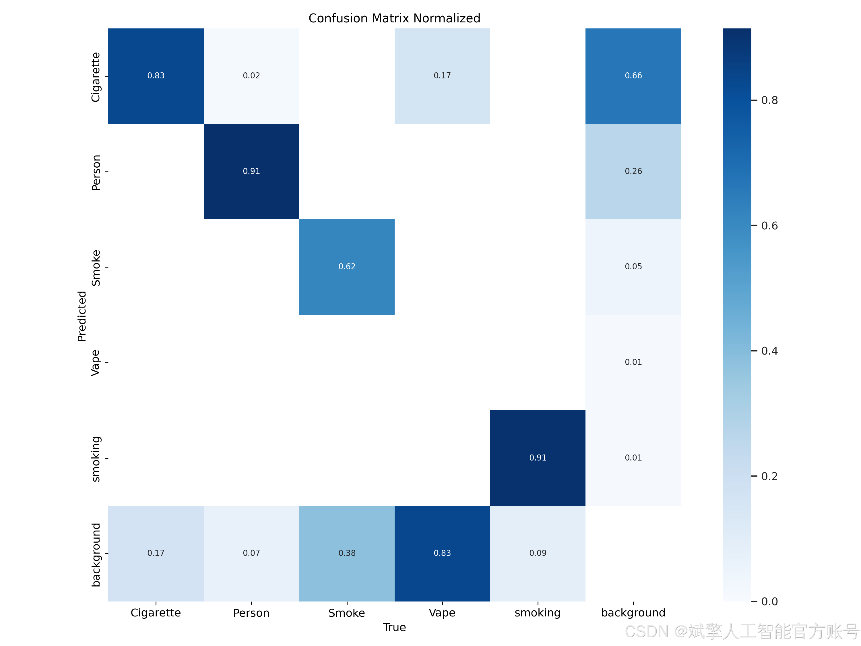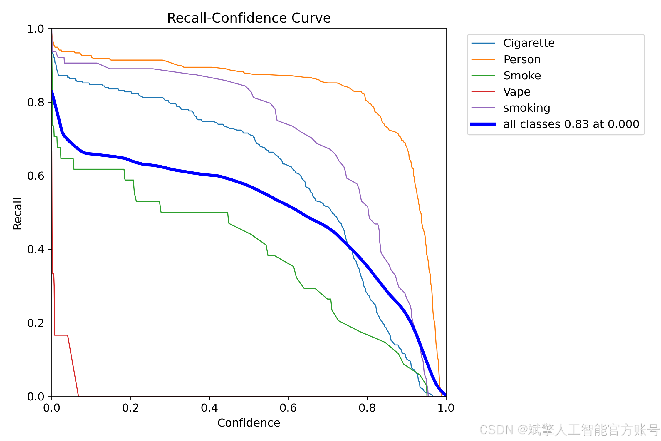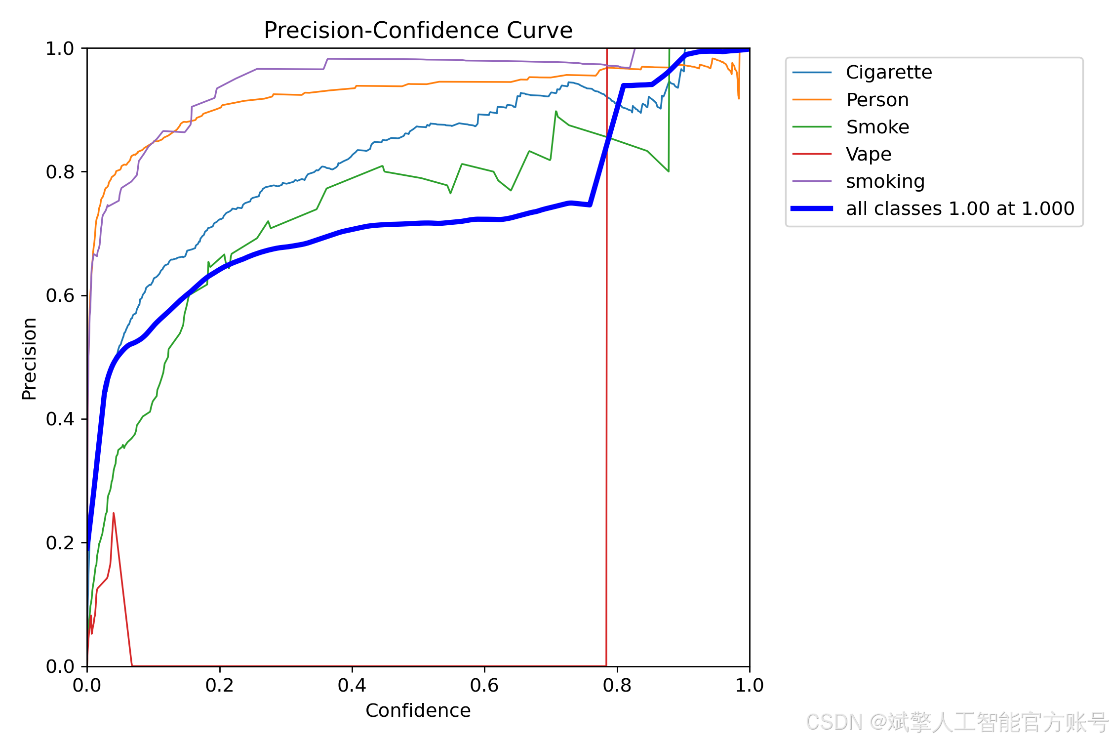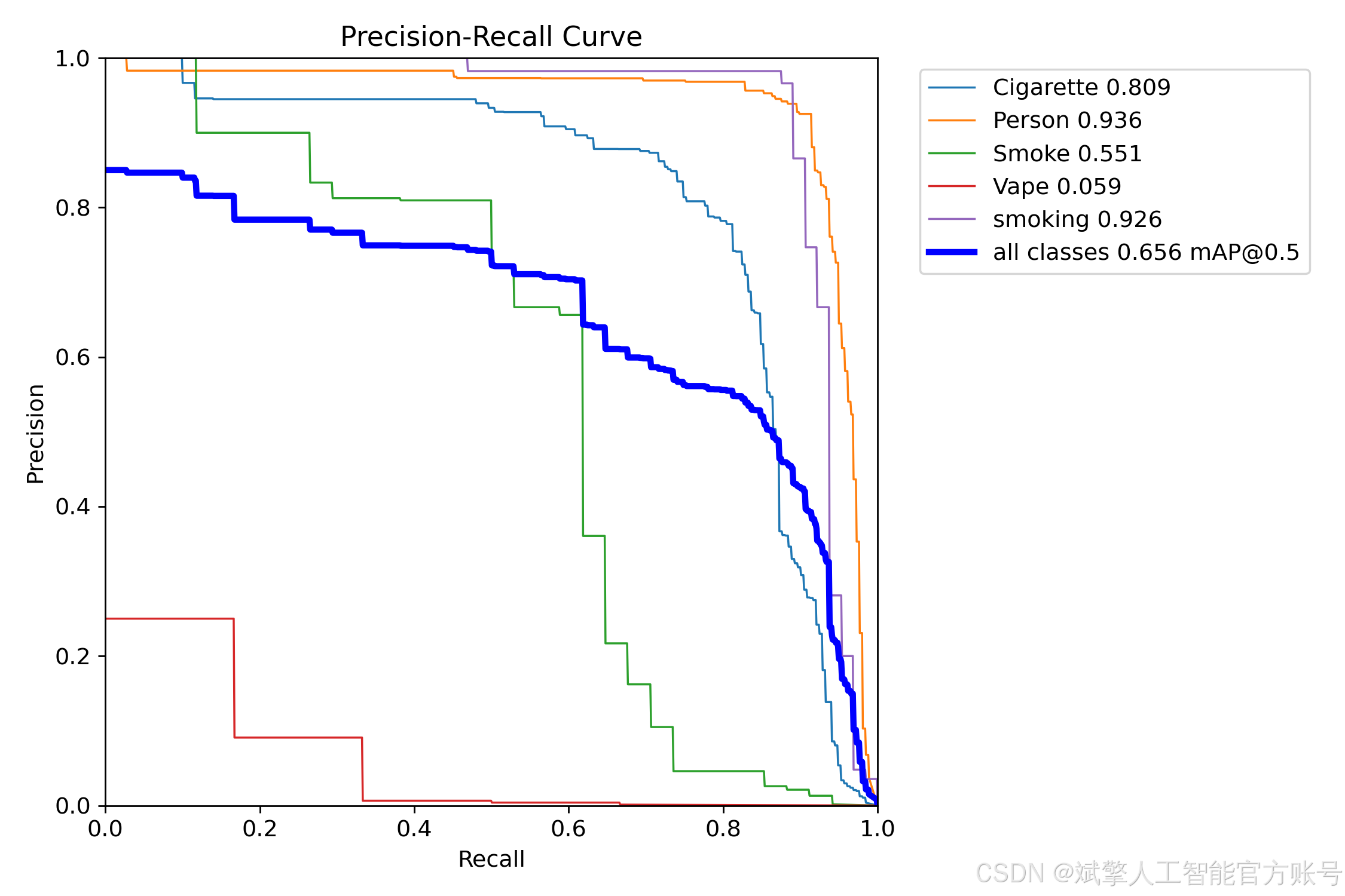 本项目基于YOLOv10目标检测算法开发了一套高性能吸烟行为识别系统,主要用于实时检测吸烟相关目标。模型采用nc=5的五分类架构,能够精准识别香烟(Cigarette)、人员(Person)、烟雾(Smoke)、电子烟(Vape)和吸烟动作(smoking)五大关键目标。系统通过多目标关联检测技术,不仅能识别吸烟相关物体,还能结合人员与香烟/电子烟的交互状态进行行为判断,可部署于安防监控、智能巡检等实际场景,为公共场所禁烟管理提供自动化监管解决方案。该模型在保证检测精度的同时兼顾实时性需求,支持GPU加速推理,具备较强的工程应用价值。