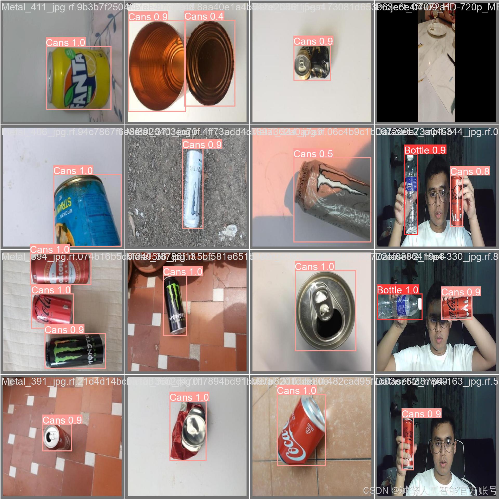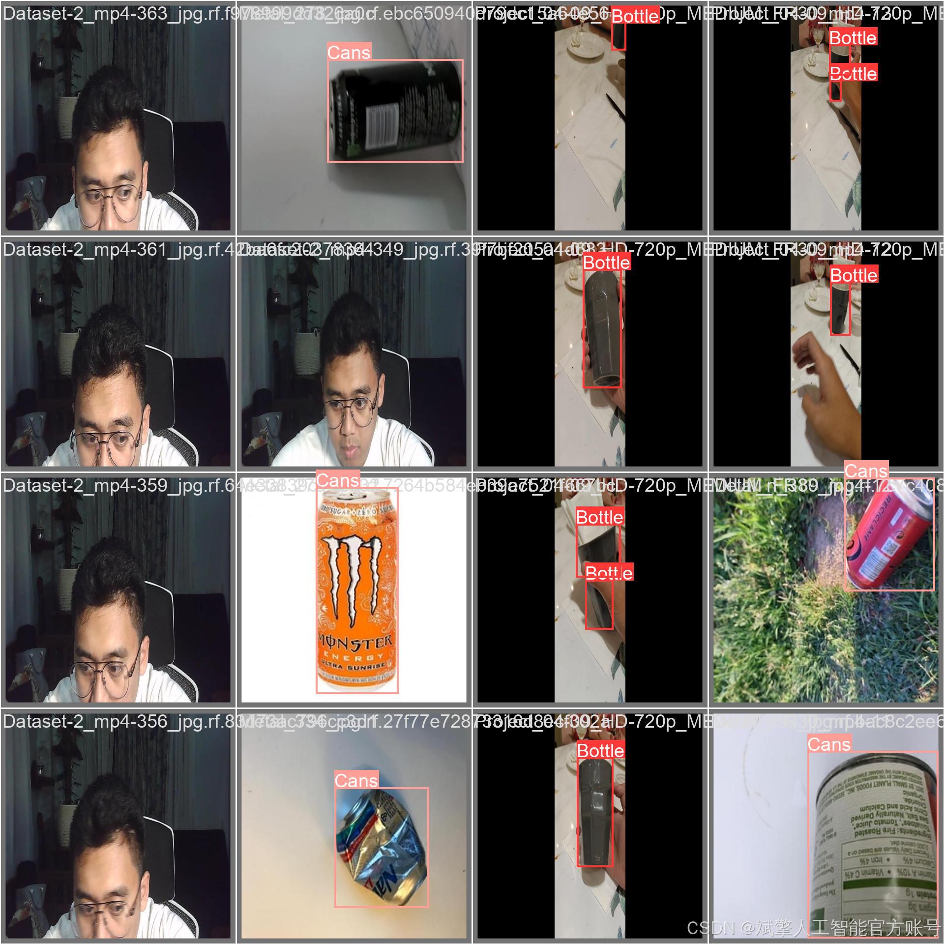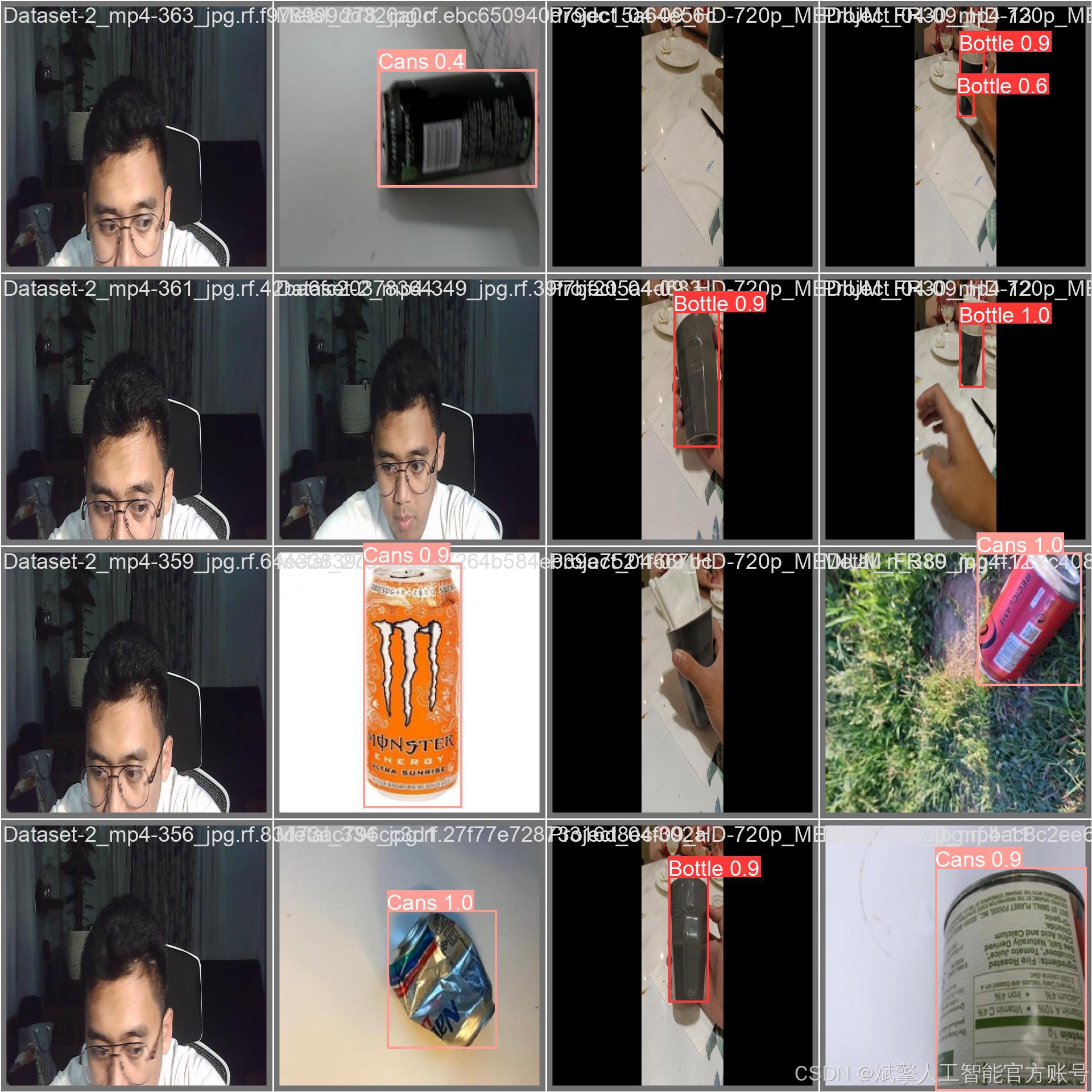 本项目使用的数据集共包含7,967张高质量标注图像,严格划分为训练集(5,553张)、验证集(1,474张)和测试集(940张),数据划分比例符合机器学习项目最佳实践。数据集涵盖室内、室外、工业场景等多种环境,包含不同光照条件、摆放姿态及部分遮挡的塑料瓶和金属罐样本,确保了模型的泛化能力。标签类别为两类:Bottle(塑料瓶)和Cans(金属罐)。数据集的规模和质量为模型训练提供了充分保障,避免了过拟合风险,同时测试集的独立设计为模型性能评估提供了客观依据。