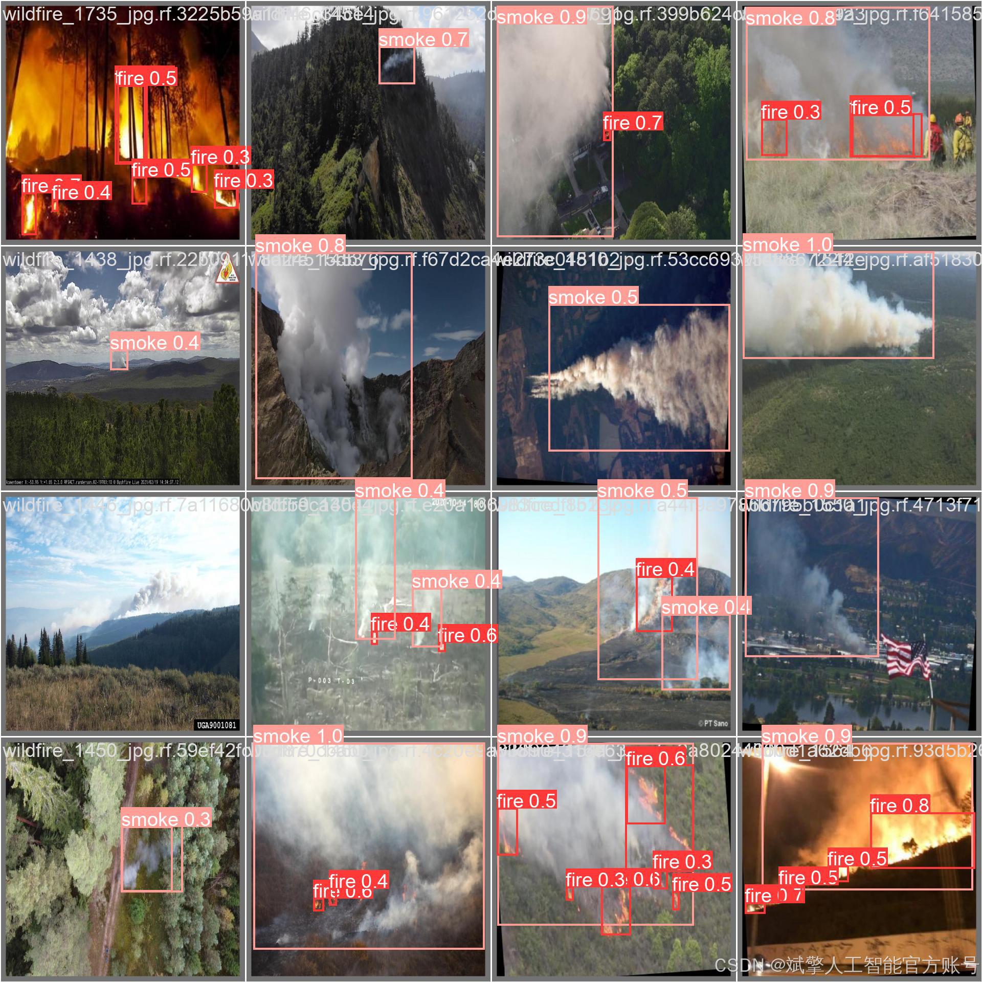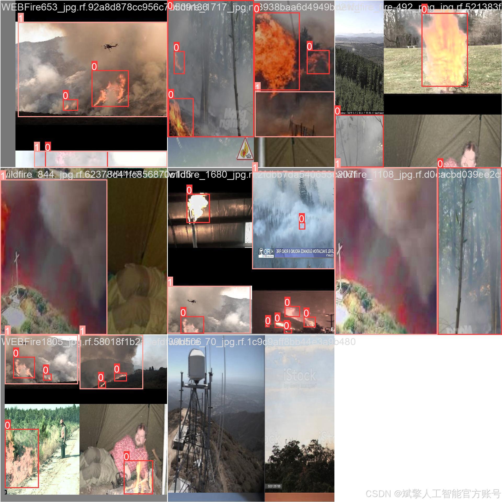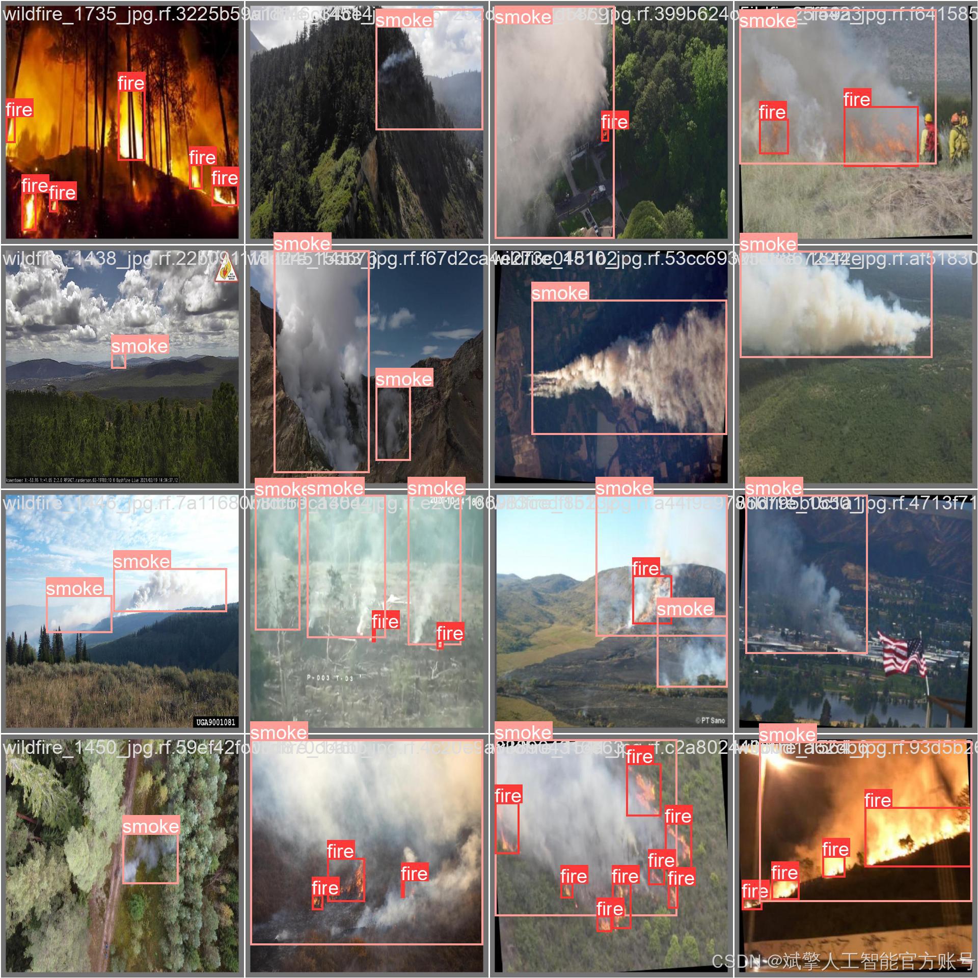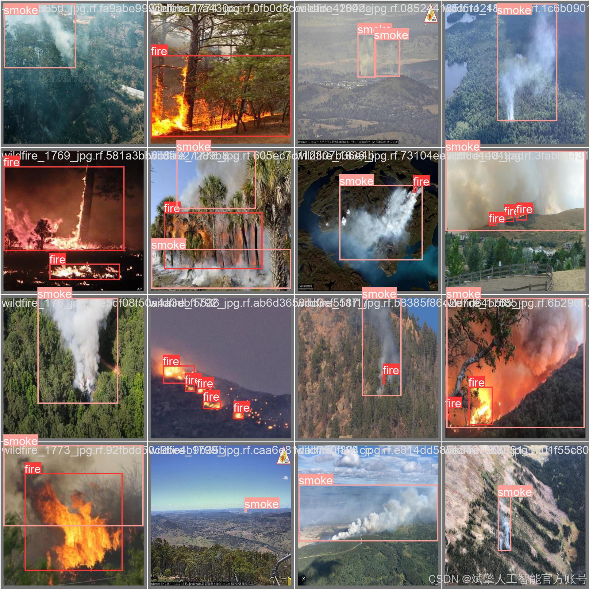 本系统所使用的数据集共包含2604张高质量图像,严格划分为训练集(2083张)、验证集(260张)和测试集(261张),数据划分比例符合机器学习典型实践(约8:1:1)。所有图像均来源于真实野外场景,覆盖白天、黄昏、夜间等多种光照条件,以及不同季节和植被类型的环境背景。包含'fire'(火焰)和'smoke'(烟雾)两类标注框,其中火焰标注聚焦于明火区域,烟雾标注则涵盖扩散状、半透明等复杂形态。