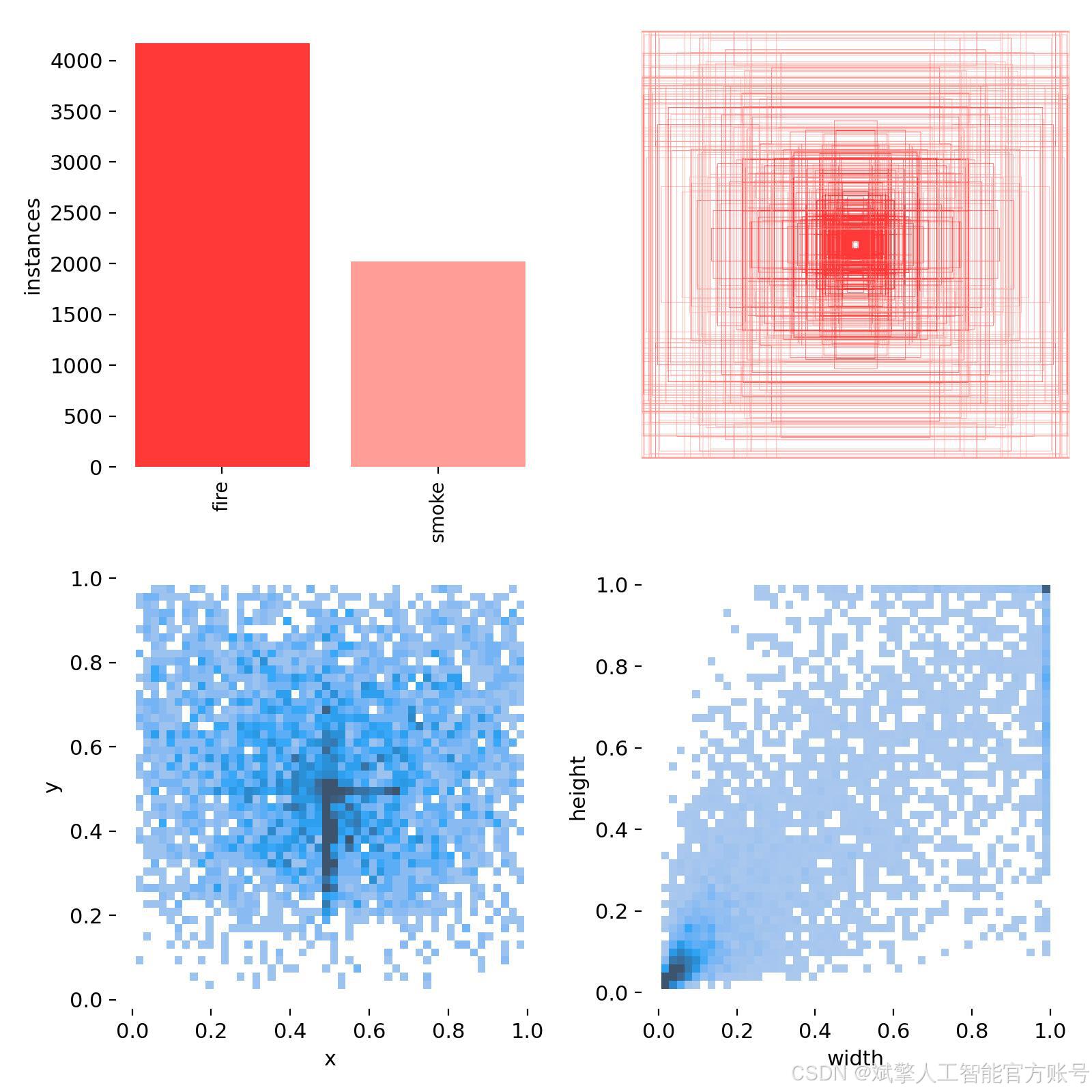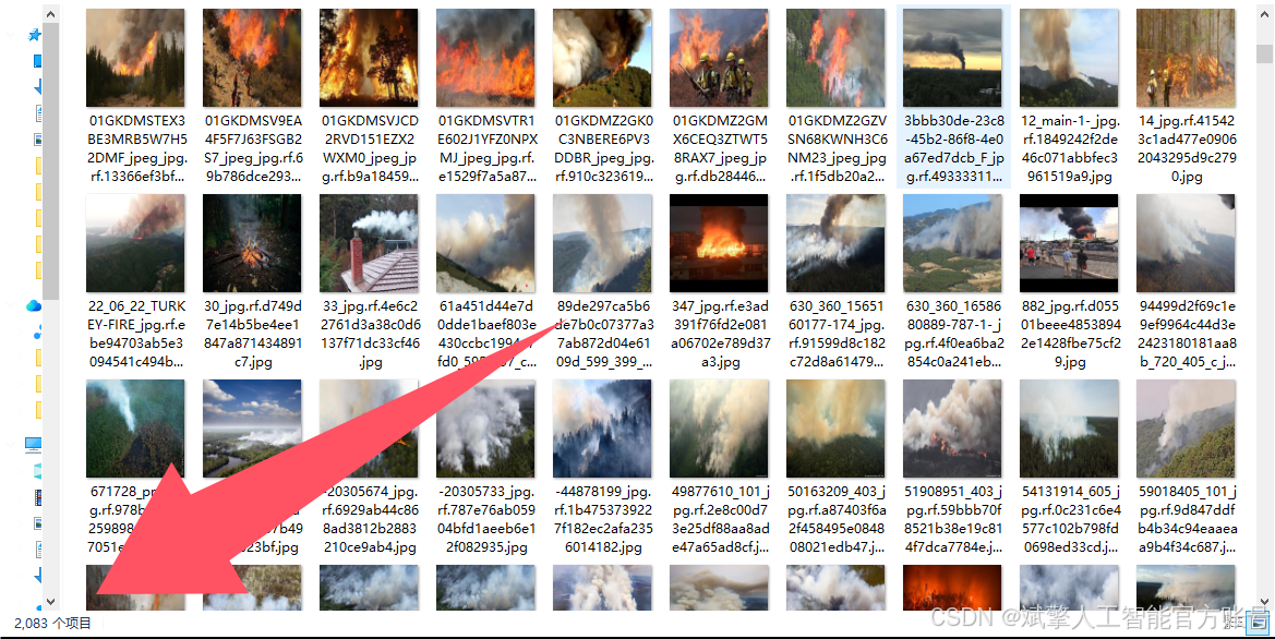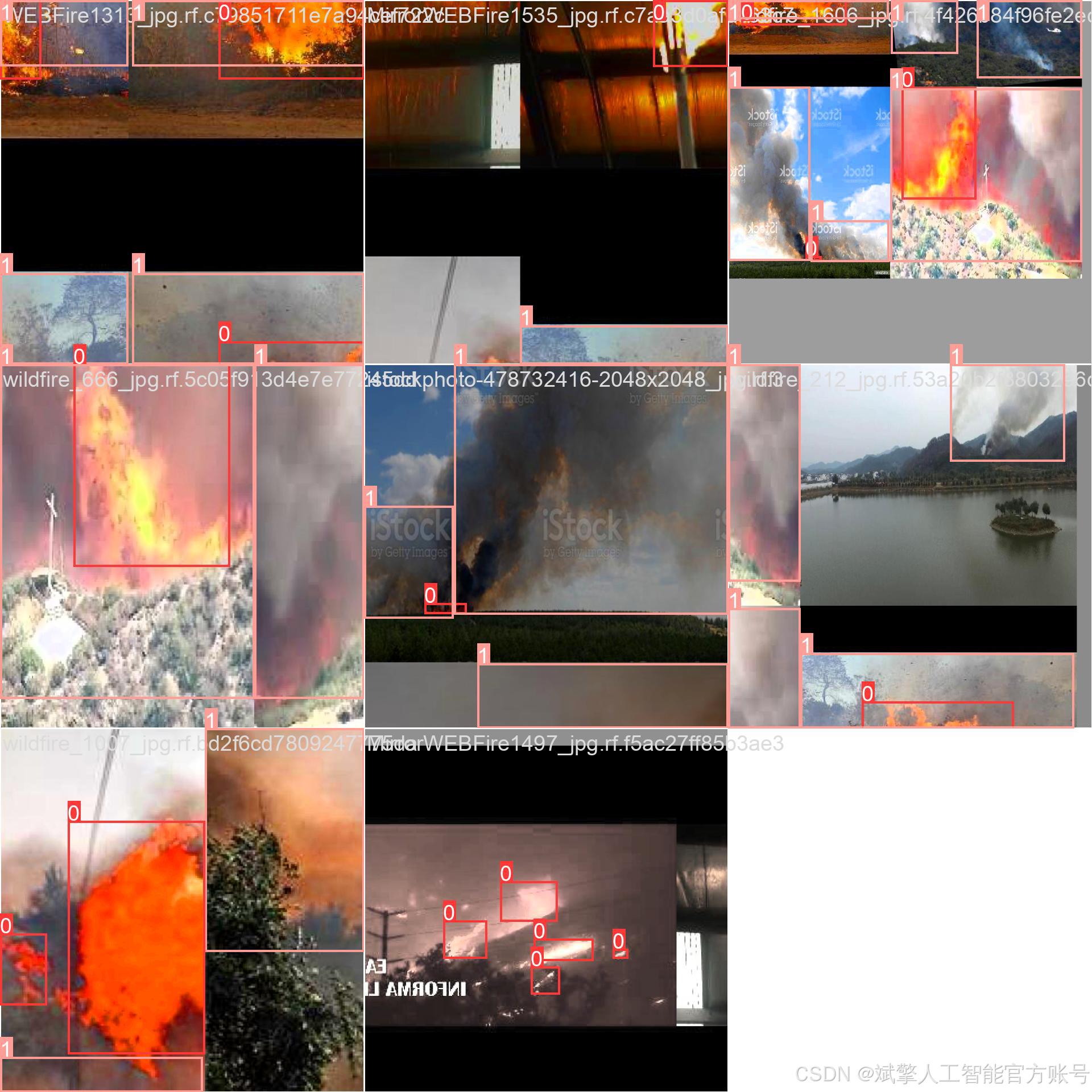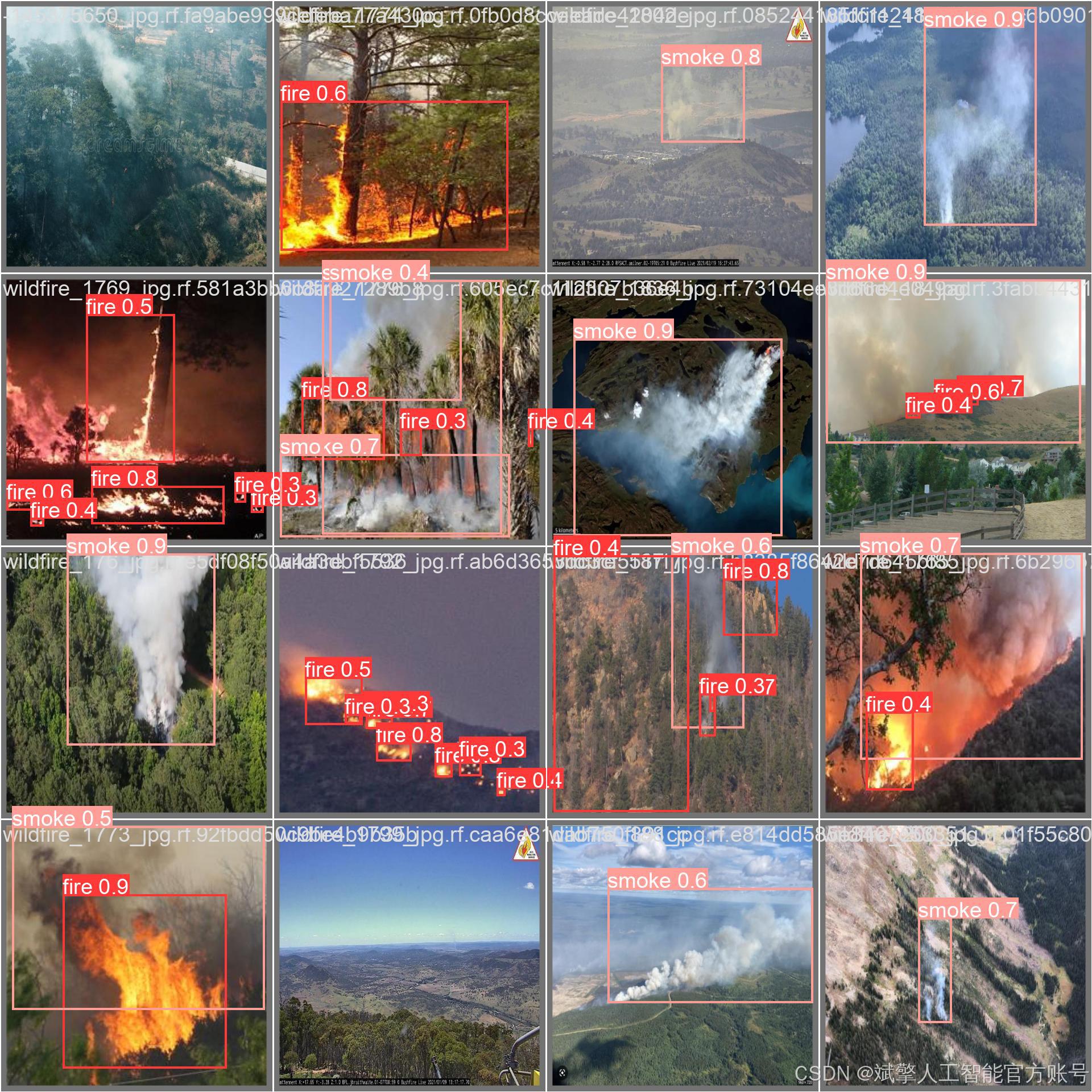 本系统所使用的数据集共包含2604张高质量图像,严格划分为训练集(2083张)、验证集(260张)和测试集(261张),数据划分比例符合机器学习典型实践(约8:1:1)。所有图像均来源于真实野外场景,覆盖白天、黄昏、夜间等多种光照条件,以及不同季节和植被类型的环境背景。包含'fire'(火焰)和'smoke'(烟雾)两类标注框,其中火焰标注聚焦于明火区域,烟雾标注则涵盖扩散状、半透明等复杂形态。