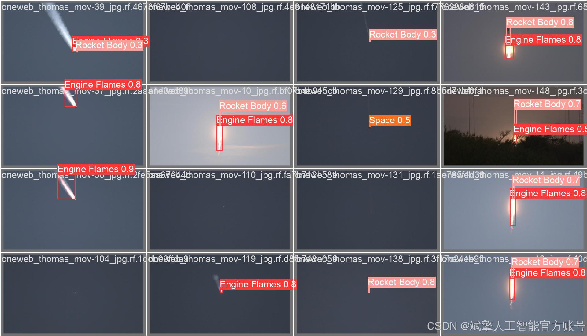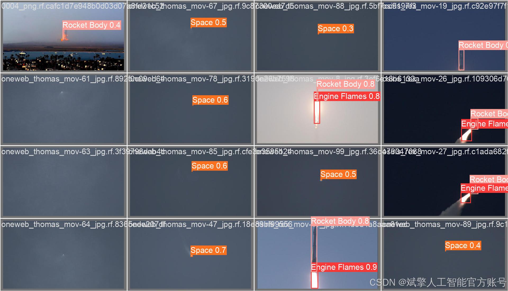 数据集共包含28,149张高质量标注图像,其中训练集24,435张、验证集2,428张、测试集1,286张。数据覆盖不同发射场景、光照条件和视角变化,包含火箭点火、升空、分离等阶段的图像数据。所有样本均采用YOLO格式标注。