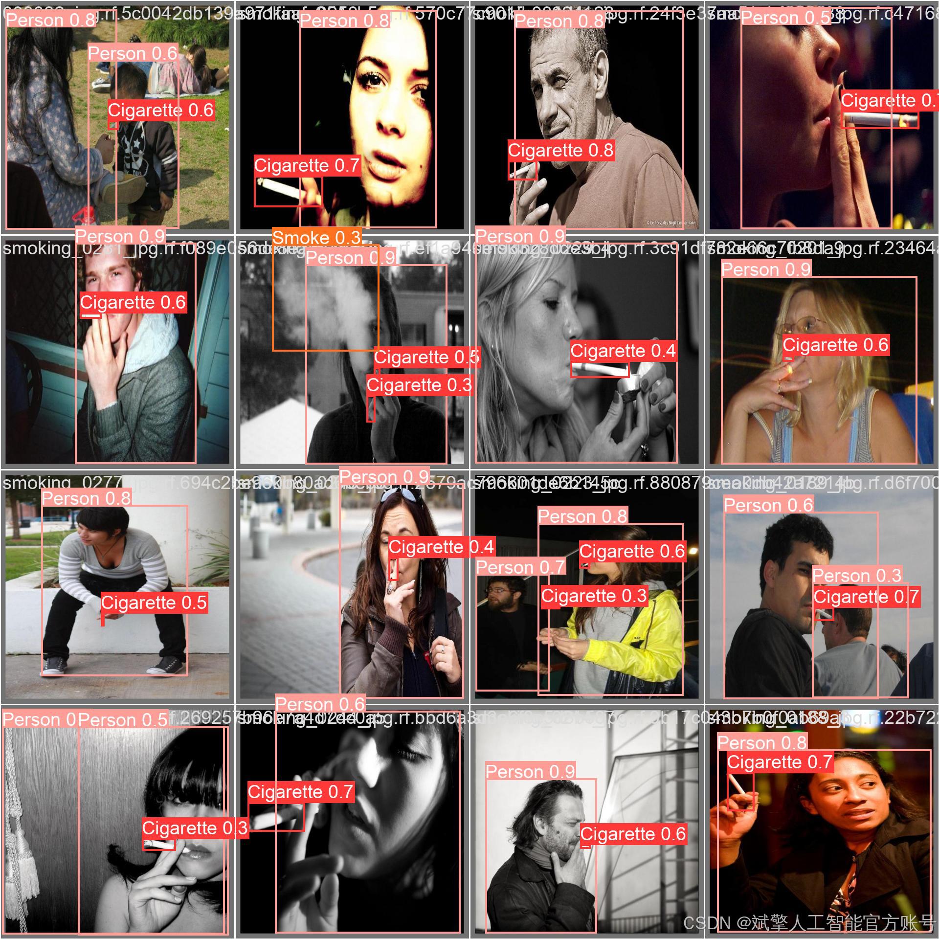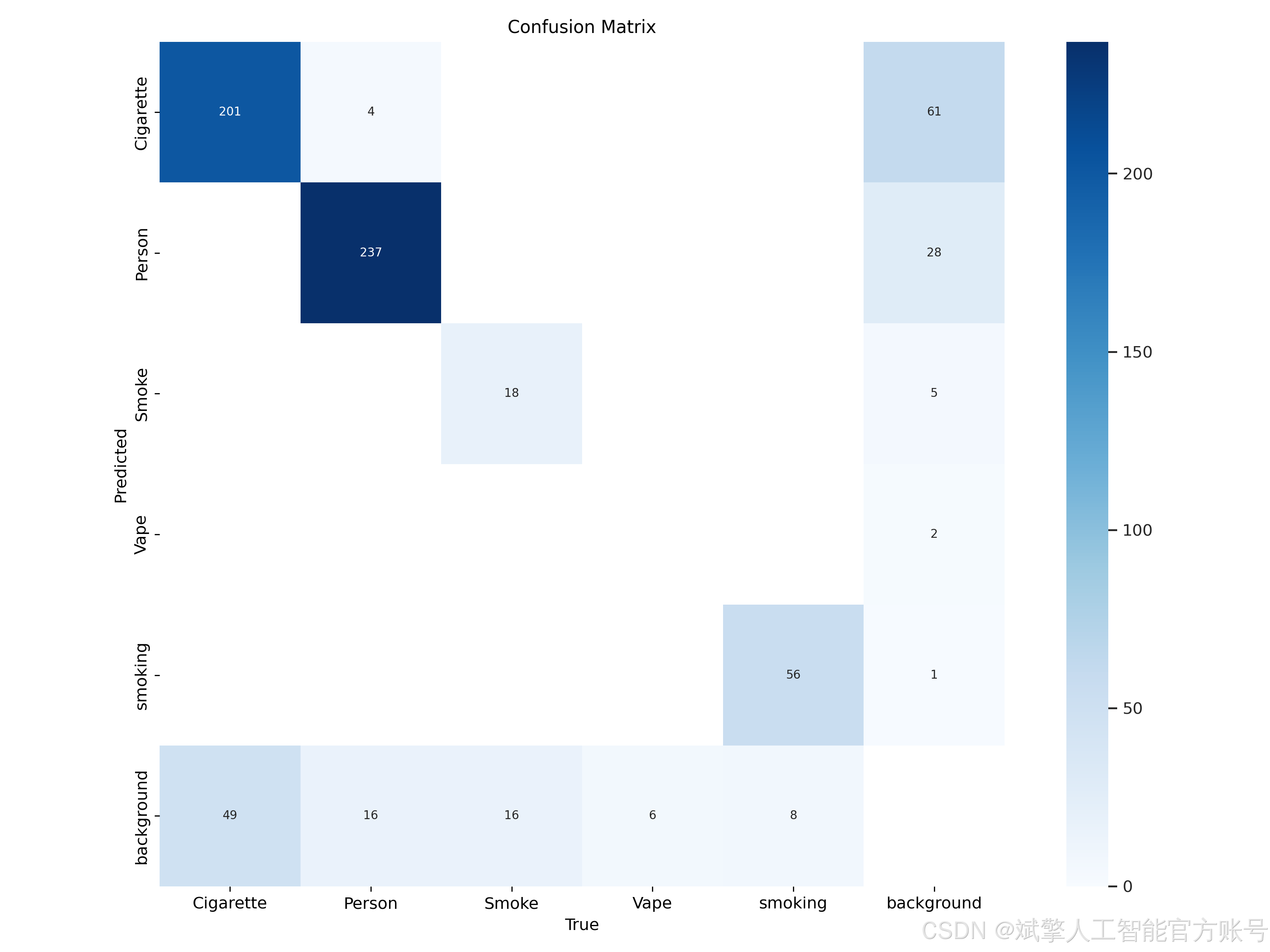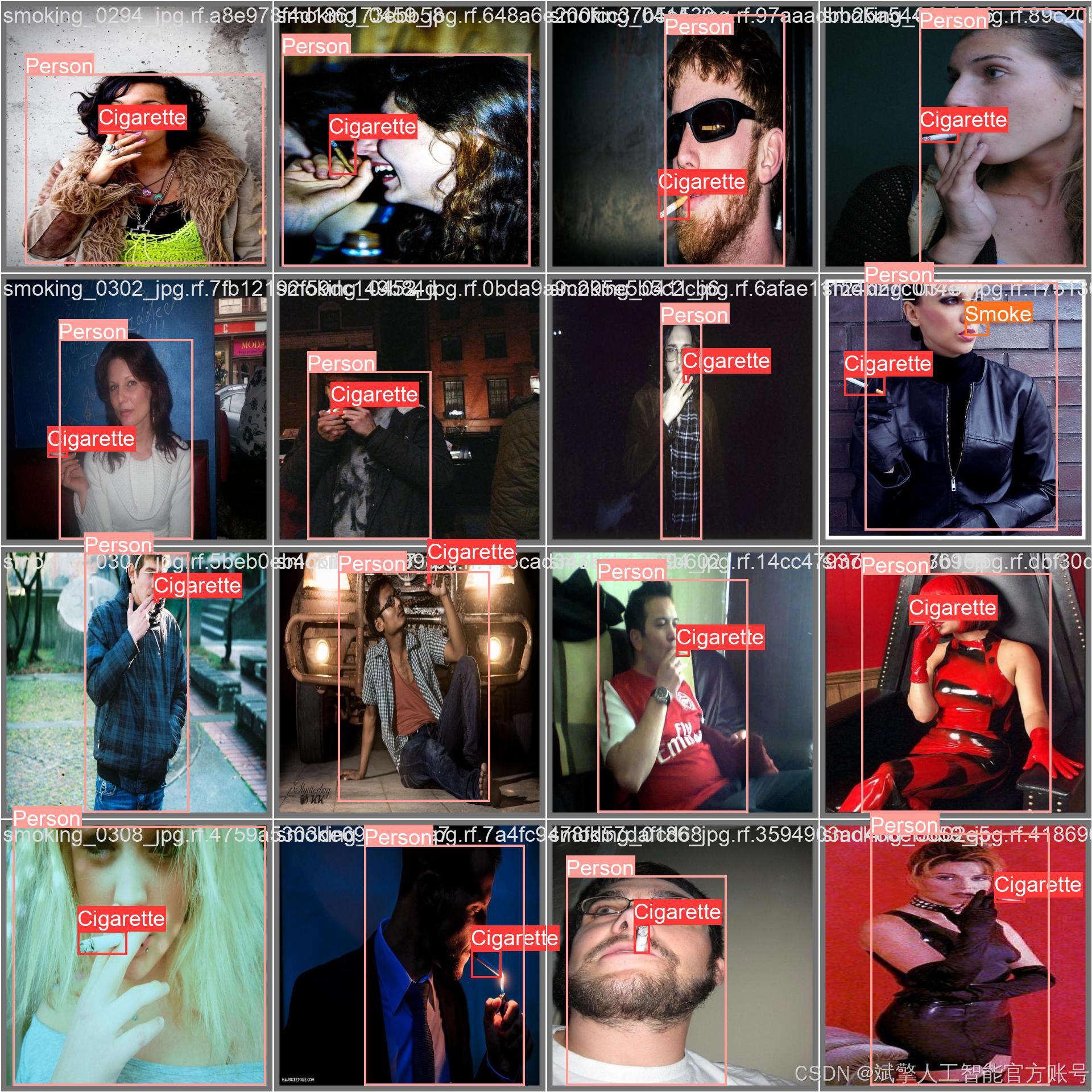 本项目基于YOLOv8目标检测算法构建了一个吸烟行为识别系统,旨在精准检测吸烟相关目标。模型共支持五类目标检测:香烟(Cigarette)、人体(Person)、烟雾(Smoke)、电子烟(Vape)以及吸烟动作(smoking),通过多目标协同检测提升吸烟行为识别的准确性与可靠性。该系统可应用于公共场所智能监控、安全生产管理等场景,实现对吸烟行为的自动化实时监测与预警。