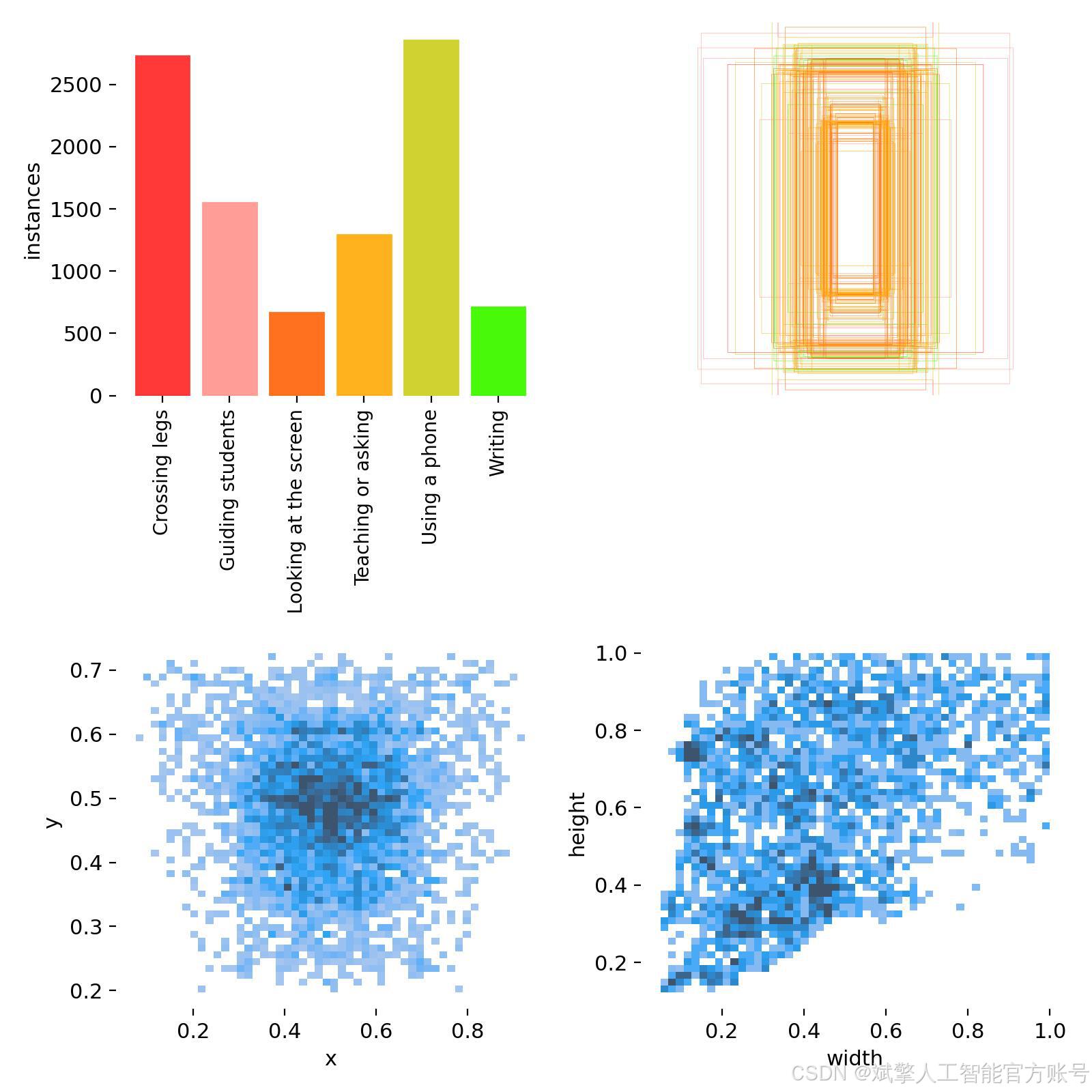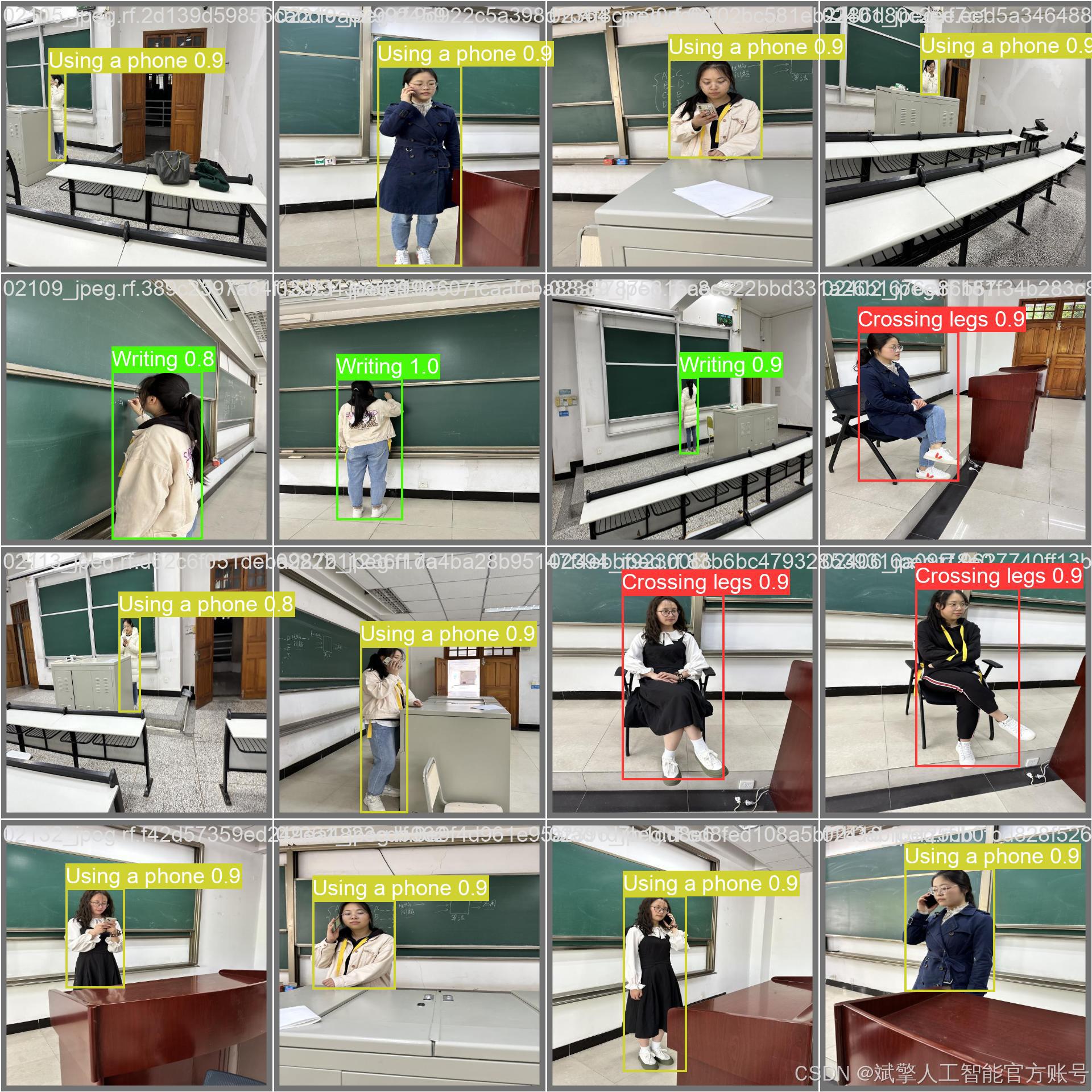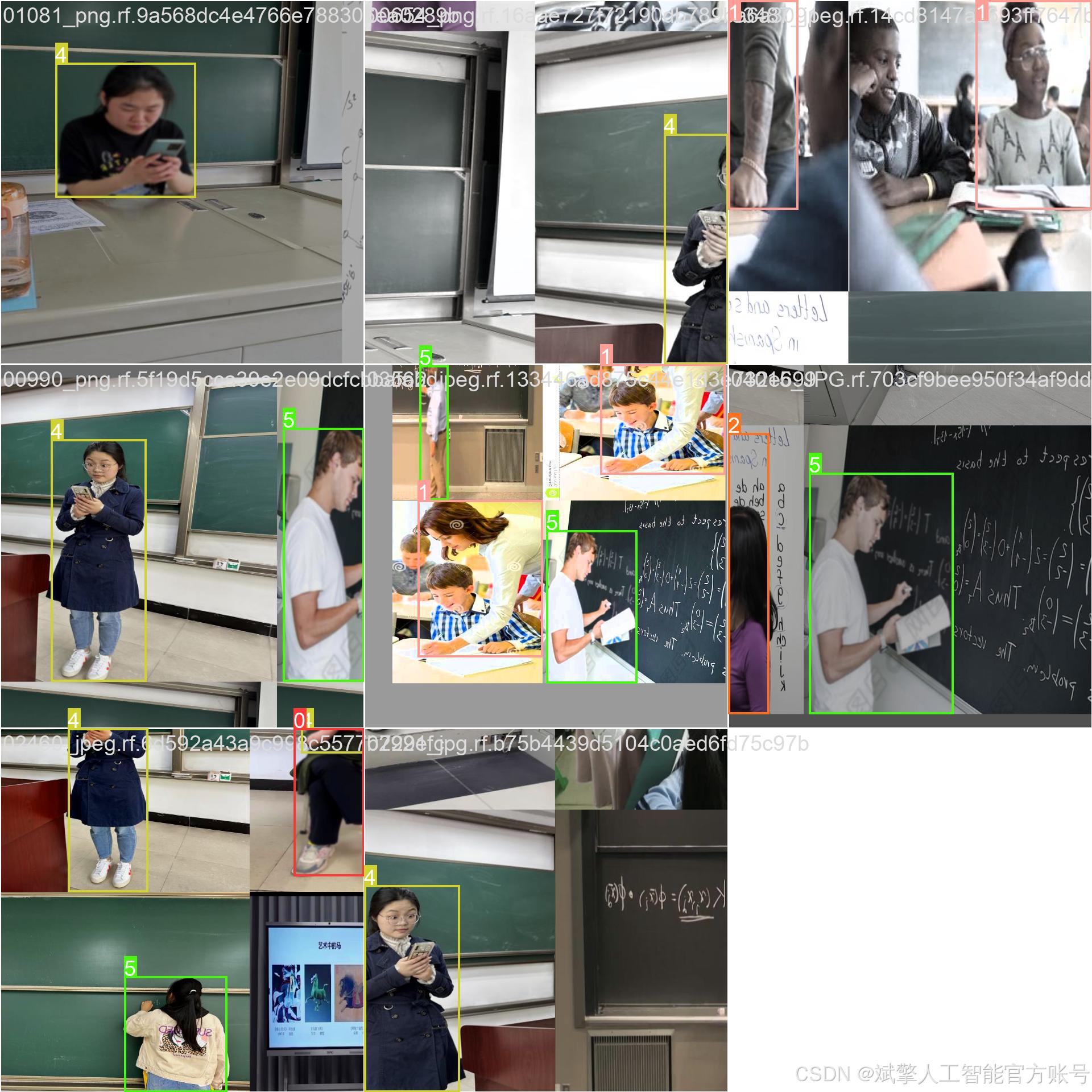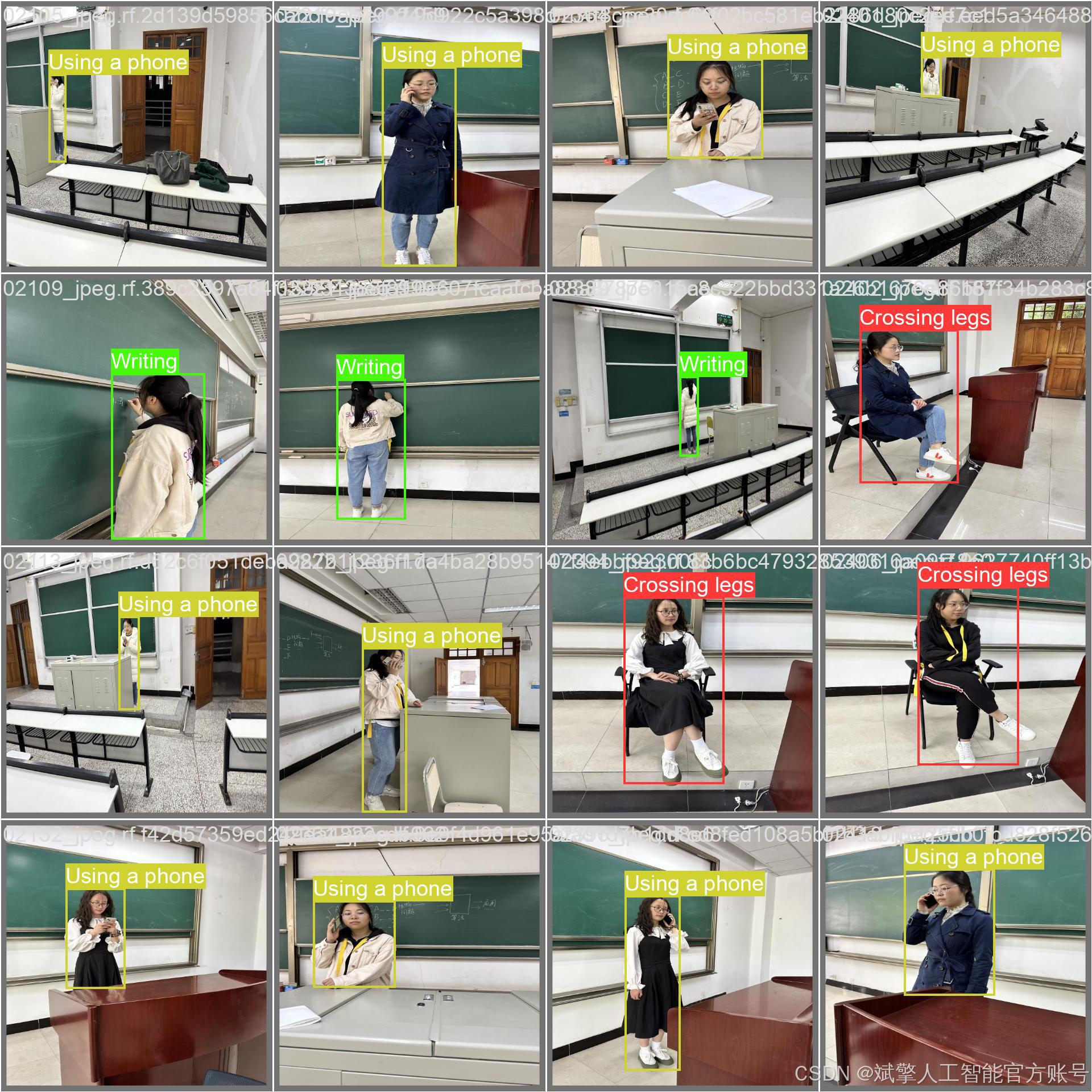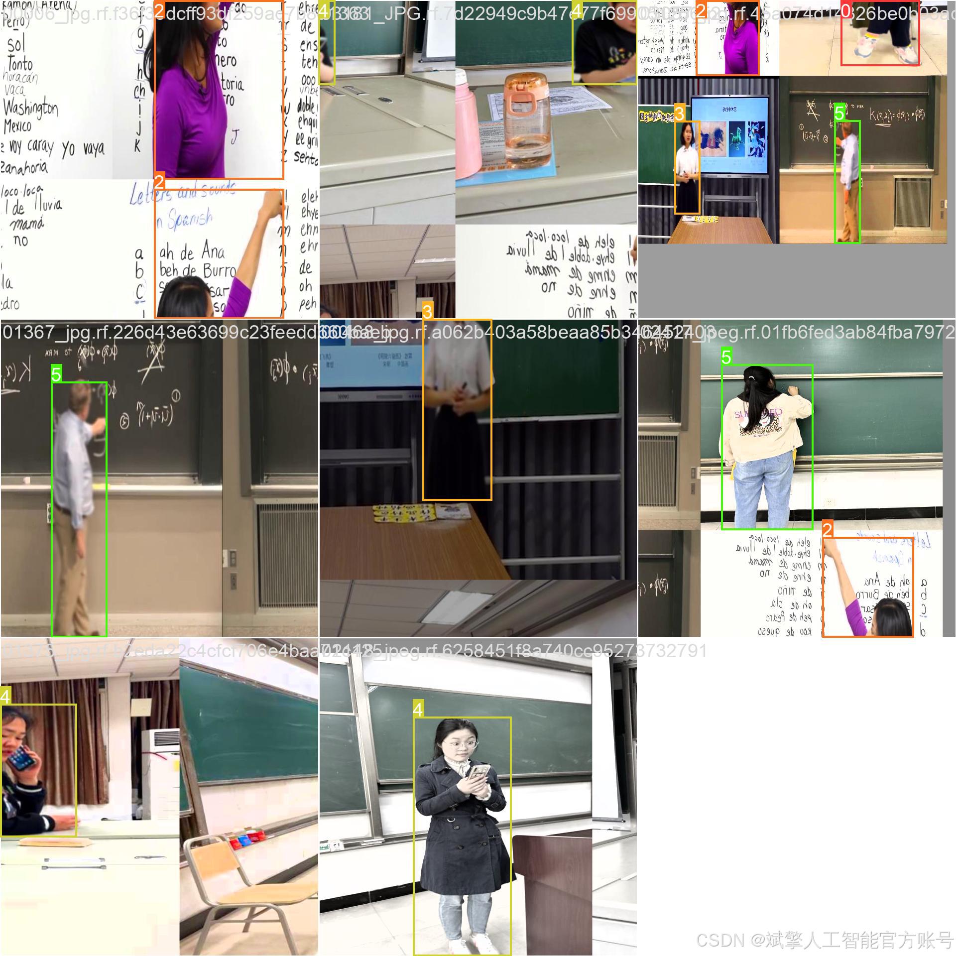 本系统使用的数据集包含总计9,820张标注图像,其中训练集8,843张、验证集617张、测试集360张,均按6类行为进行精细标注。数据覆盖多种教学场景(如教室、讲台、多媒体环境),包含不同光照、角度和动作姿态,保证了模型的泛化能力。标注文件采用YOLO格式,每张图像均包含边界框与类别标签,经数据增强后进一步提升了数据多样性,为模型鲁棒性训练奠定了基础。