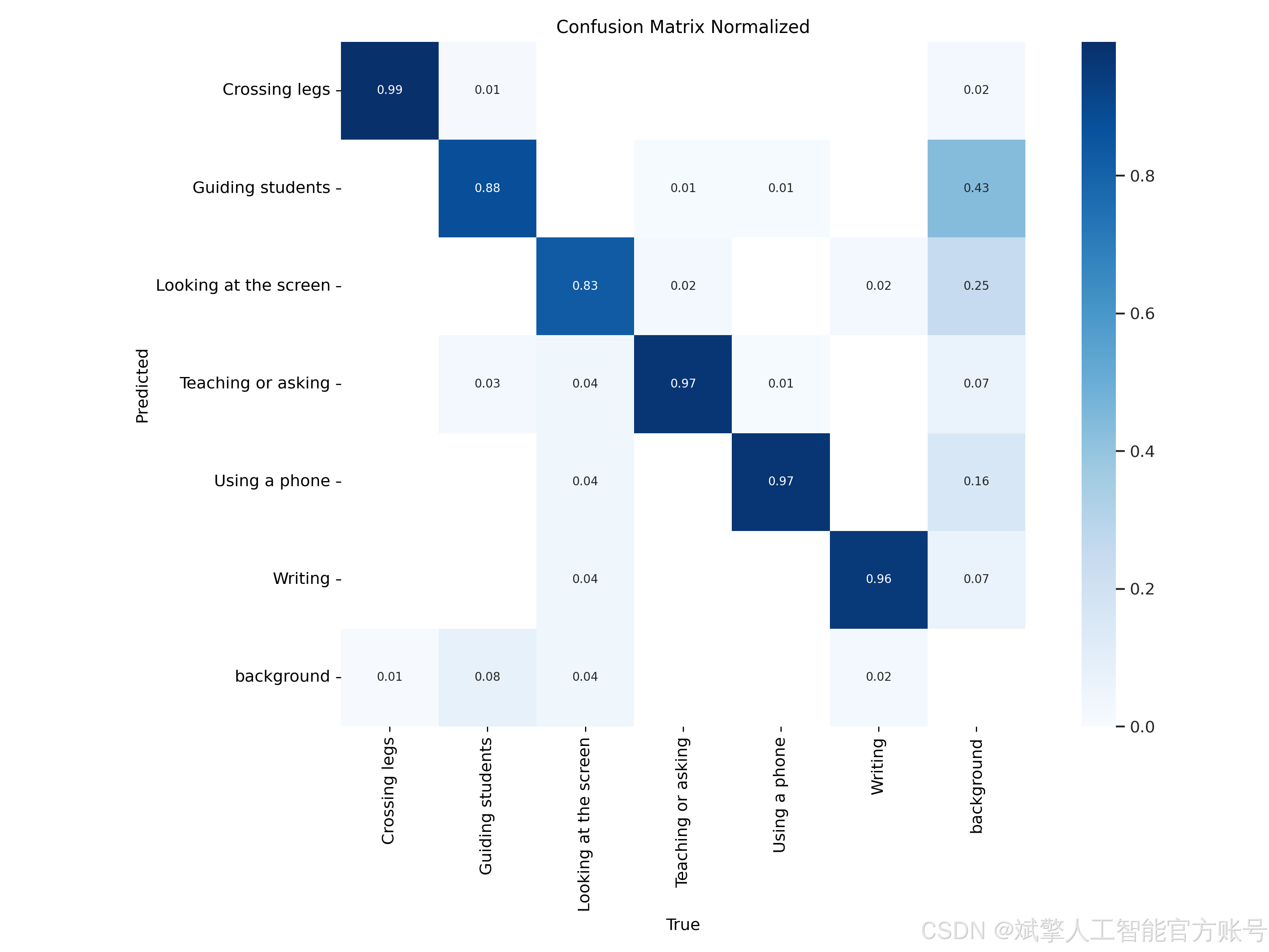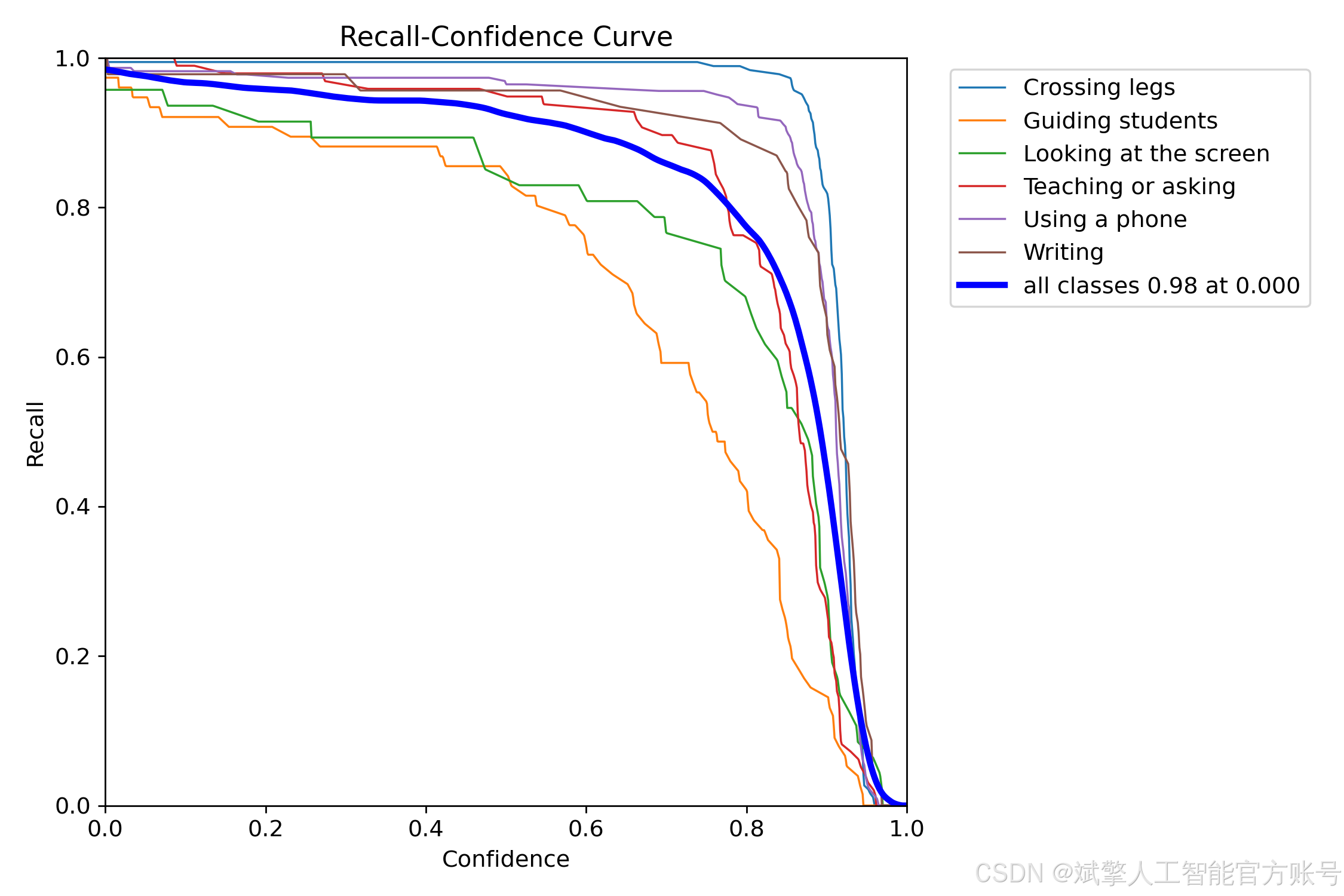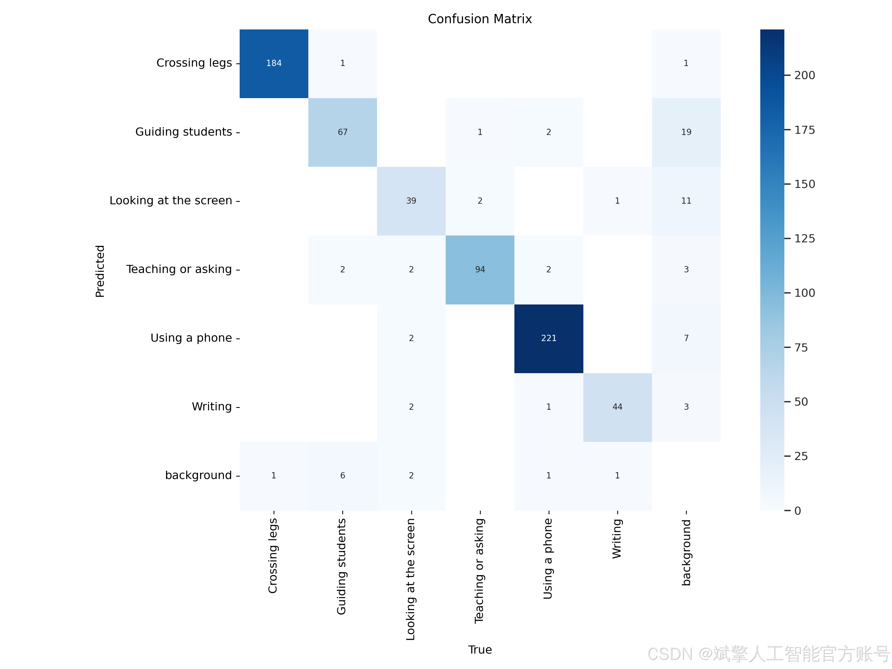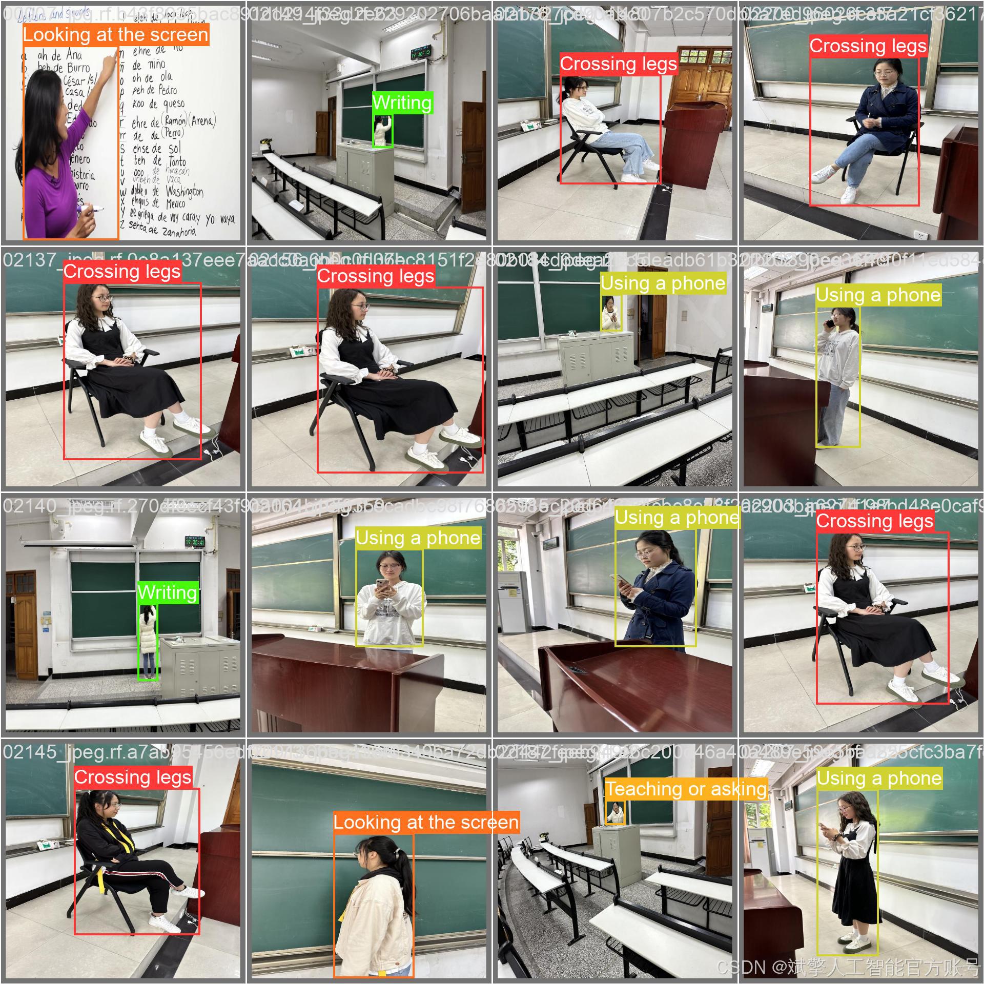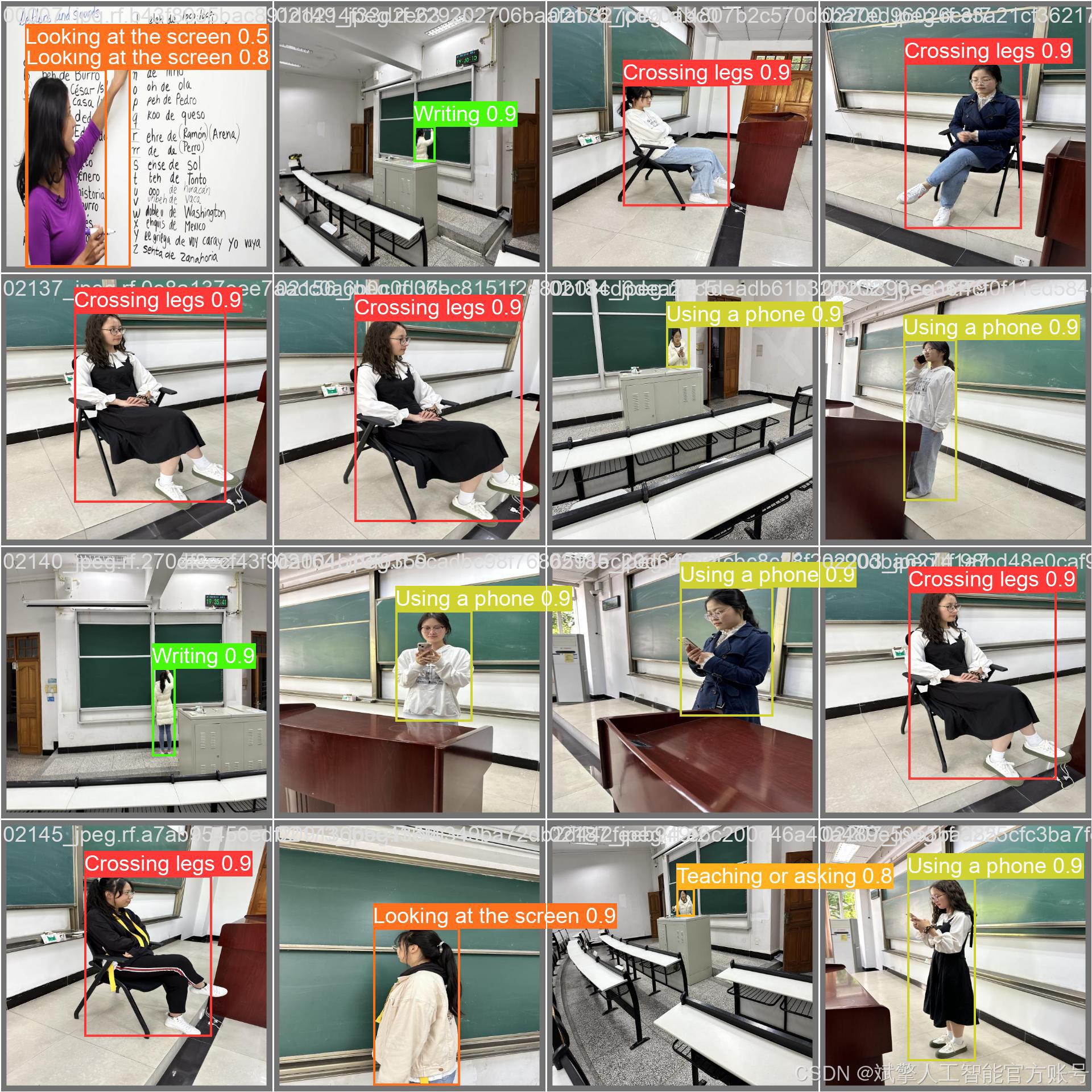 本项目基于YOLOv8目标检测算法开发了一套教师课堂行为识别系统,旨在自动识别并分析教学环境中的教师典型行为。系统共检测6类行为:'翘腿(Crossing legs)'、'指导学生(Guiding students)'、'看屏幕(Looking at the screen)'、'讲授或提问(Teaching or asking)'、'使用手机(Using a phone)' 及 '书写(Writing)'。通过端到端的深度学习模型,可实现对教师动作的实时检测与分类,适用于课堂教学质量评估、教师行为规范分析等教育数字化场景,为教育智能化提供技术支撑。