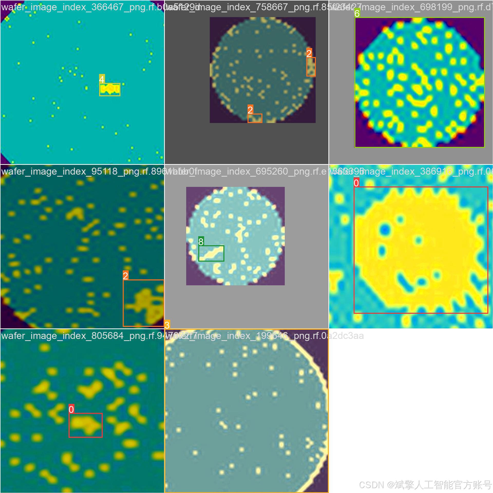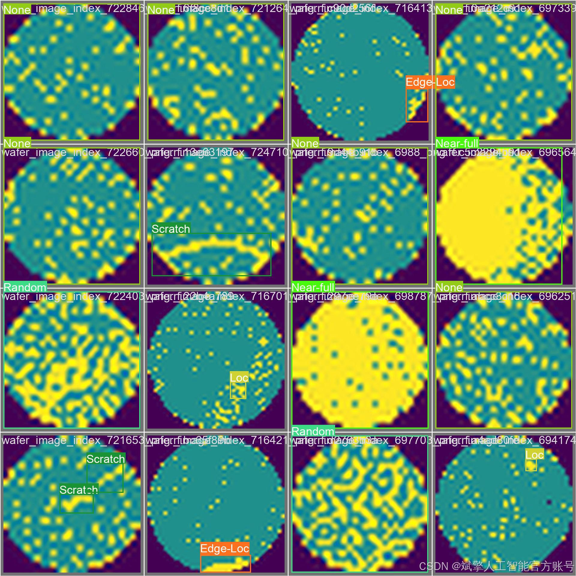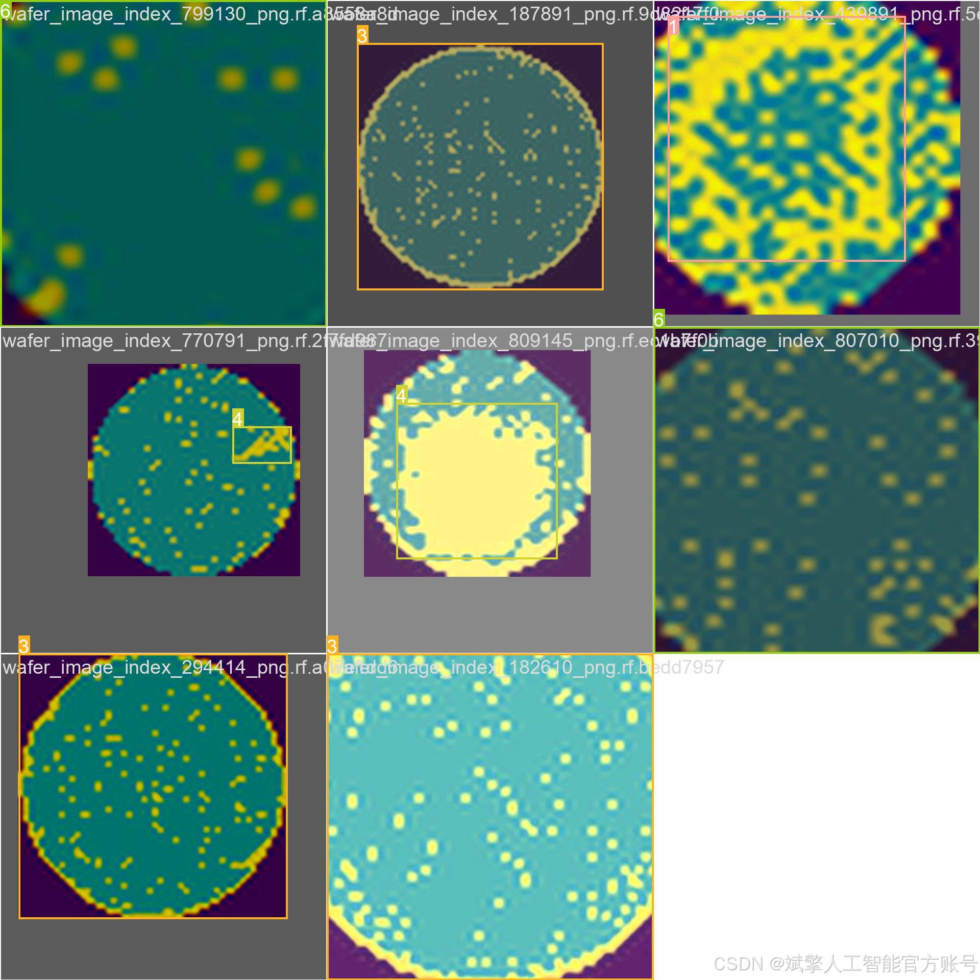 数据集的标注工作精细且目标明确,专注于晶圆制造过程中常见的九类缺陷(nc:9),每张图像中的缺陷均用边界框(Bounding Box)进行了精确标注。这九类缺陷涵盖了晶圆表面的典型异常模式,具体包括: