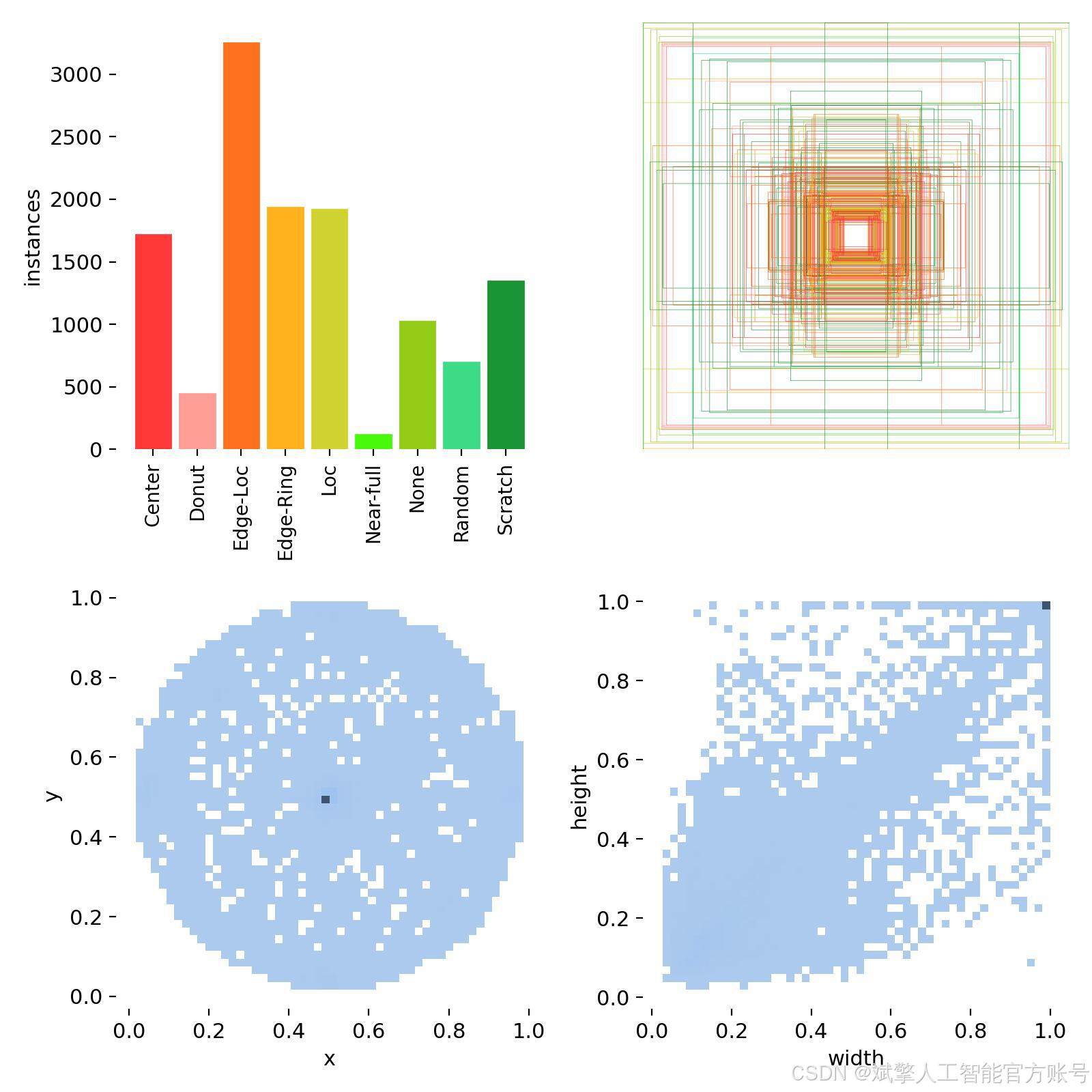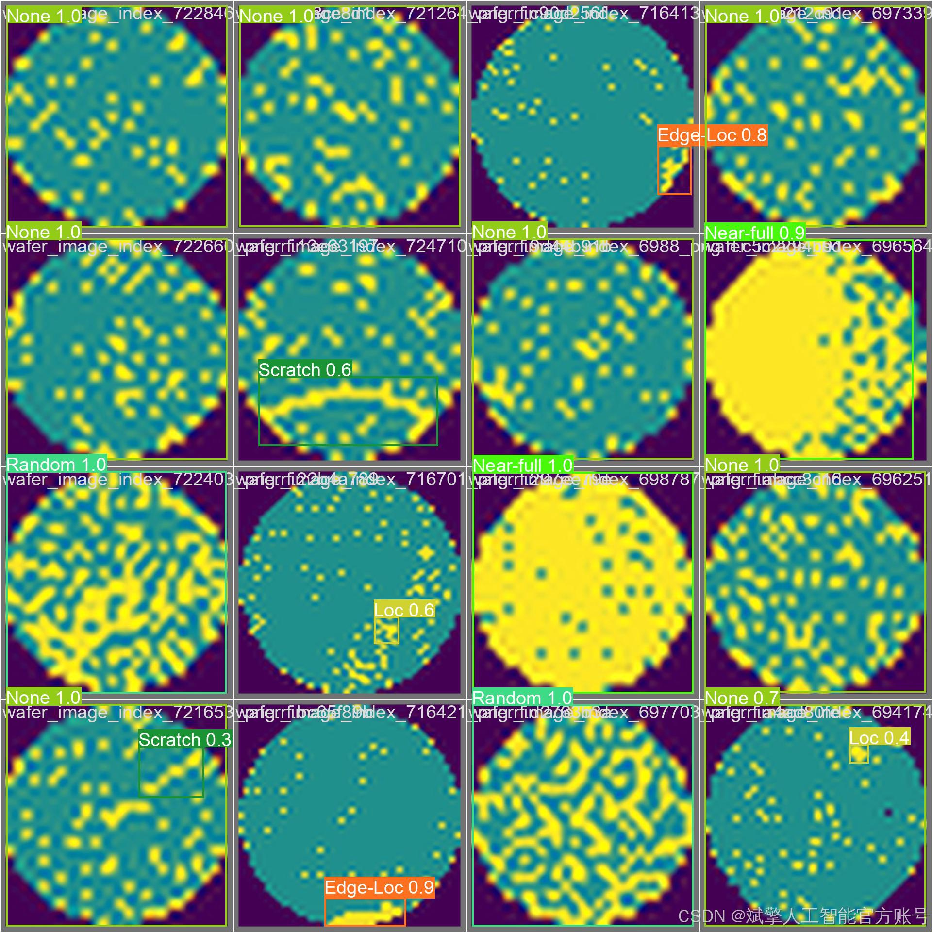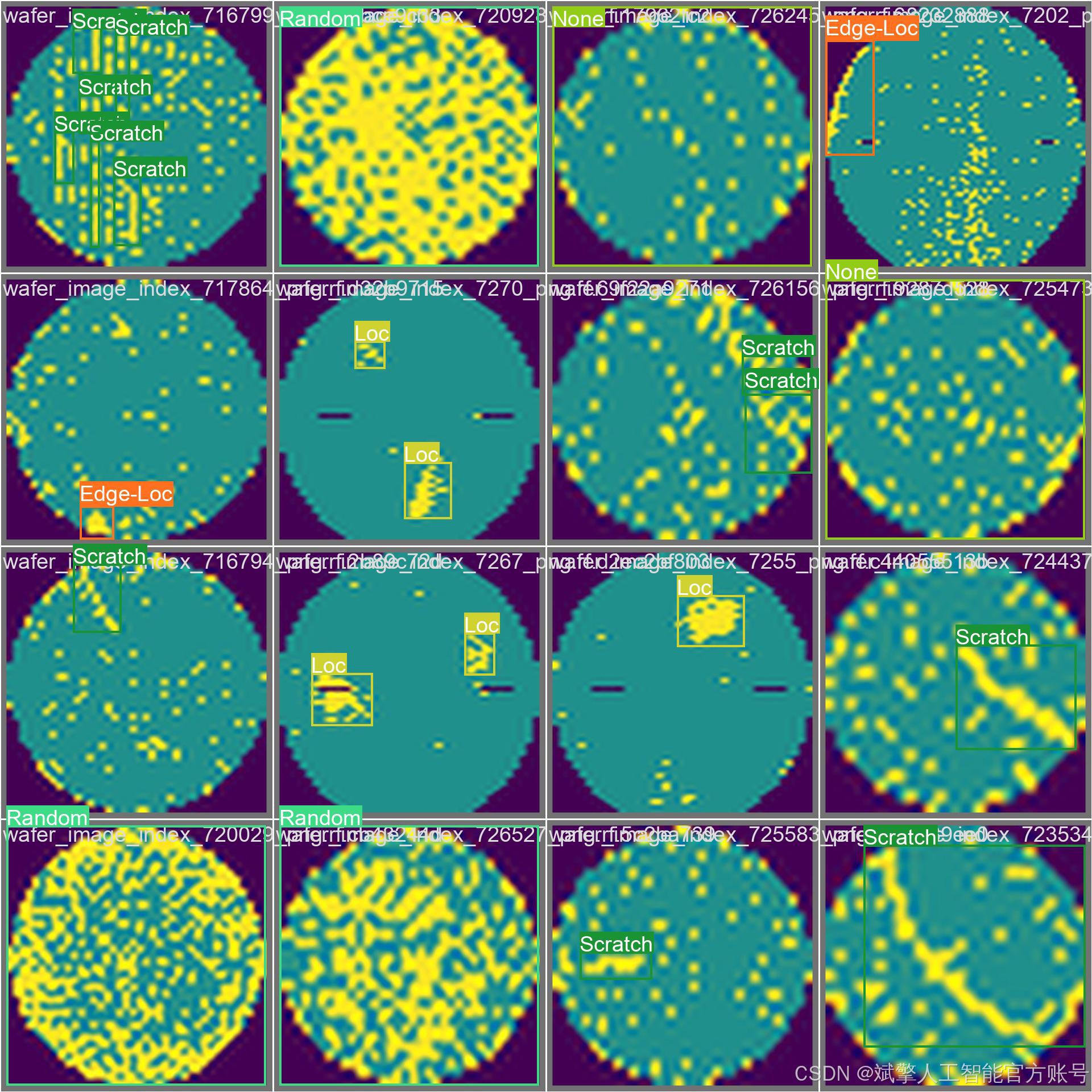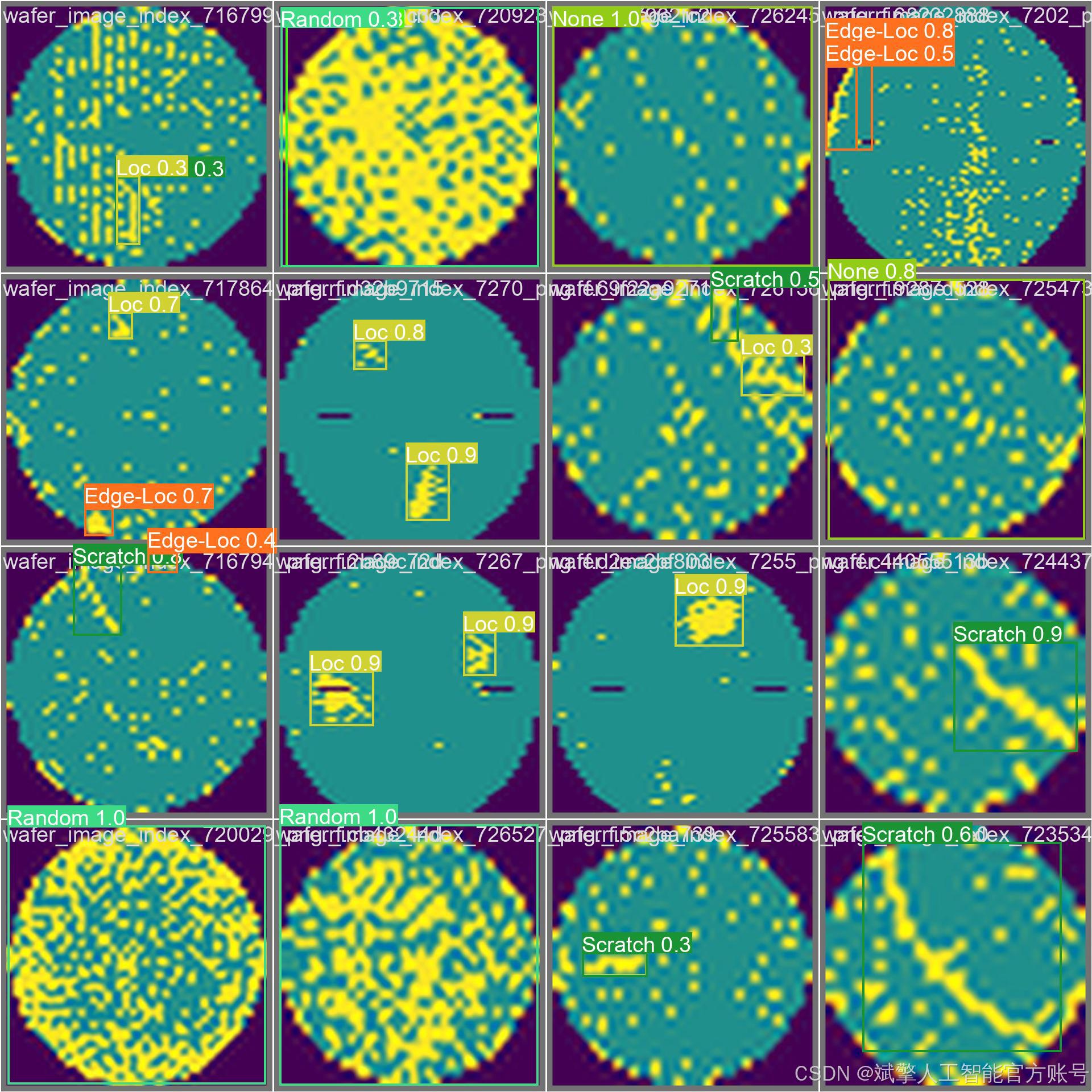 数据集的标注工作精细且目标明确,专注于晶圆制造过程中常见的九类缺陷(nc:9),每张图像中的缺陷均用边界框(Bounding Box)进行了精确标注。这九类缺陷涵盖了晶圆表面的典型异常模式,具体包括:
