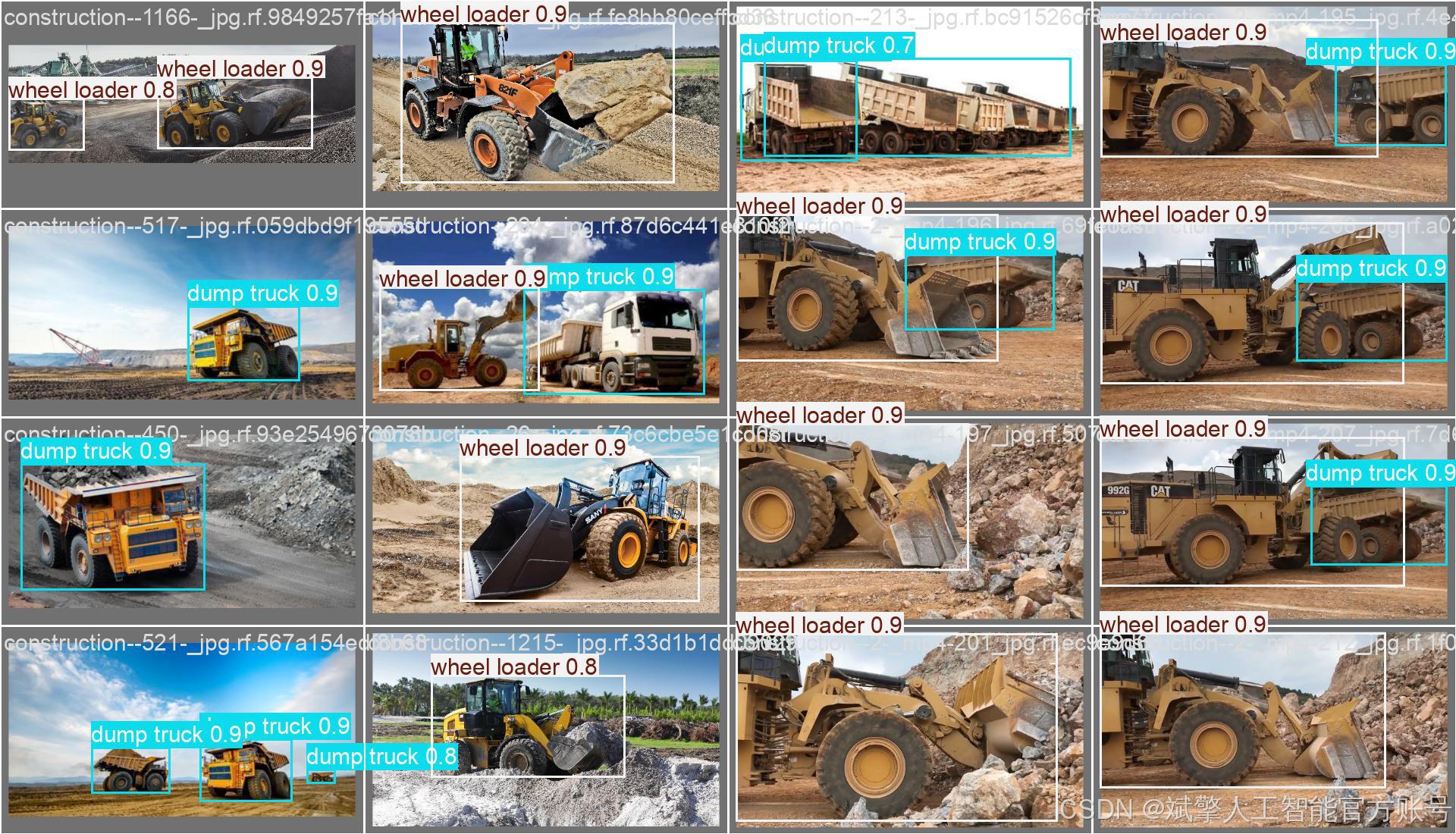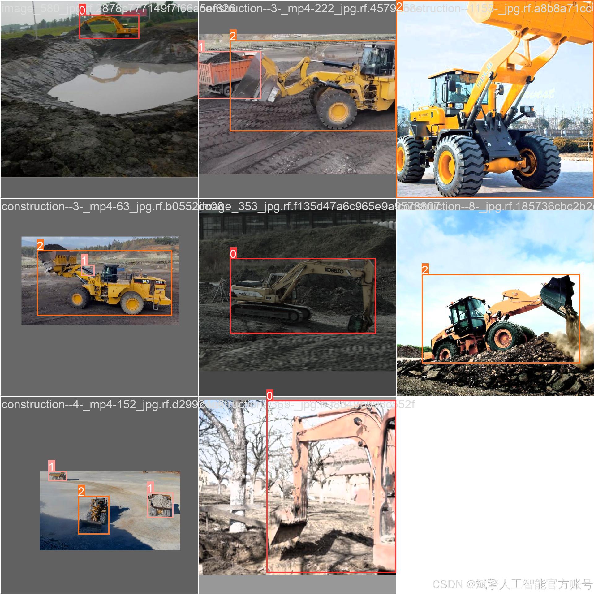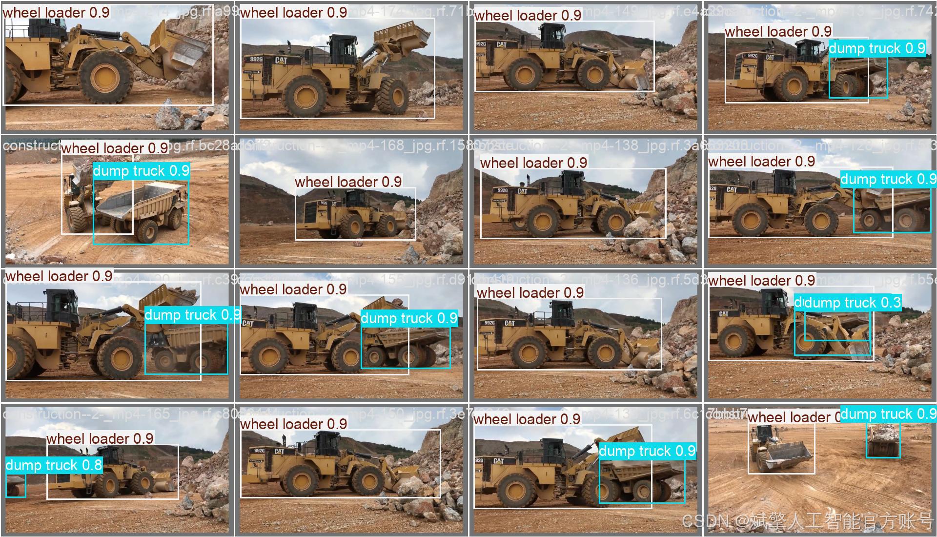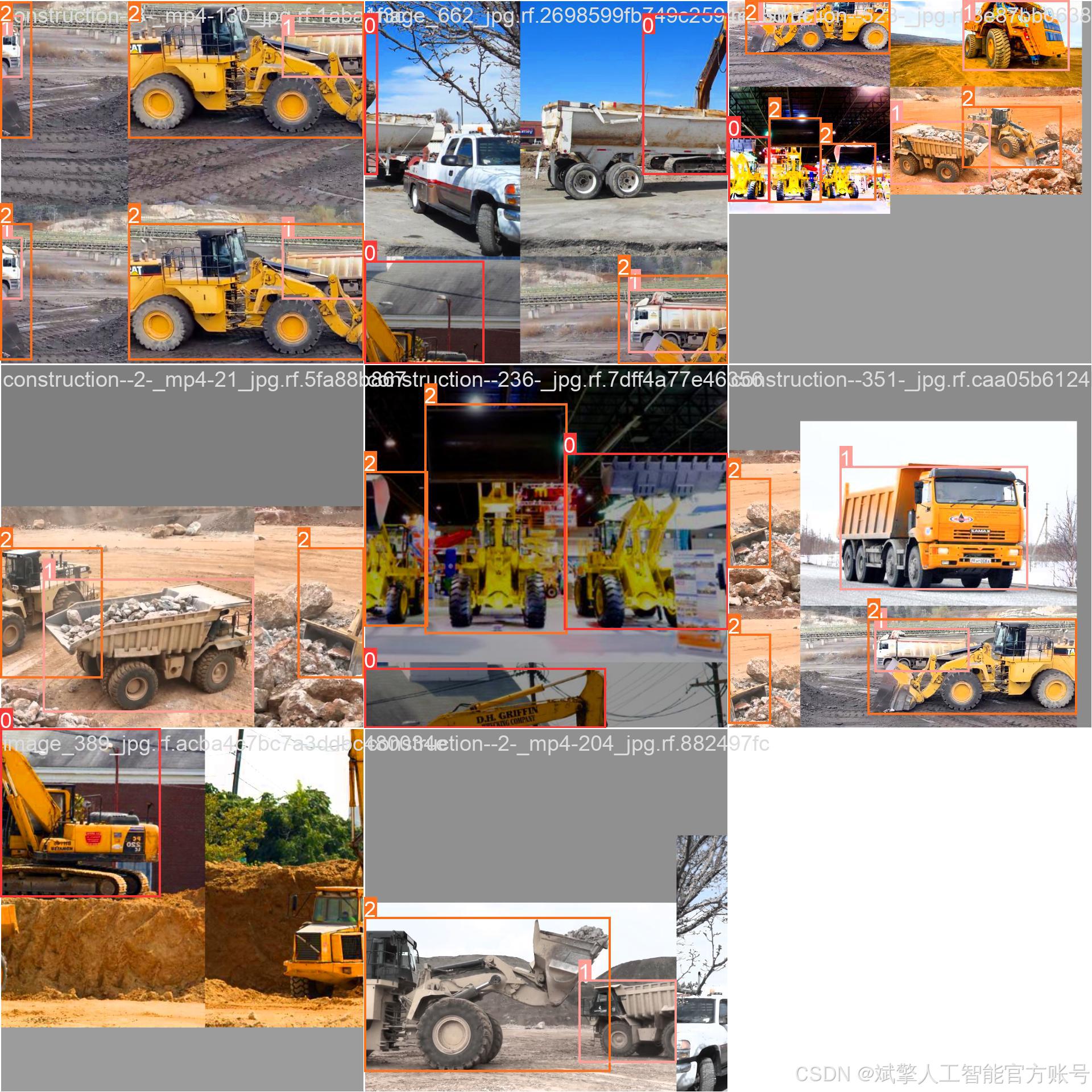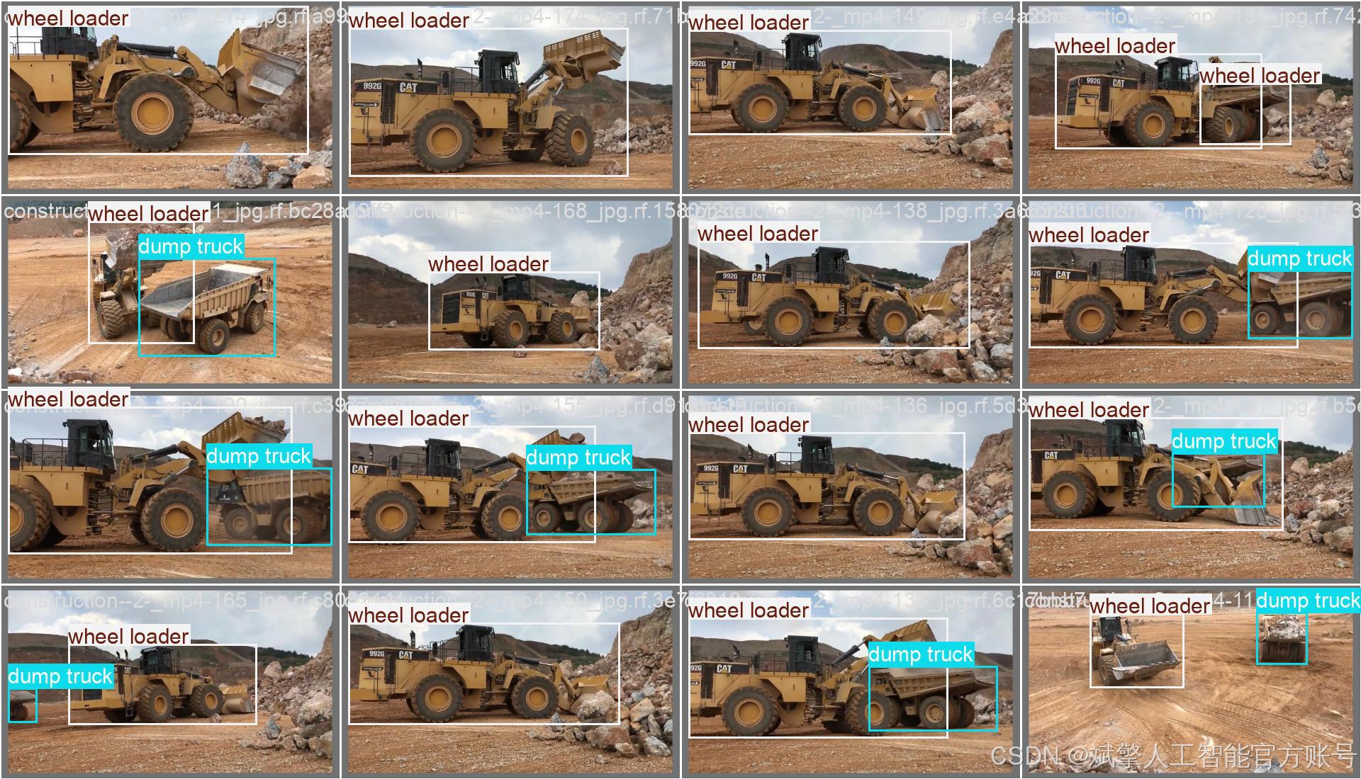 本系统采用自建的YOLO格式数据集,专门针对工地运输车辆进行标注,涵盖挖掘机(EXCAVATORS)、自卸卡车(dump truck)、轮式装载机(wheel loader)三类常见工程车辆。数据集经过严格筛选和标注,确保在不同光照、角度及复杂工地场景下的多样性,以提高模型的泛化能力。