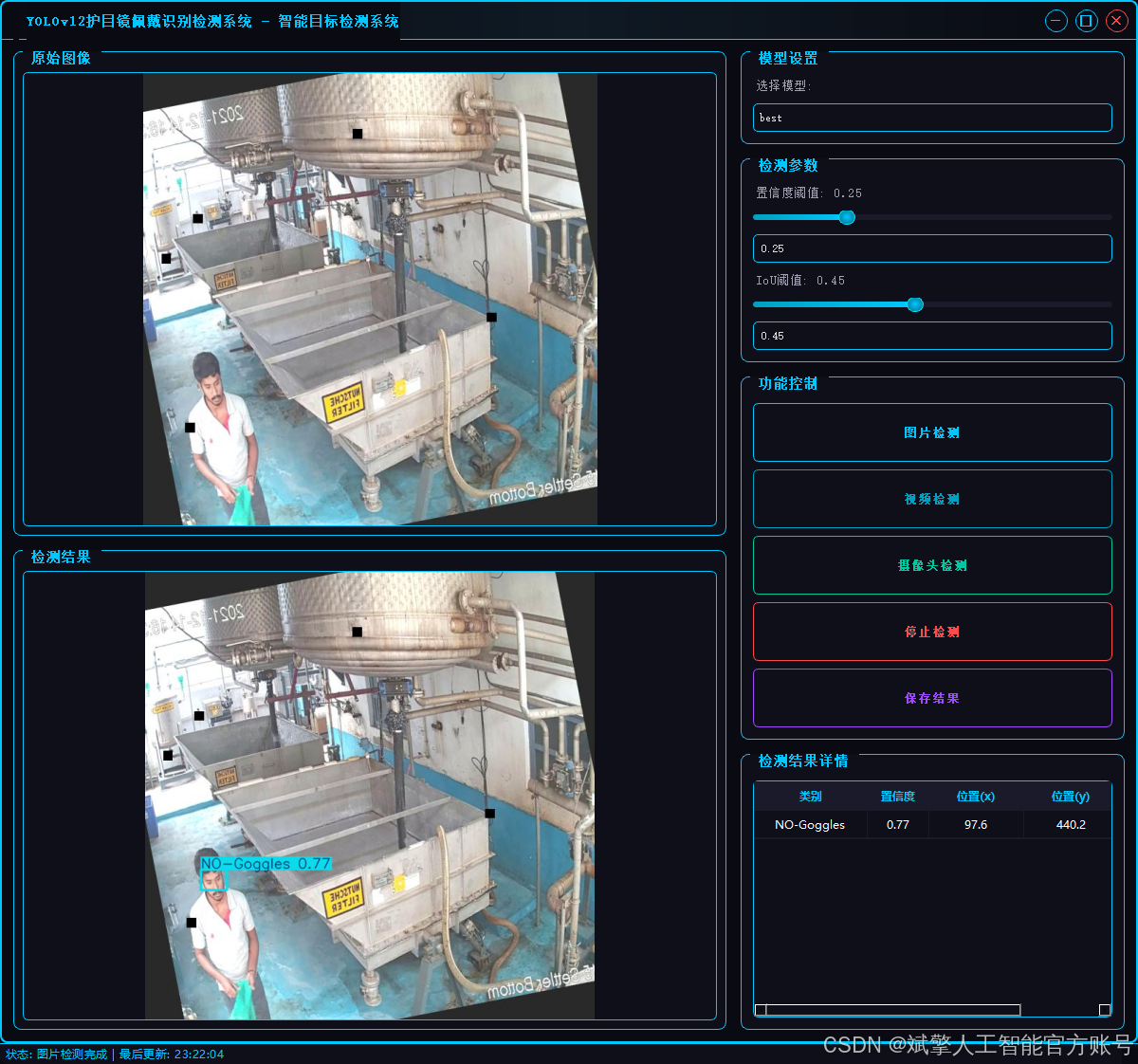 本文设计并实现了一种基于深度学习YOLOv12的护目镜佩戴识别检测系统,旨在通过计算机视觉技术自动检测作业人员是否规范佩戴护目镜,从而提升安全生产管理的智能化水平。系统采用改进的YOLOv12目标检测算法,结合包含15,083张图像的自定义数据集(训练集13,200张、验证集1,256张、测试集627张),实现了对"佩戴护目镜"(Goggles)和"未佩戴护目镜"(NO-Goggles)两类目标的高精度检测。此外,系统集成用户友好的UI界面,支持登录注册功能。实验表明,该系统在测试集上达到97.6%的mAP(mean Average Precision),具备实时性(45 FPS)与鲁棒性,可广泛应用于工厂、实验室等高风险场所的安全监管。