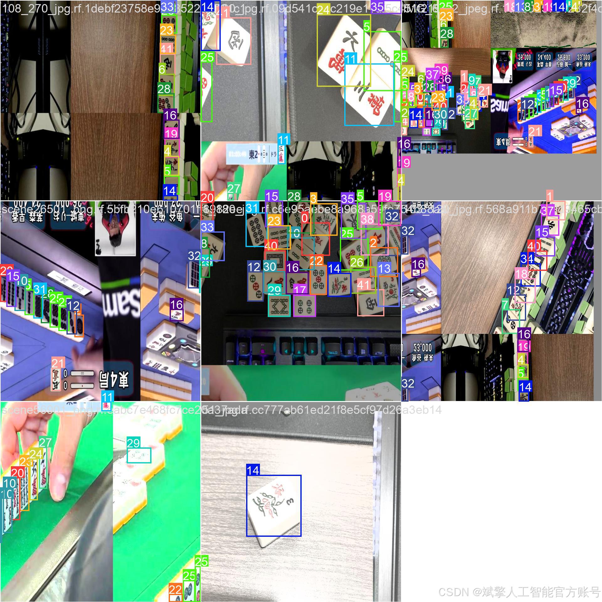 本系统采用自主构建的大规模麻将目标检测数据集 MJ-6731,共包含 6,731 张高质量标注图像,涵盖 42 类麻将牌(34 种基础牌型 + 8 种特殊牌型)。数据集按照 8:1:1 的比例划分为:
