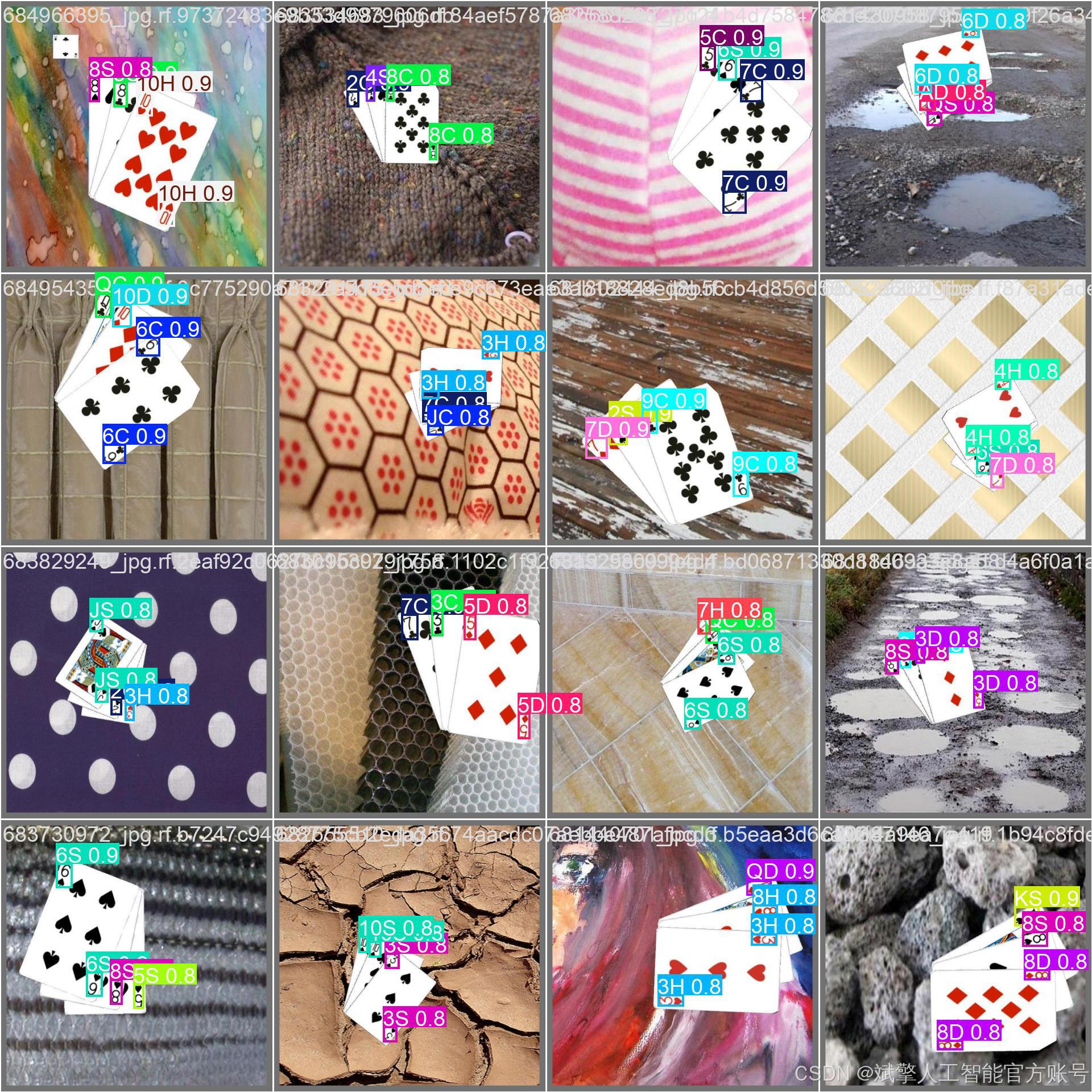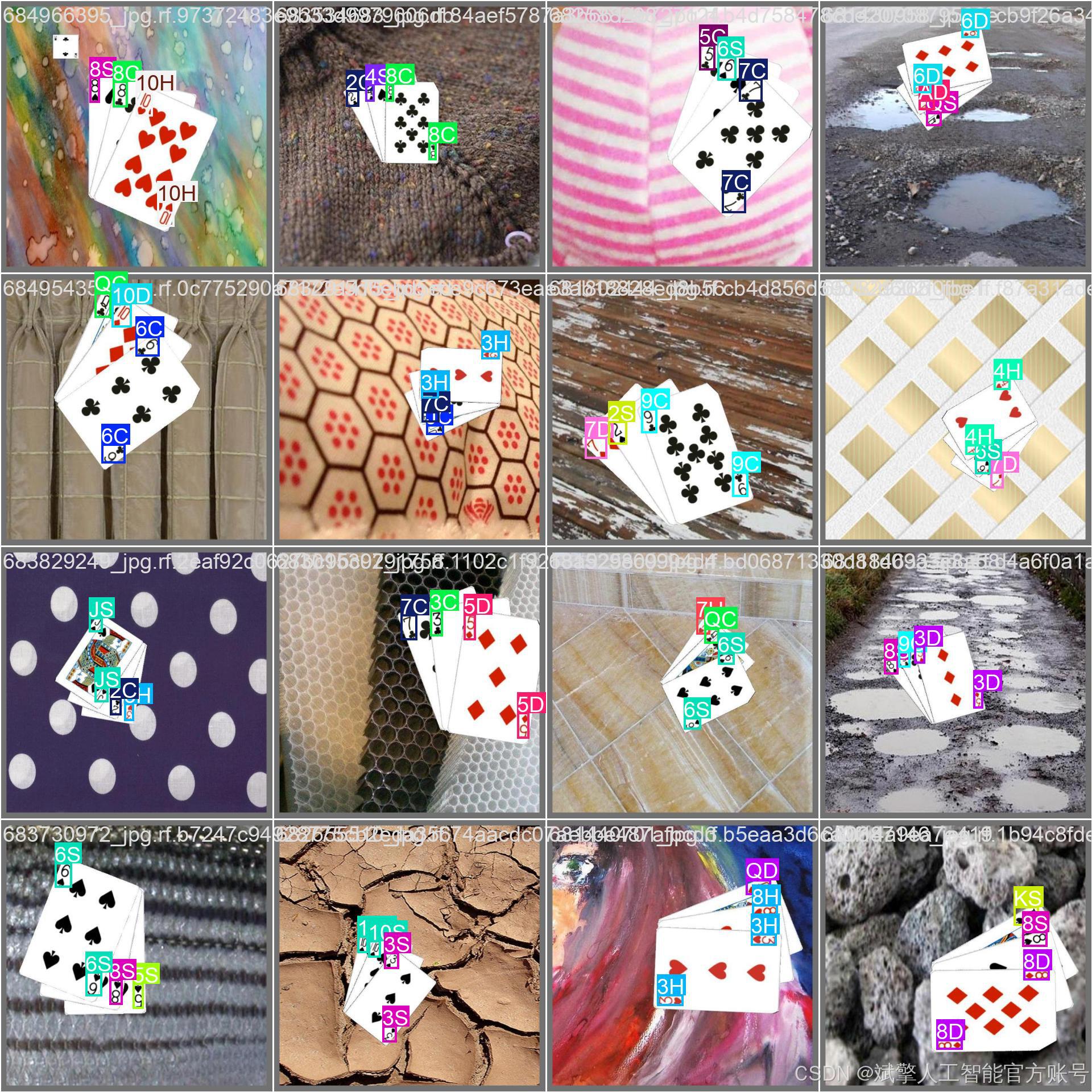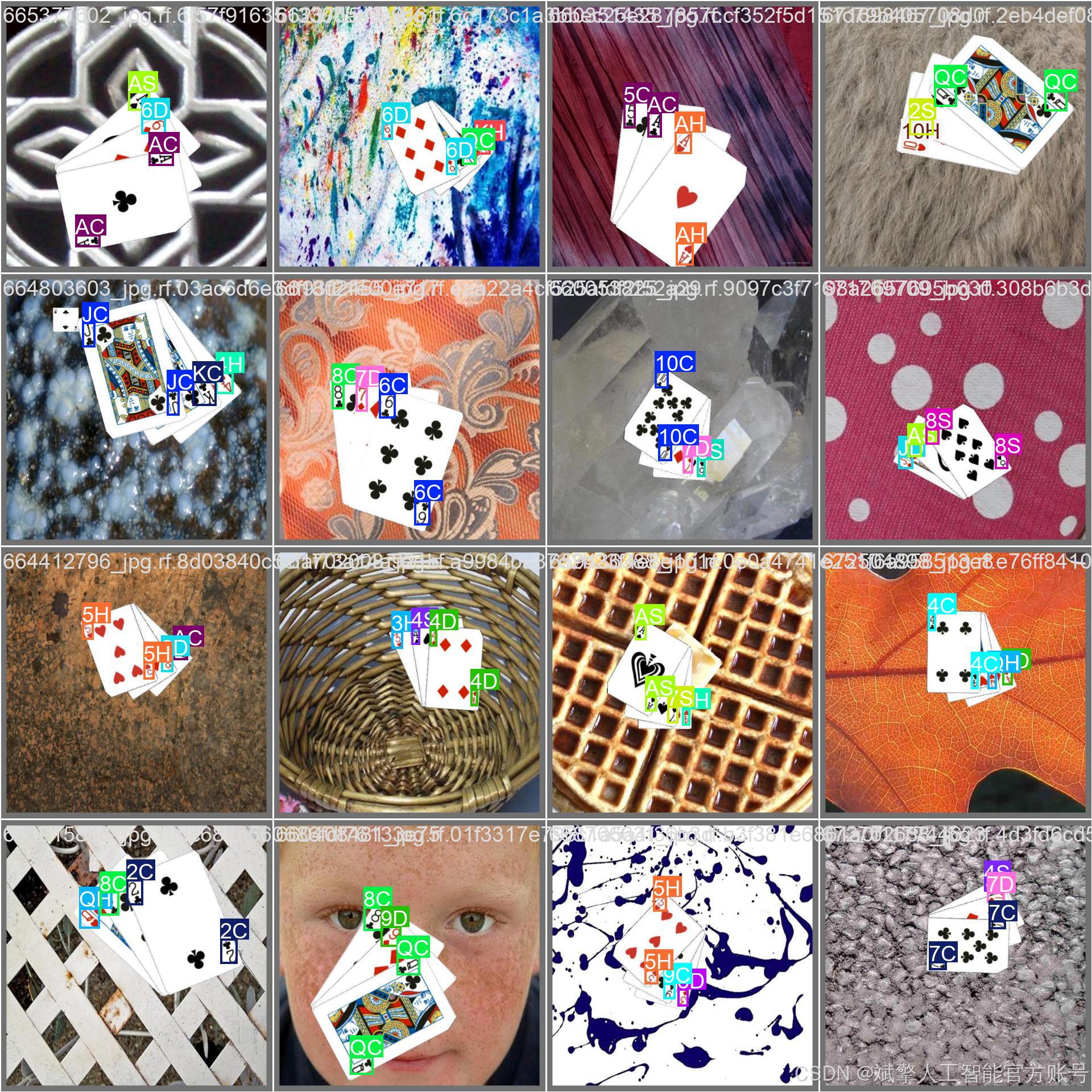 本扑克牌检测系统采用YOLO格式的自定义数据集,包含52种常见扑克牌类别(如10C、AD、QH等),涵盖数字牌(2-10)和花牌(A、J、Q、K)的四种花色(Clubs♣、Diamonds♦、Hearts♥、Spades♠)。数据集共24,233张图像,划分为: