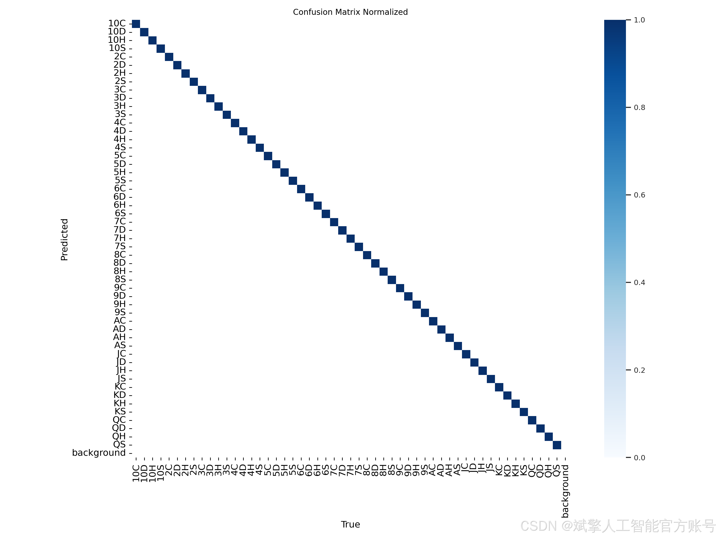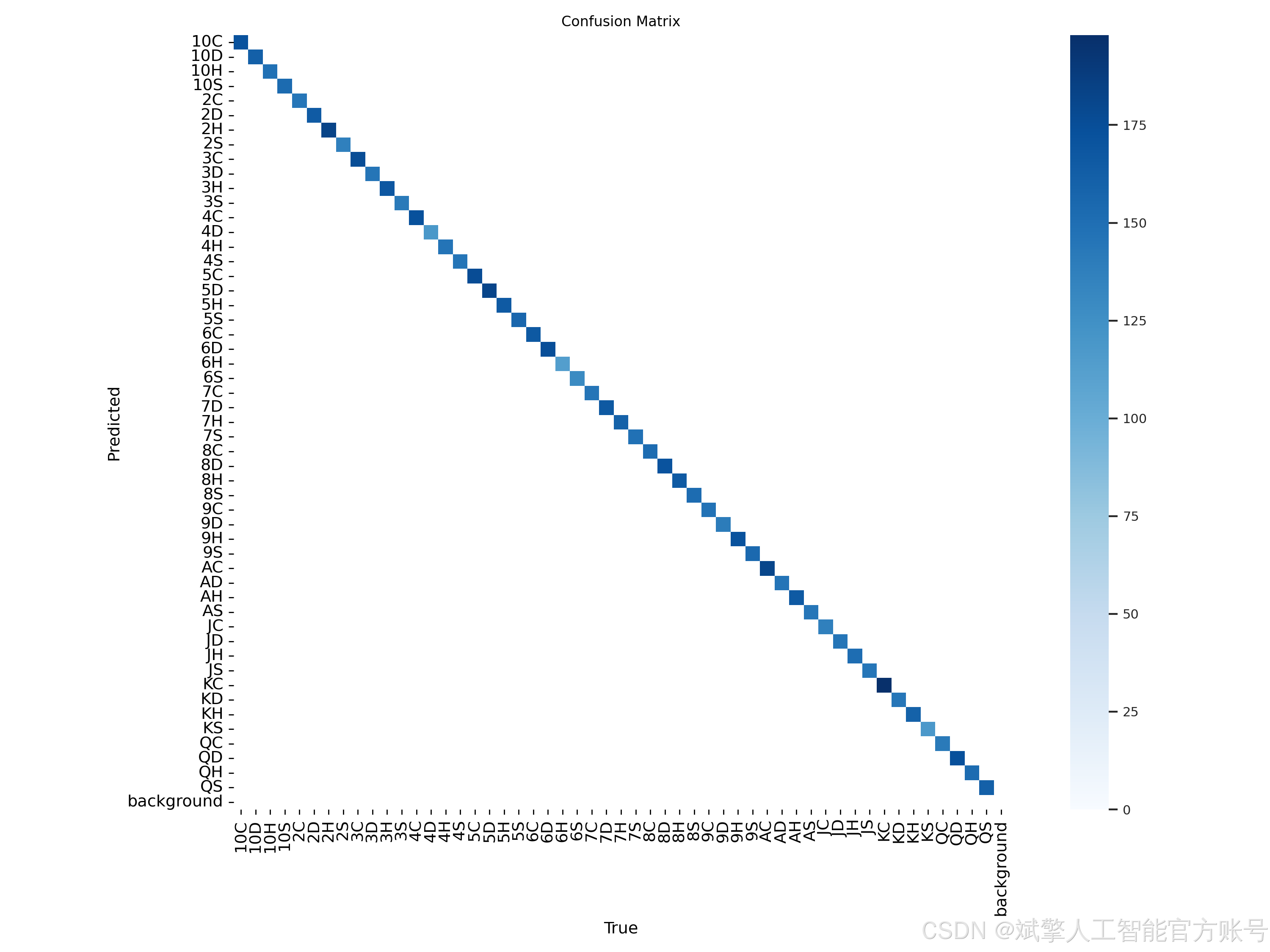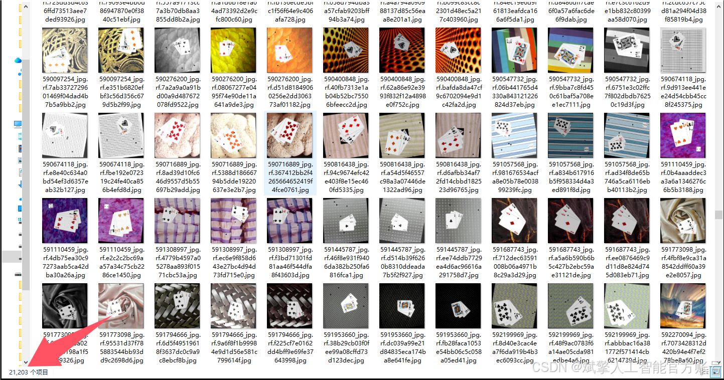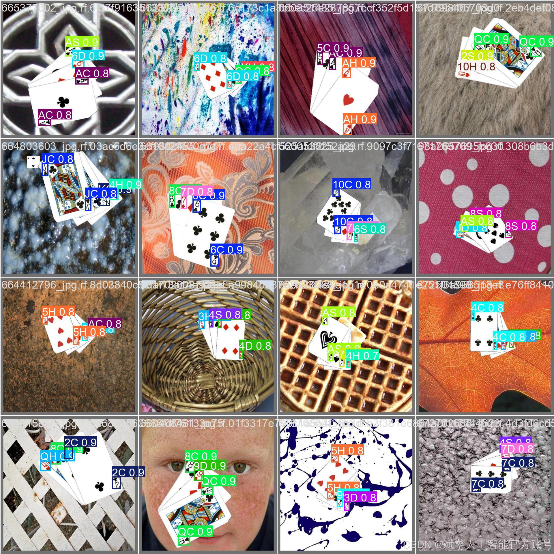 本扑克牌检测系统采用YOLO格式的自定义数据集,包含52种常见扑克牌类别(如10C、AD、QH等),涵盖数字牌(2-10)和花牌(A、J、Q、K)的四种花色(Clubs♣、Diamonds♦、Hearts♥、Spades♠)。数据集共24,233张图像,划分为: