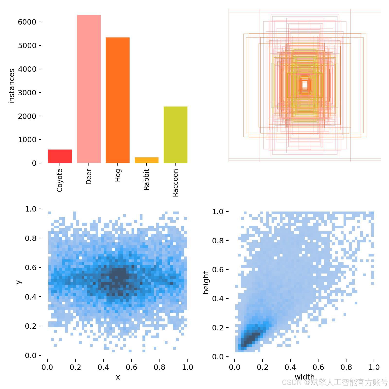本系统所使用的野生动物检测数据集采用YOLO格式标注,包含5类常见野生动物:郊狼(Coyote)、鹿(Deer)、野猪(Hog)、兔子(Rabbit)和浣熊(Raccoon)。数据集共包含12,129张图像,按照训练集(10,665张)、验证集(928张)、测试集(536张)进行划分,确保模型训练、调优和评估的可靠性。