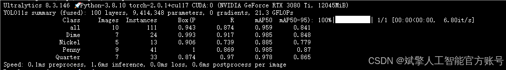 --batch 8:每批次8张图像。--epochs 100:训练100轮。--datasets/data.yaml:数据集配置文件。--weights yolov11s.pt:初始化模型权重,yolov11s.pt是预训练的轻量级YOLO模型。