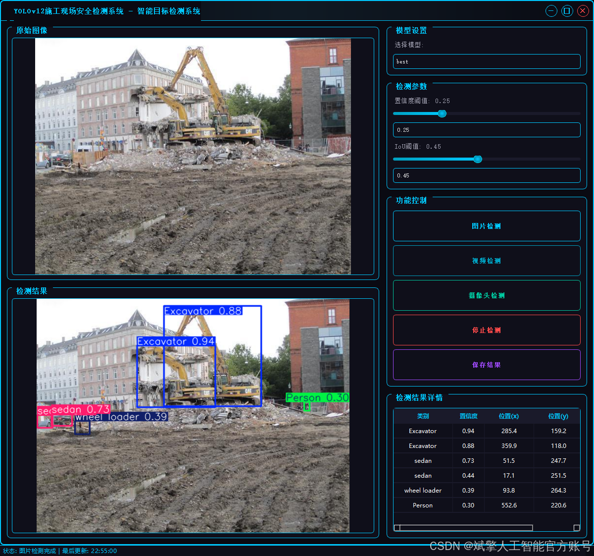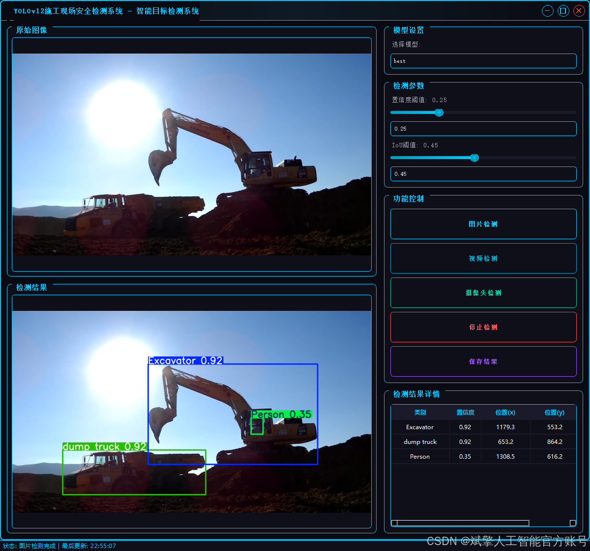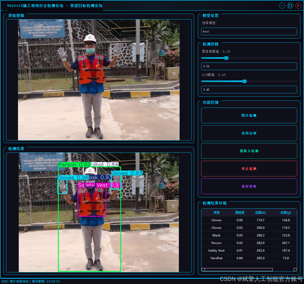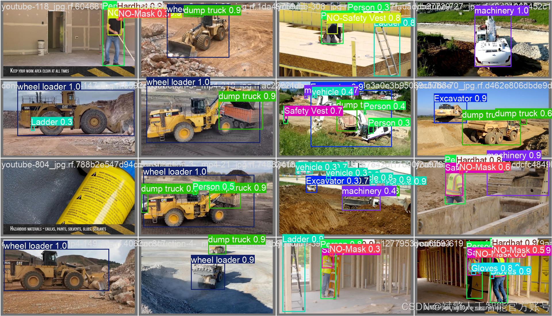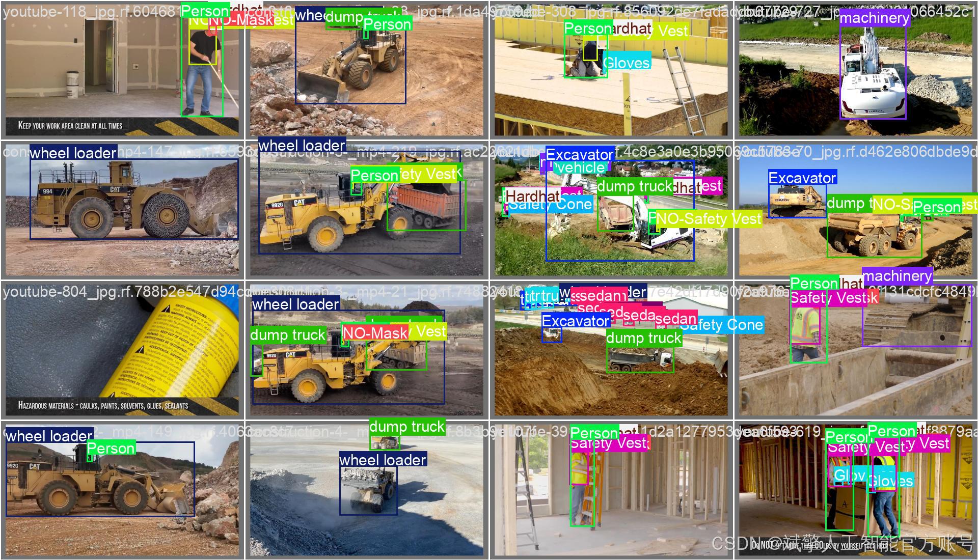 施工现场安全管理是保障工人生命安全和工程顺利进行的重要环节。针对传统人工巡检效率低、实时性差的问题,本文基于YOLOv12深度学习算法,设计并实现了一套施工现场安全检测系统。该系统能够实时检测施工现场中的25类目标(如工程车辆、安全装备、人员等),并识别违规行为(如未佩戴安全帽、口罩等)。