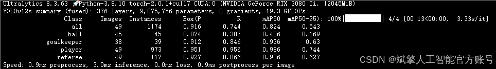 --batch 8:每批次8张图像。--epochs 100:训练100轮。--datasets/data.yaml:数据集配置文件。--weights yolov12s.pt:初始化模型权重,yolov12s.pt是预训练的轻量级YOLO模型。