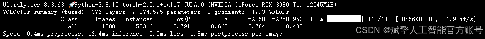 --batch 8:每批次8张图像。--epochs 100:训练100轮。--datasets/data.yaml:数据集配置文件。--weights yolov12s.pt:初始化模型权重,yolov12s.pt是预训练的轻量级YOLO模型。