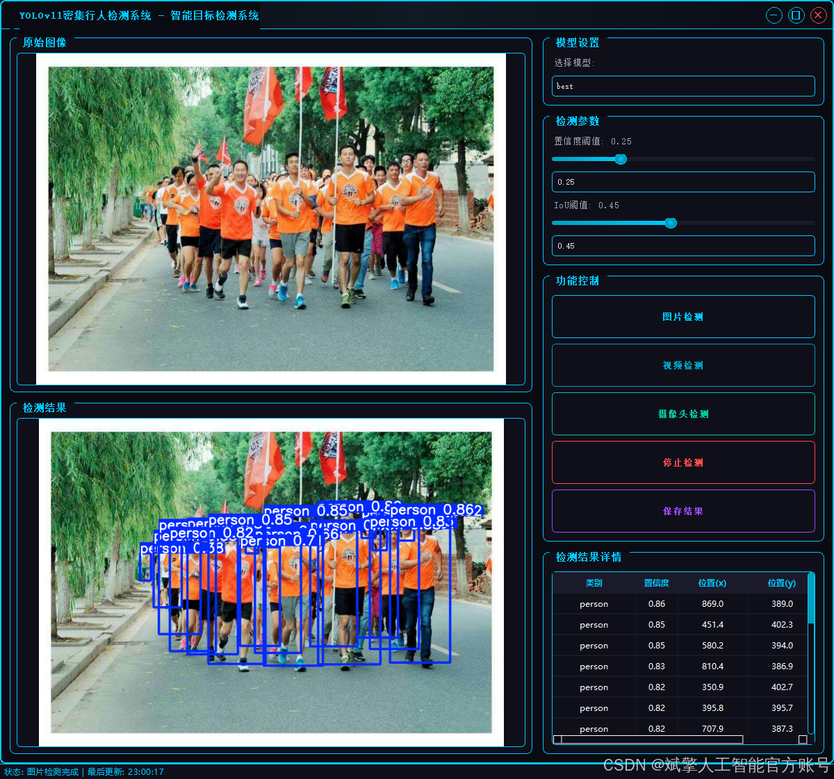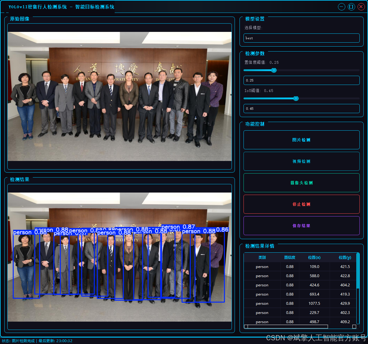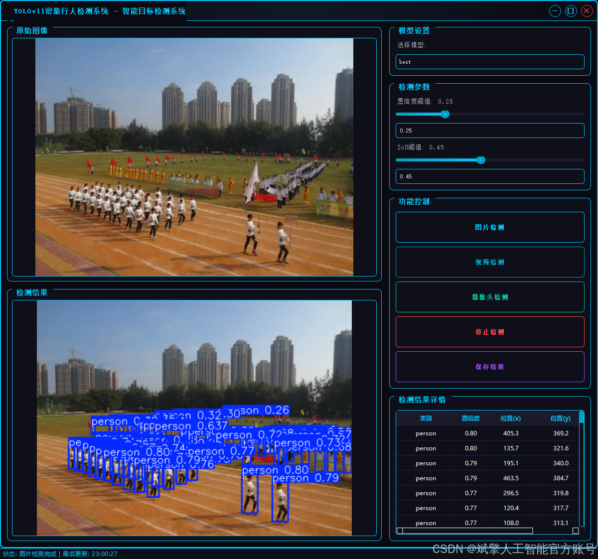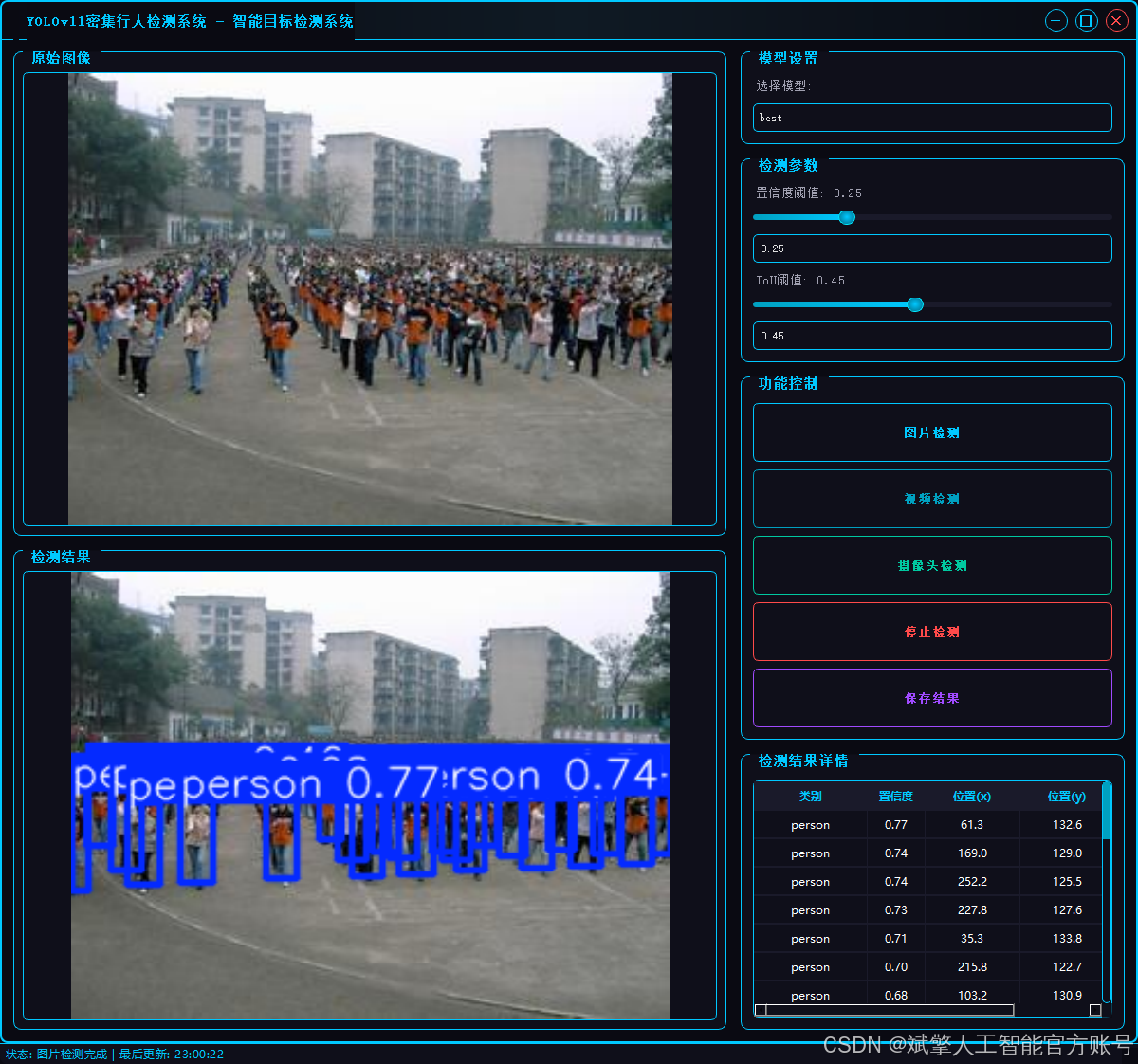 随着计算机视觉技术的快速发展,行人检测在智能监控、自动驾驶、公共安全等领域具有广泛的应用价值。然而,密集场景下的行人检测仍面临目标遮挡、尺度变化和背景干扰等挑战。YOLO系列算法因其高效的检测速度和良好的精度,成为目标检测领域的主流方法之一。本文基于YOLOv11模型,结合大规模YOLO数据集(训练集7200张、验证集1800张),构建了一套端到端的密集行人识别检测系统。